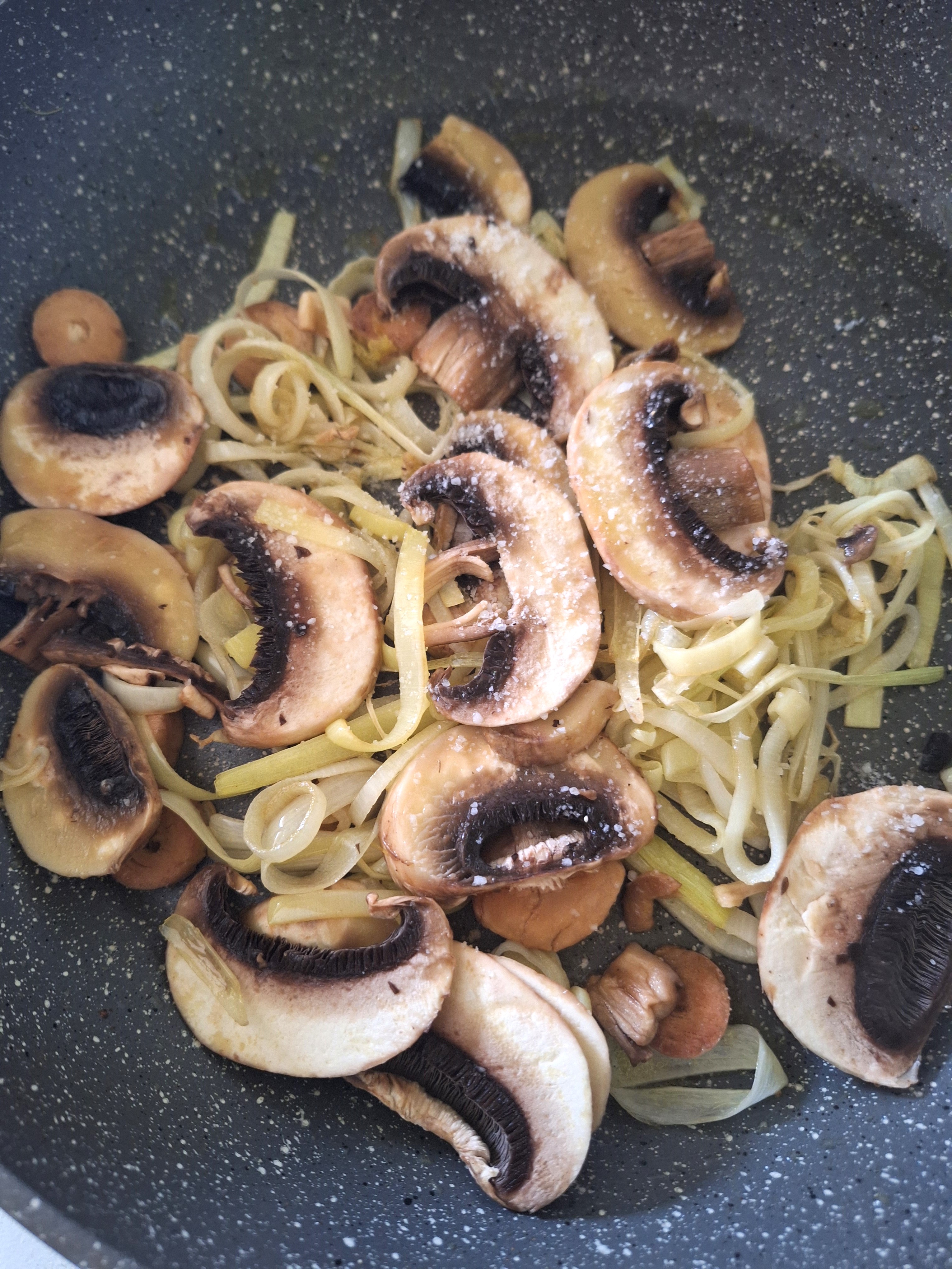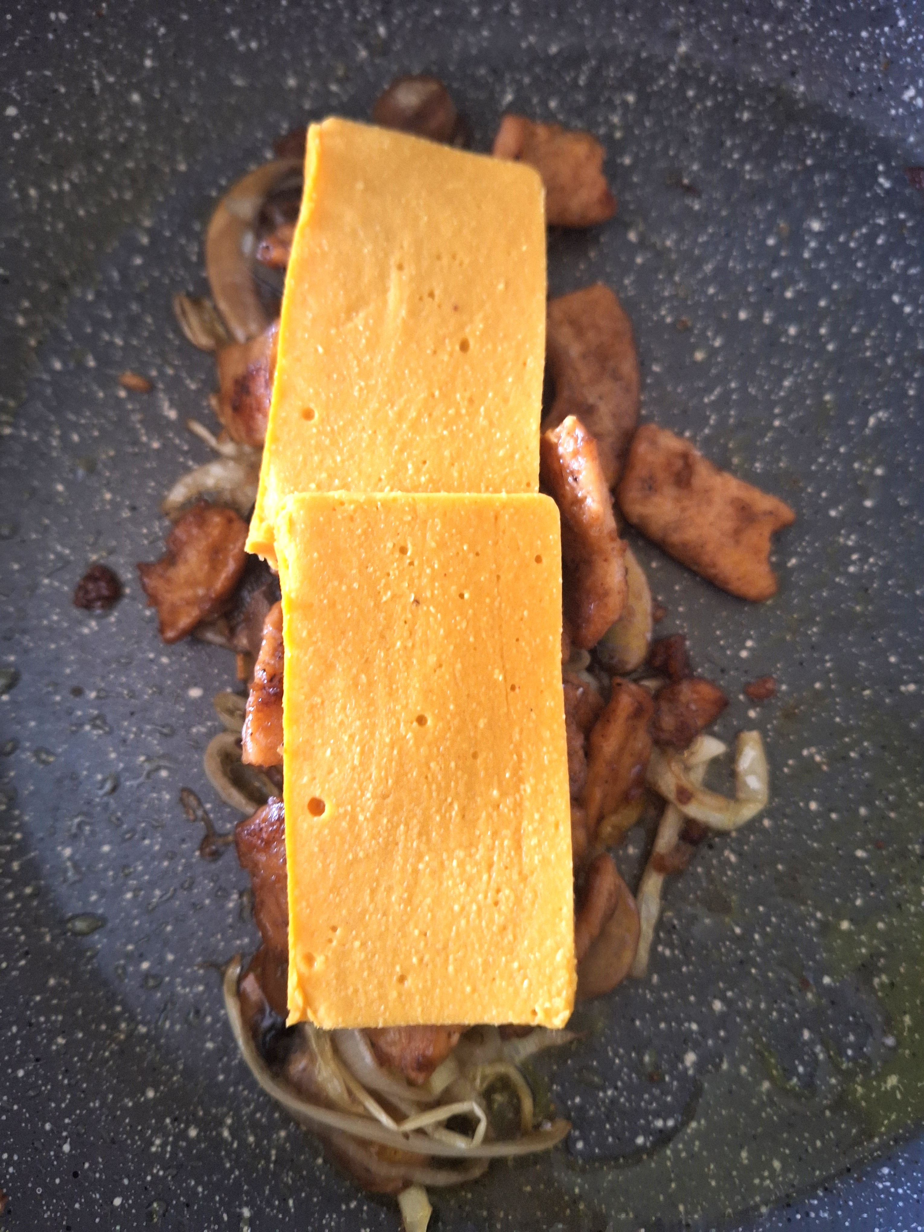 Corta la cebolla en juliana y pocha en un poco de aceite. Cuando empiece a transparentar agrega los champiñones limpios y cortados en láminas. Cocina unos minutos hasta que queden tiernos. Coloca las tiras vegetales sobre la cebolla y los champiñones y, sobre ellas, unas lonchas de Cheddar vegano. Coloca las tiras vegetales sobre la cebolla y los champiñones y, sobre ellas, unas lonchas de Cheddar vegano.