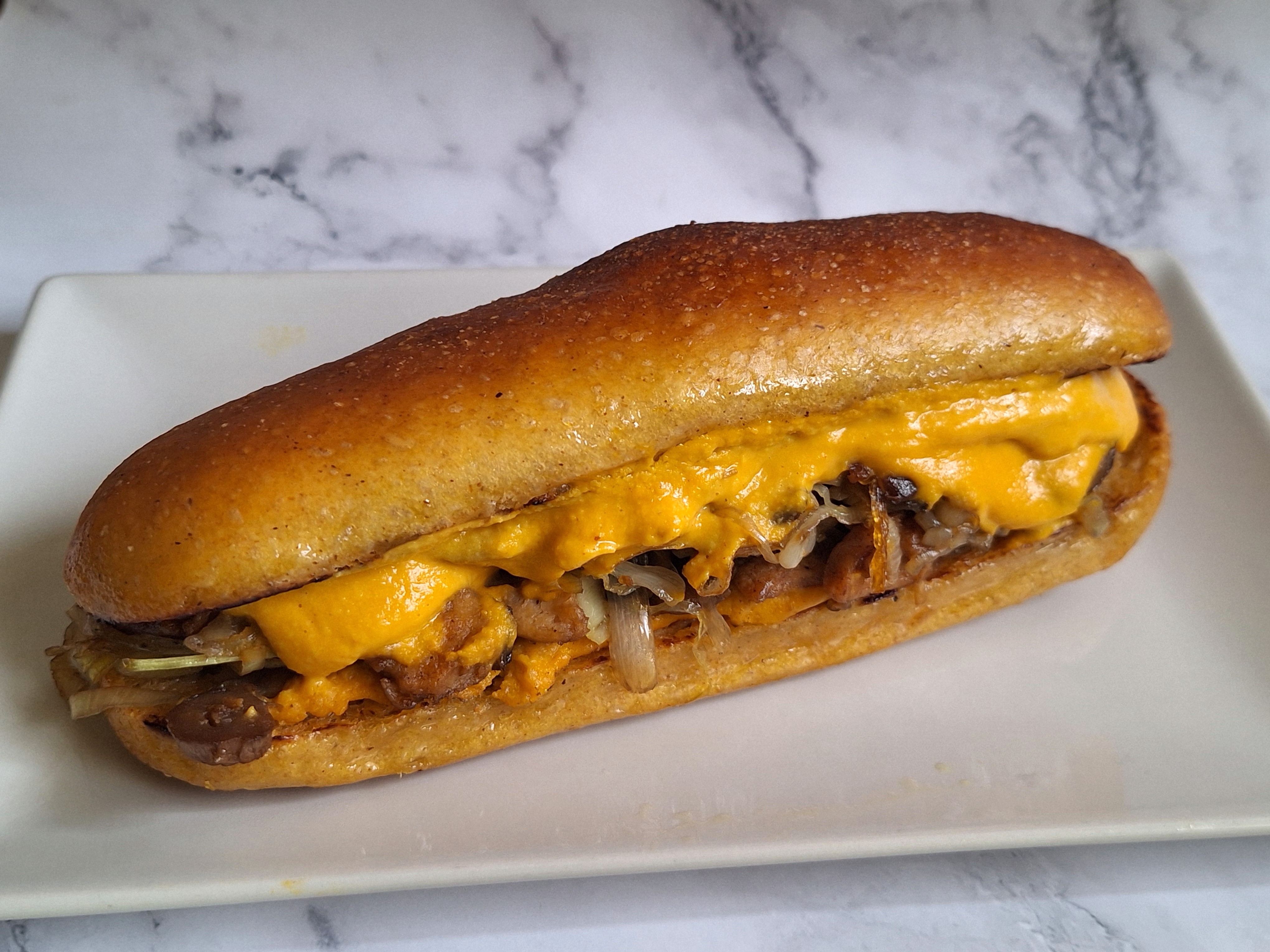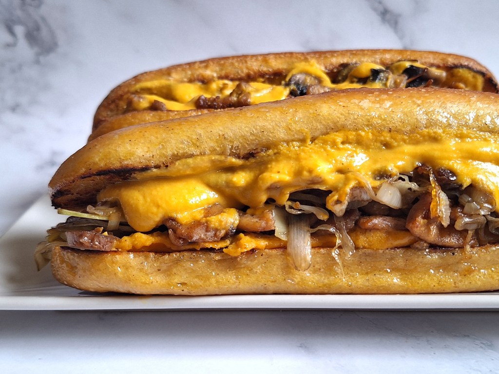 Para quienes no conozcáis esta receta (y,o hasta ahora, tampoco), se trata de un bocadillo típico de Philadelphia, creado en 1930, y que hoy en día es uno de los iconos de la comida callejera. Entre sus ingredientes básicos está el pan de hotdog (originariamente, ahora se puede utilizar cualquier pan blandito), queso Cheddar o Provolone y tiras de ternera. Cabe la opción de añadir pimiento verde o champiñones.