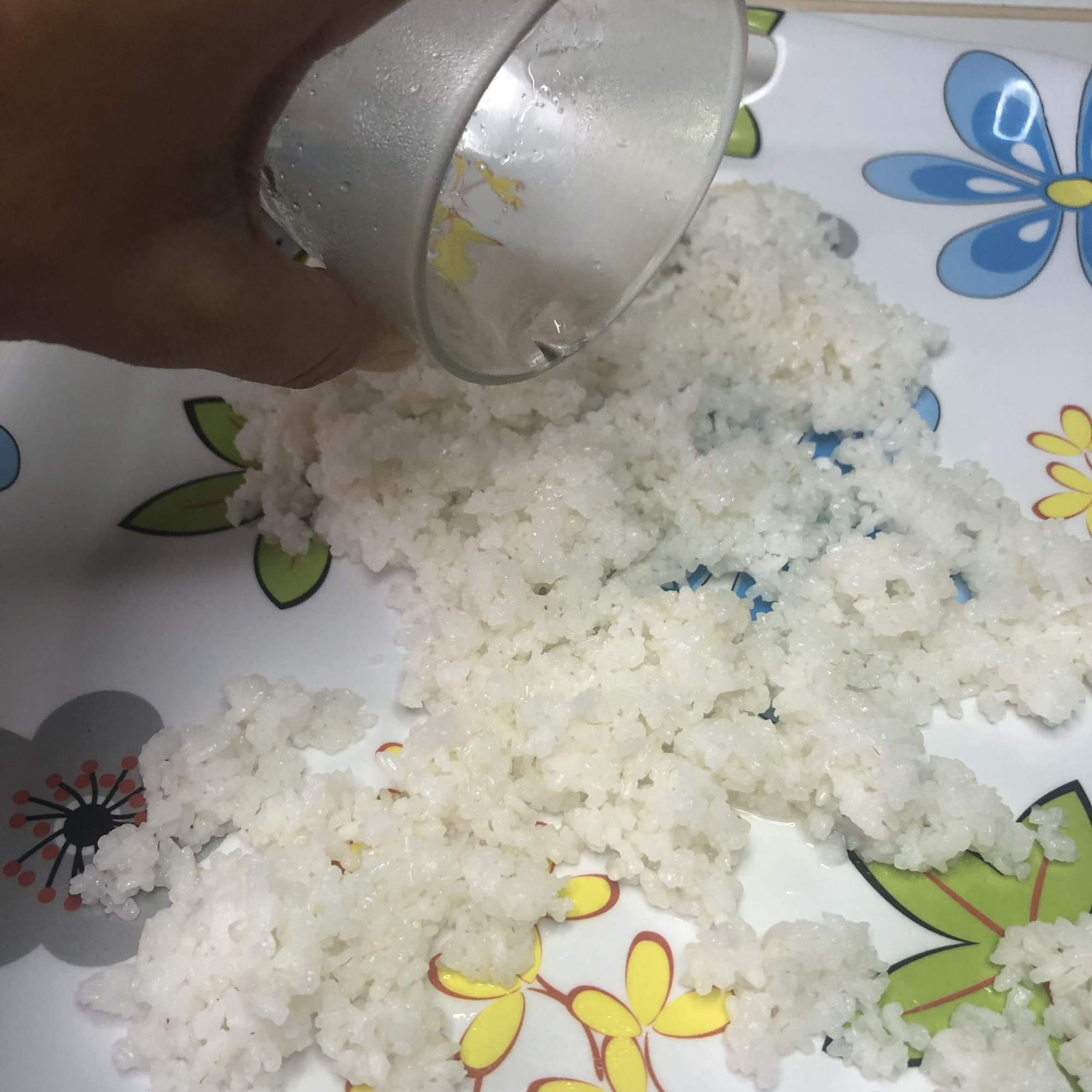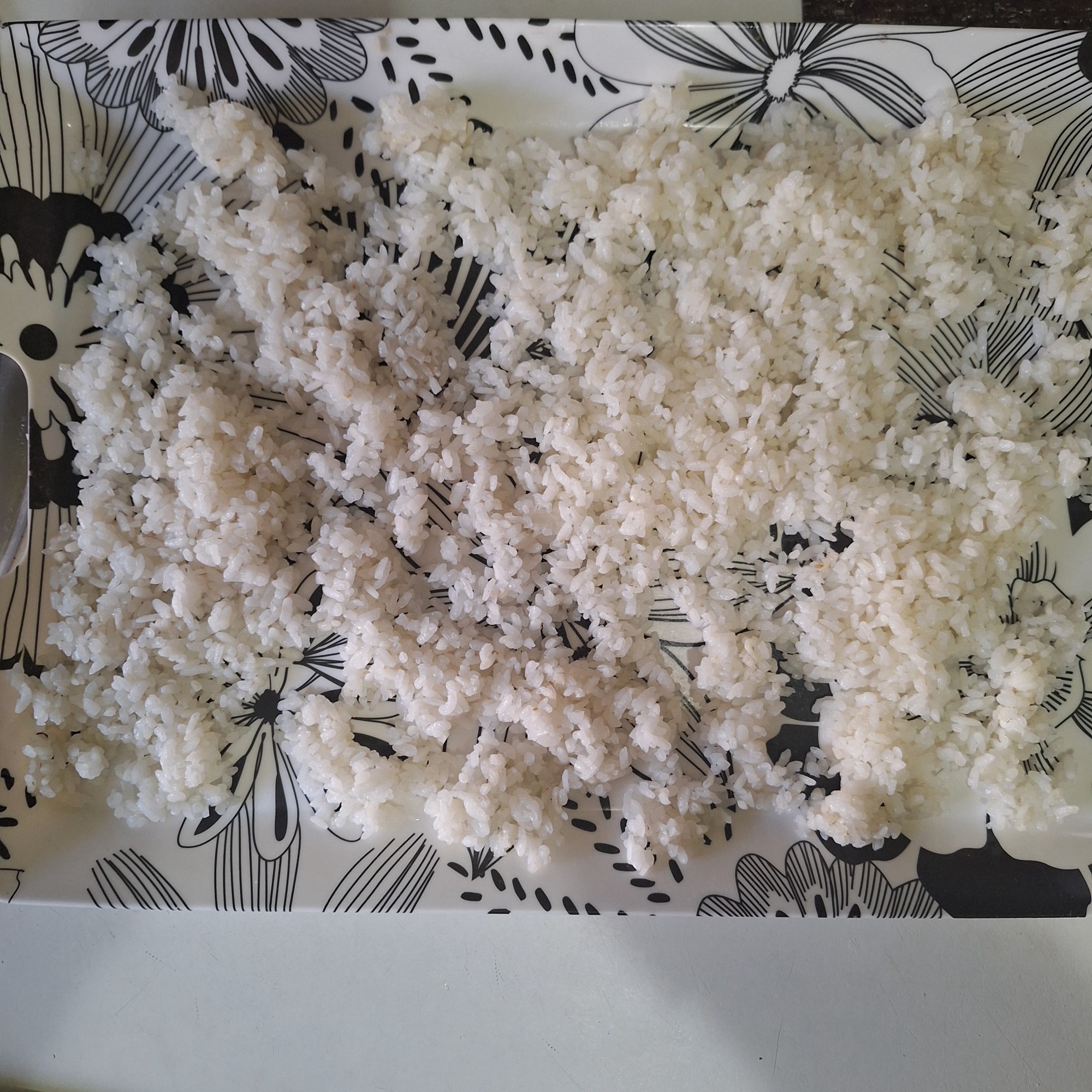 Extiende el arroz sobre una bandeja y prepara el aderezo. Mezcla el vinagre, el azúcar y la sal, caliéntalo un poco en el microondas y mezcla todo bien hasta que se disuelva. Vierte el aderezo sobre el arroz y mezcla bien y extiende para que se enfríe. Seca con un abanico (o deja que se seque solo, como hago yo).