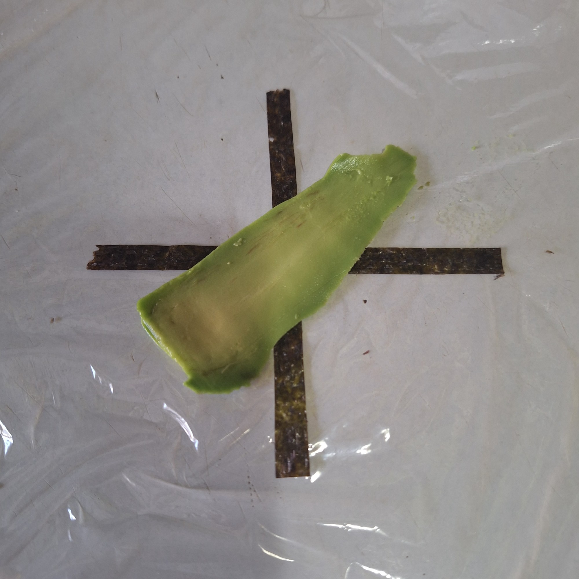 Corta el aguacate en láminas y cubos; igual el mango y la remolacha. Corta la piña en cubos y el alga nori en tiritas pequeñas.