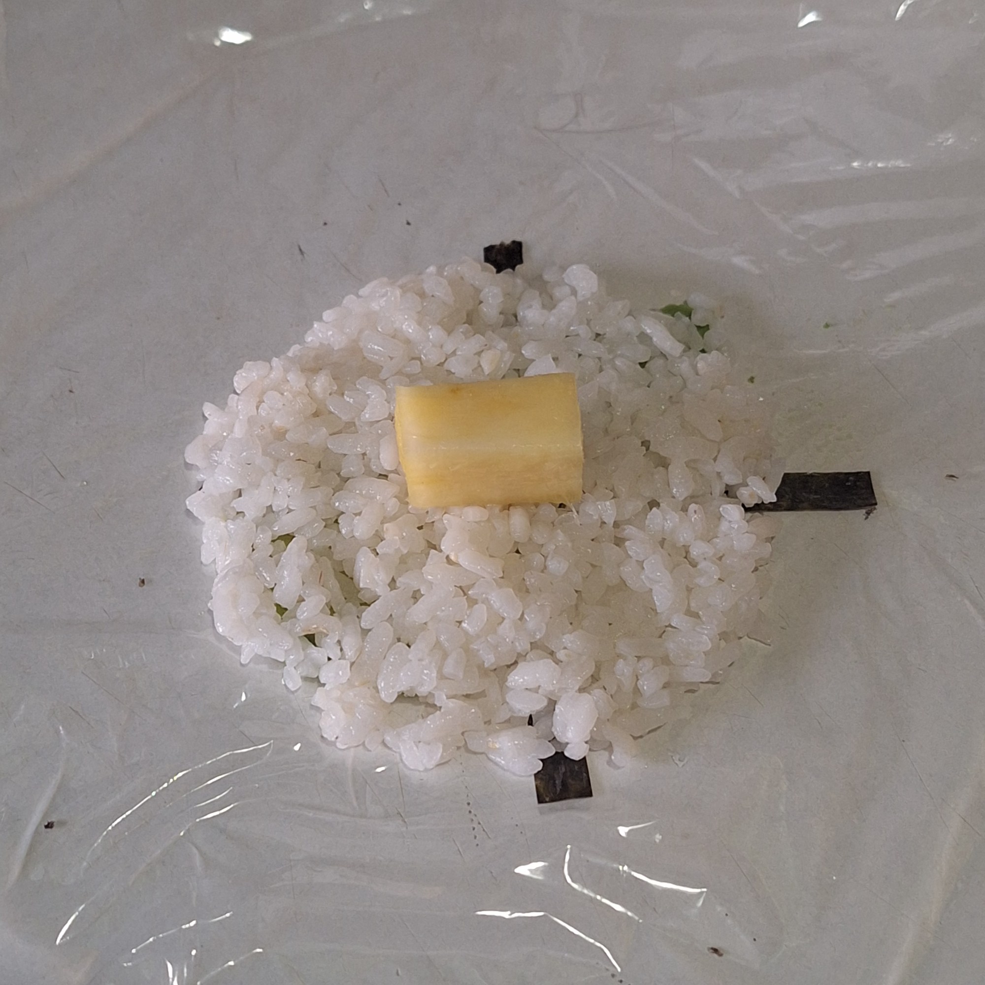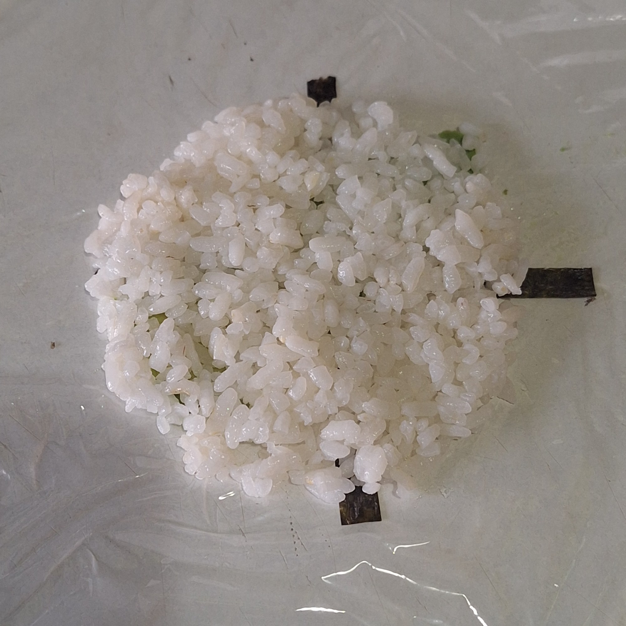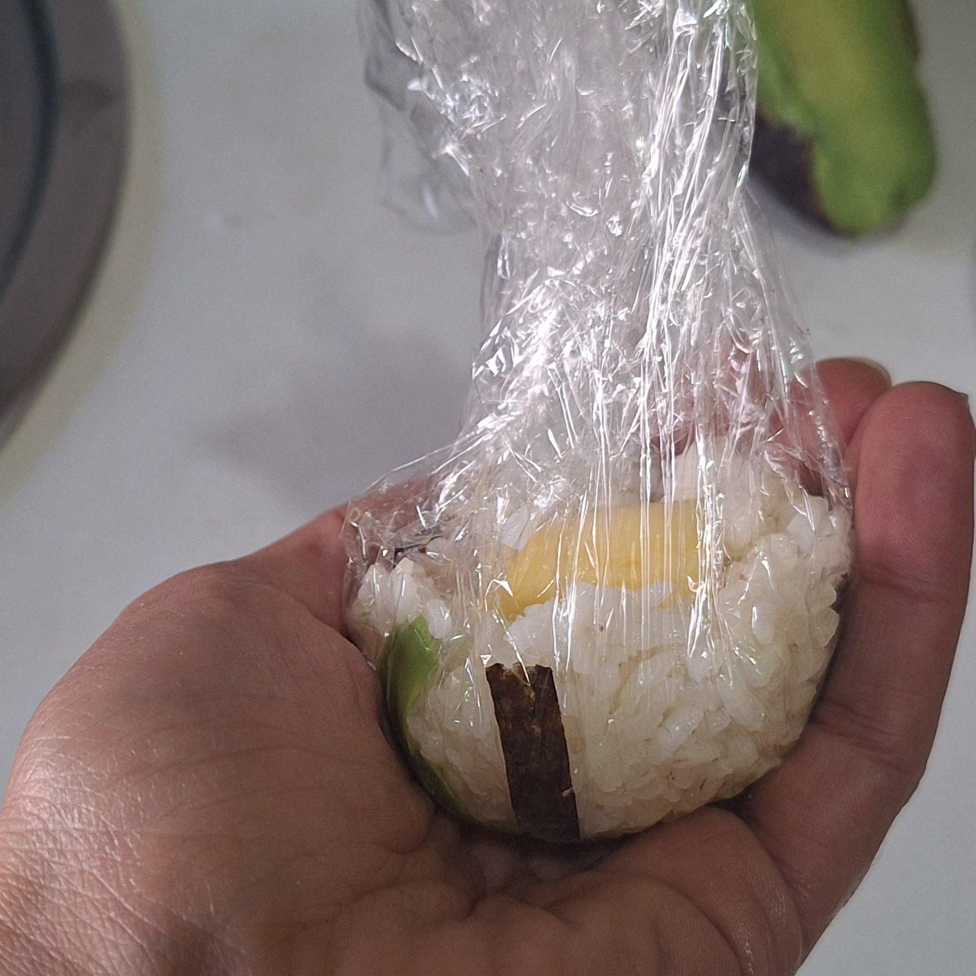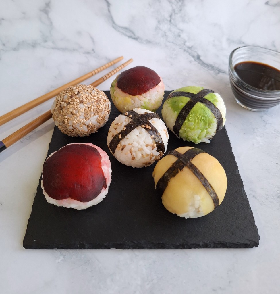Corta un trozo de papel film y coloca en el centro el ingrediente que quieras que quede en la superficie. Moja tus manos, toma una porción de arroz tamaño bola de ping pong y extiende sobre lo anterior. Añade el relleno y haz la bolita uniendo los extremos del film, compactando y girando el plástico para dar la forma. Retira el film y listo.