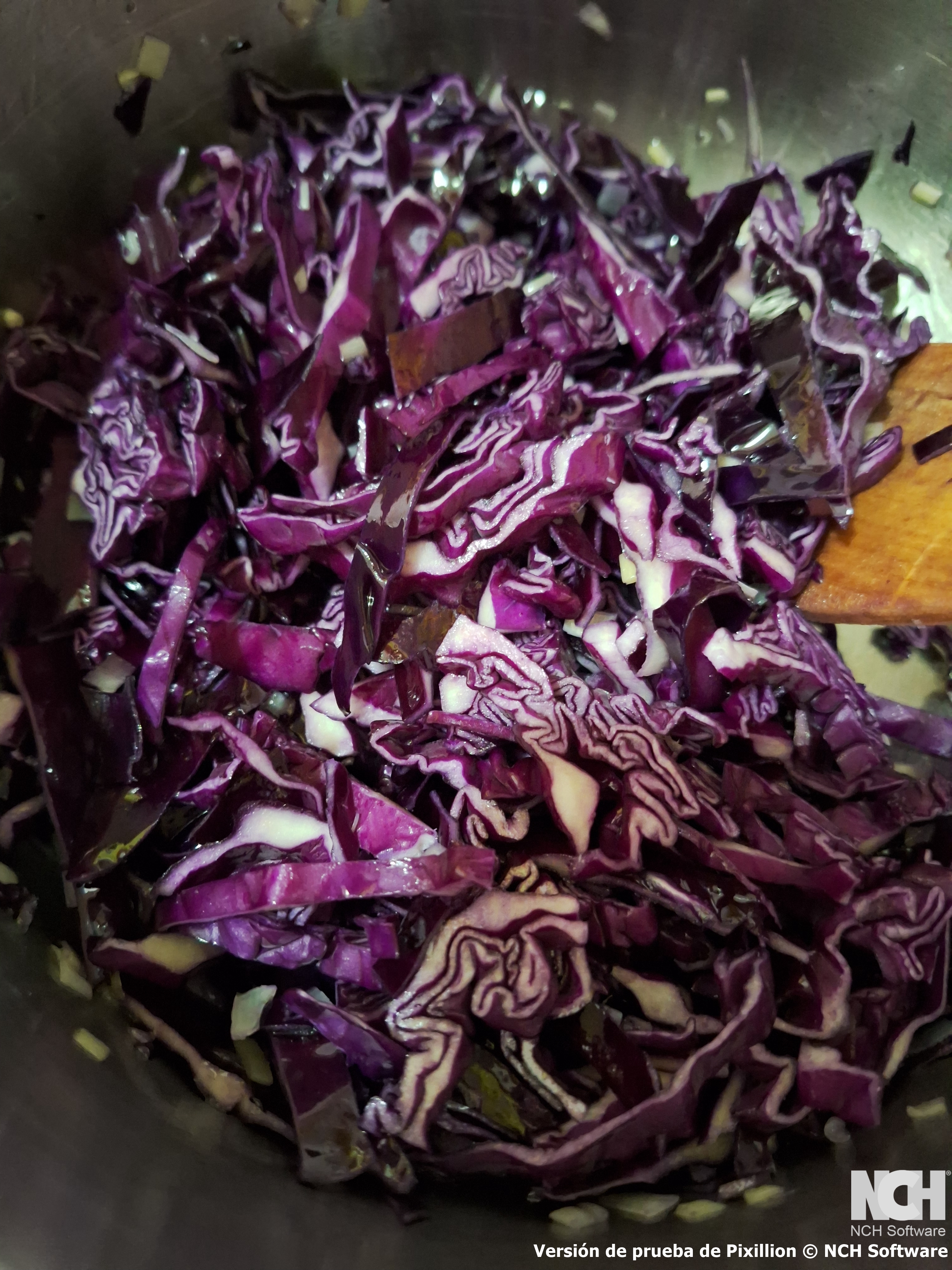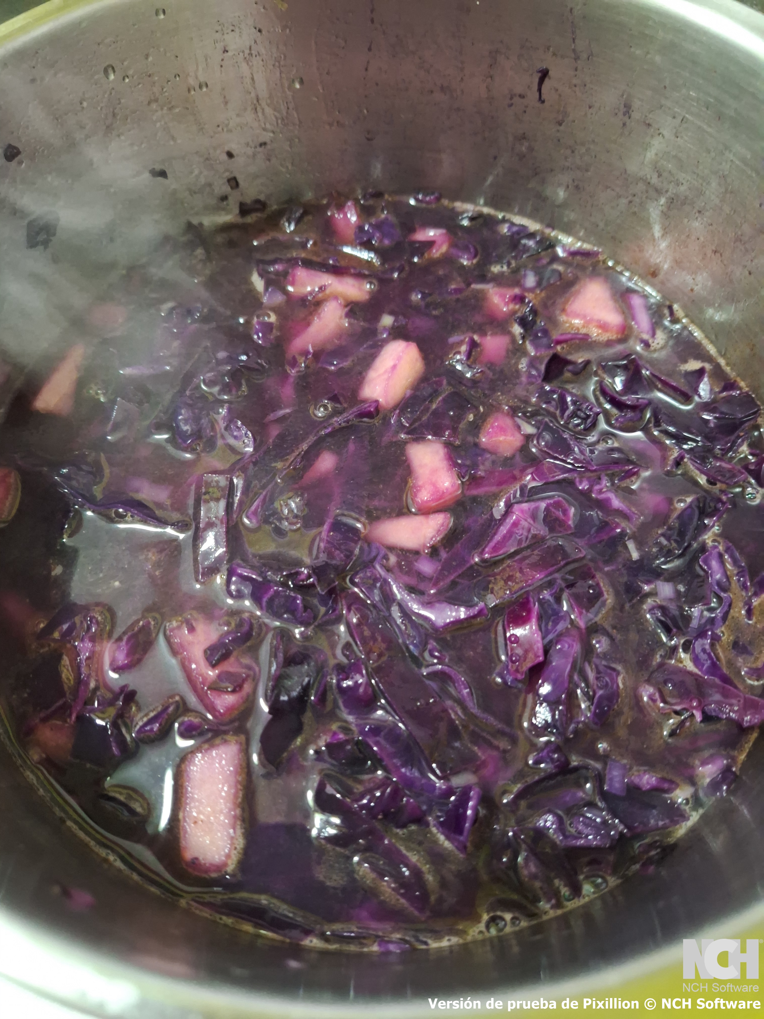 En una cazuela con un poco de aceite, pocha el puerro y cuando empiece a transparentar añade la manzana. Cuando cambie de color incorpora la lombarda y cocina unos 5 minutos.