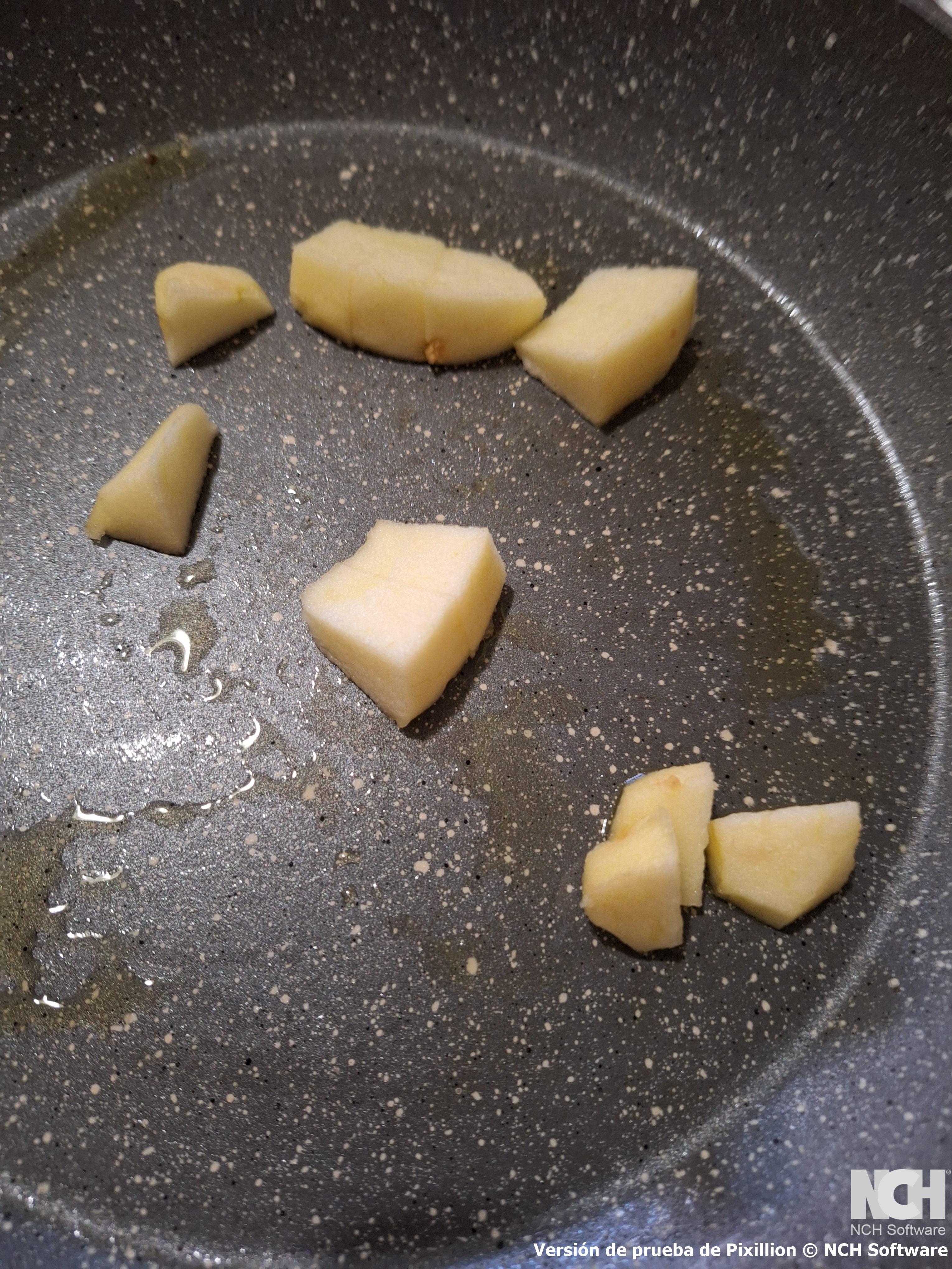 En una sartén con un poquito de aceite dora la manzana a fuego bajo.