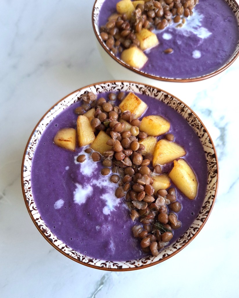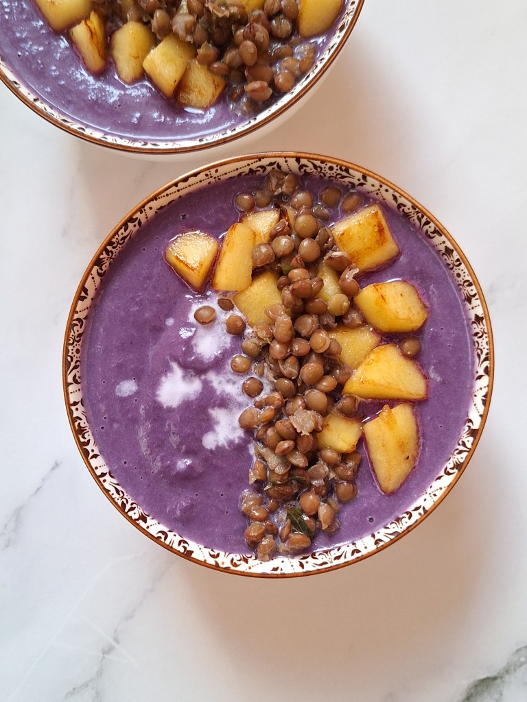 Hoy os traigo una crema de lombarda con manzana y canela. Personalmente, me gusta más con pera, ya que aporta un sabor aún más dulce, pero ese toque de canela es también muy rico. Para completar el plato he añadido un puñado de lentejas cocidas, así tenemos el aporte de proteína vegetal. Podéis incluirlas en la crema, pero yo soy muy maniática en este sentido y siempre que hago cremas utilizo un ingrediente básico y otro complementario, que suele ser el puerro (antes la cebolla). Hacerlo de esta forma mantiene un color más bonito y también ese contraste de texturas que tanto me gusta en las comidas.