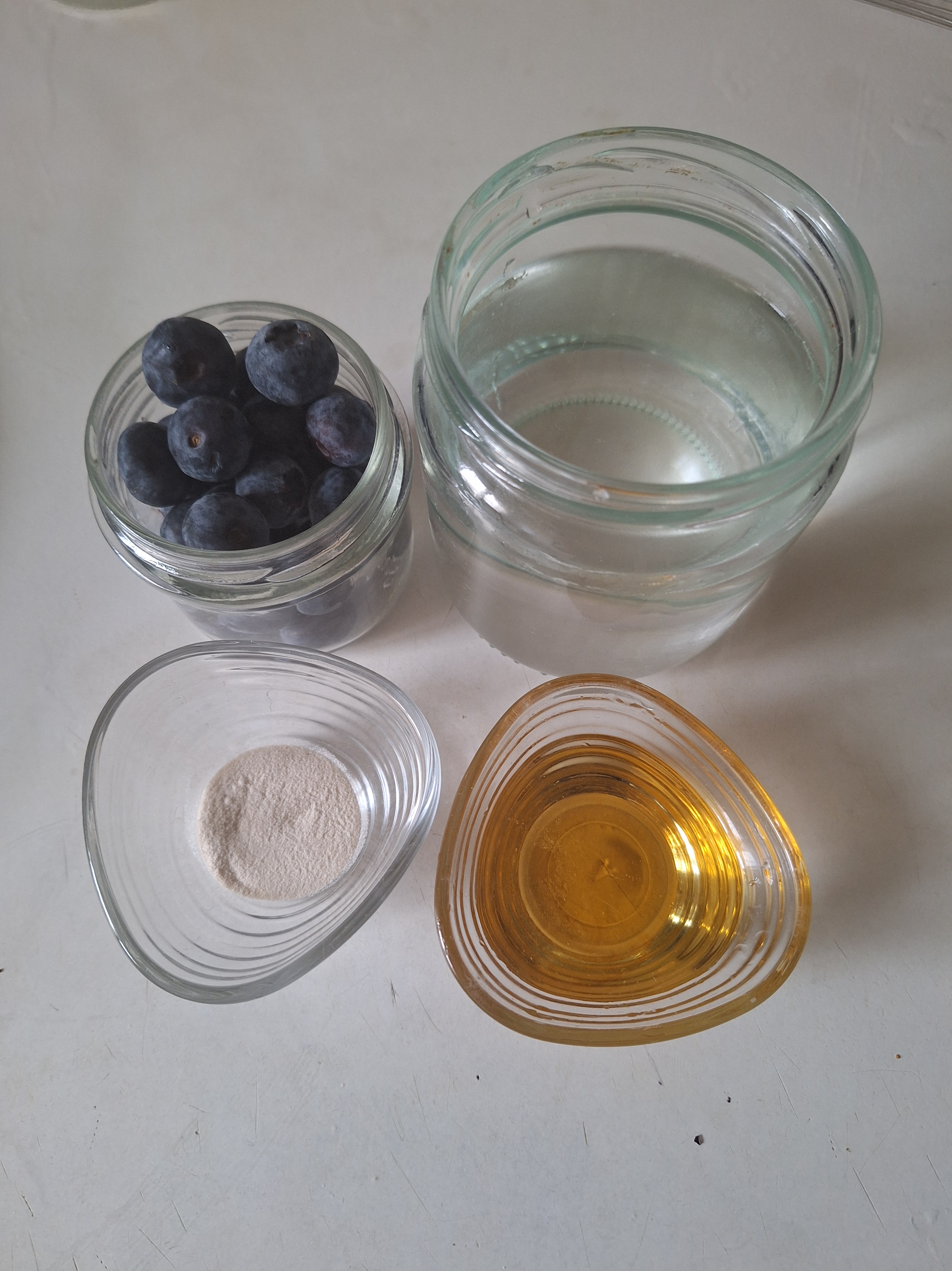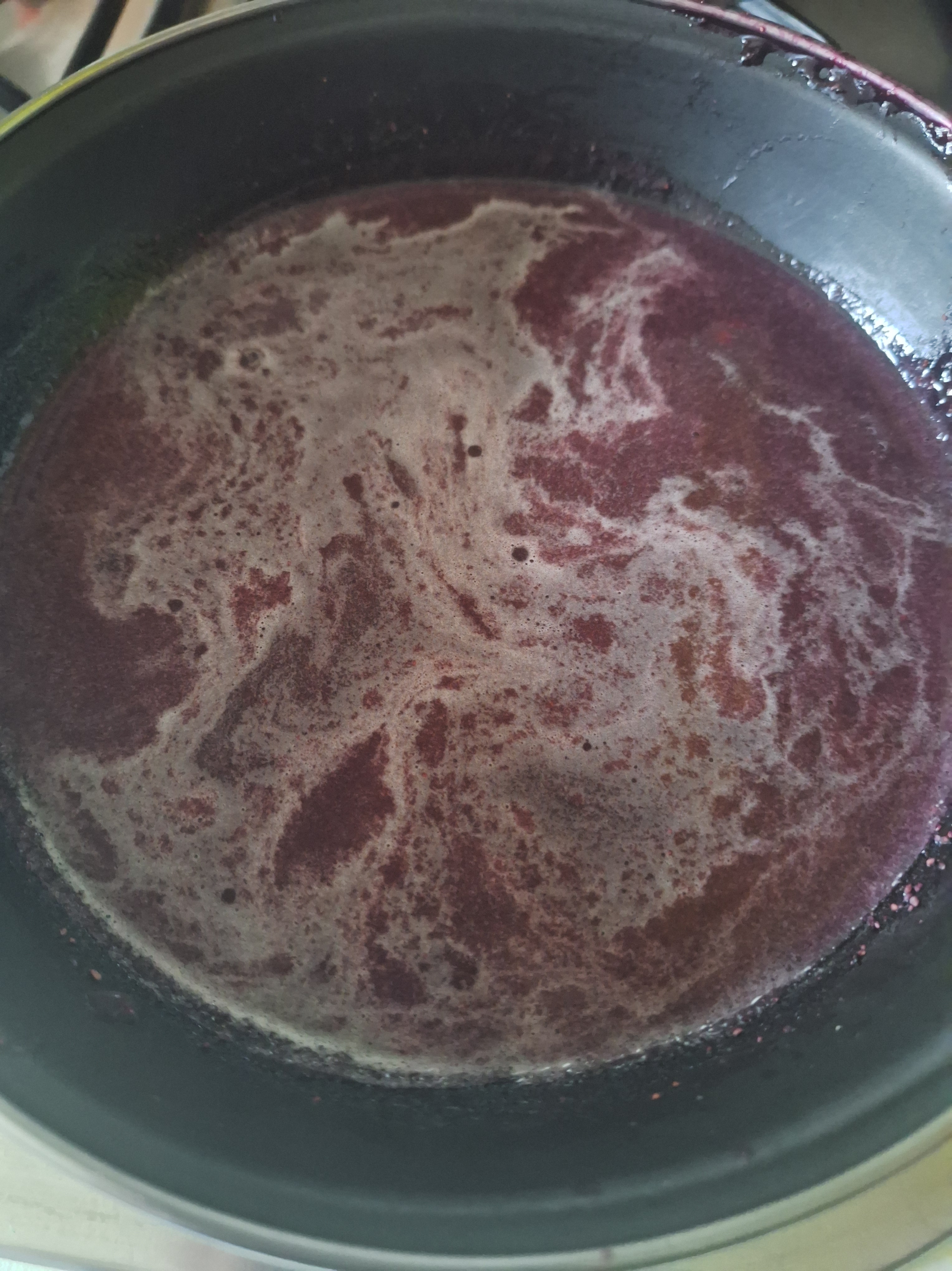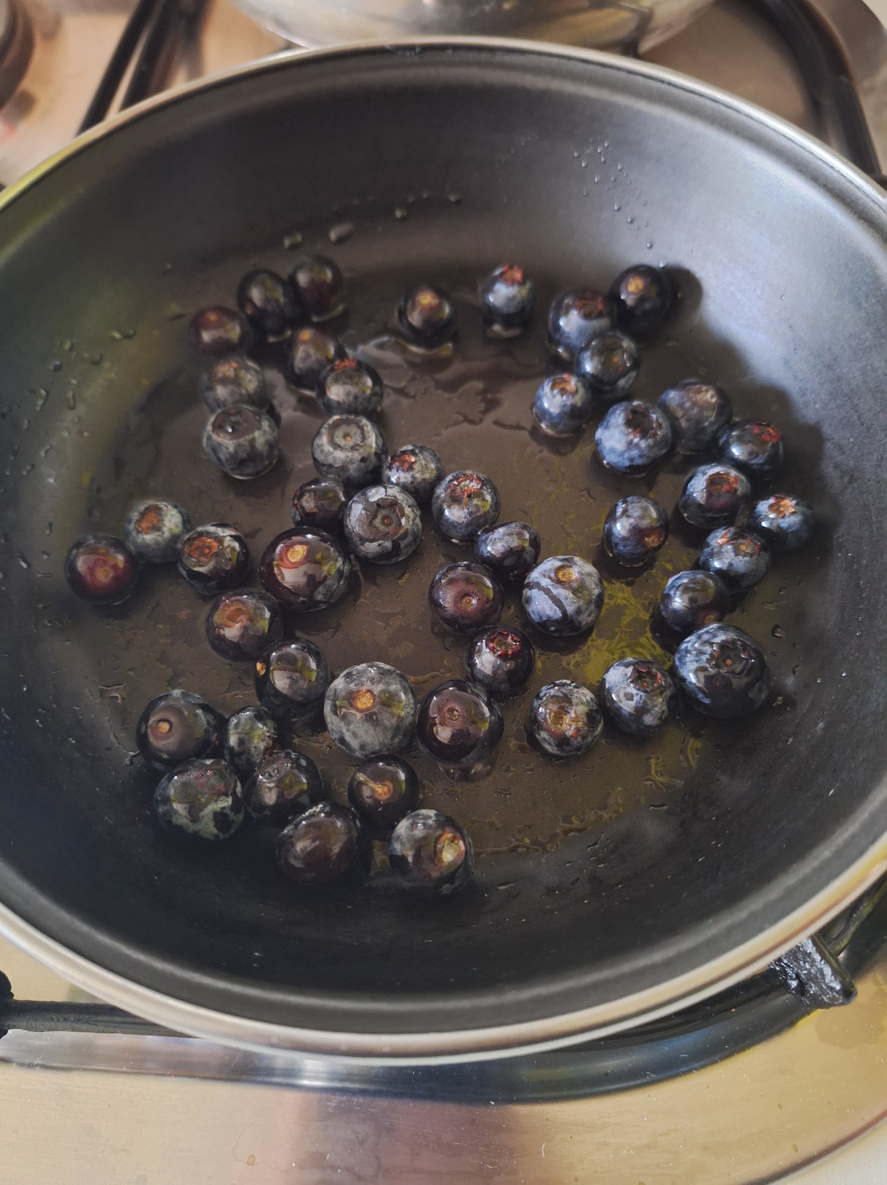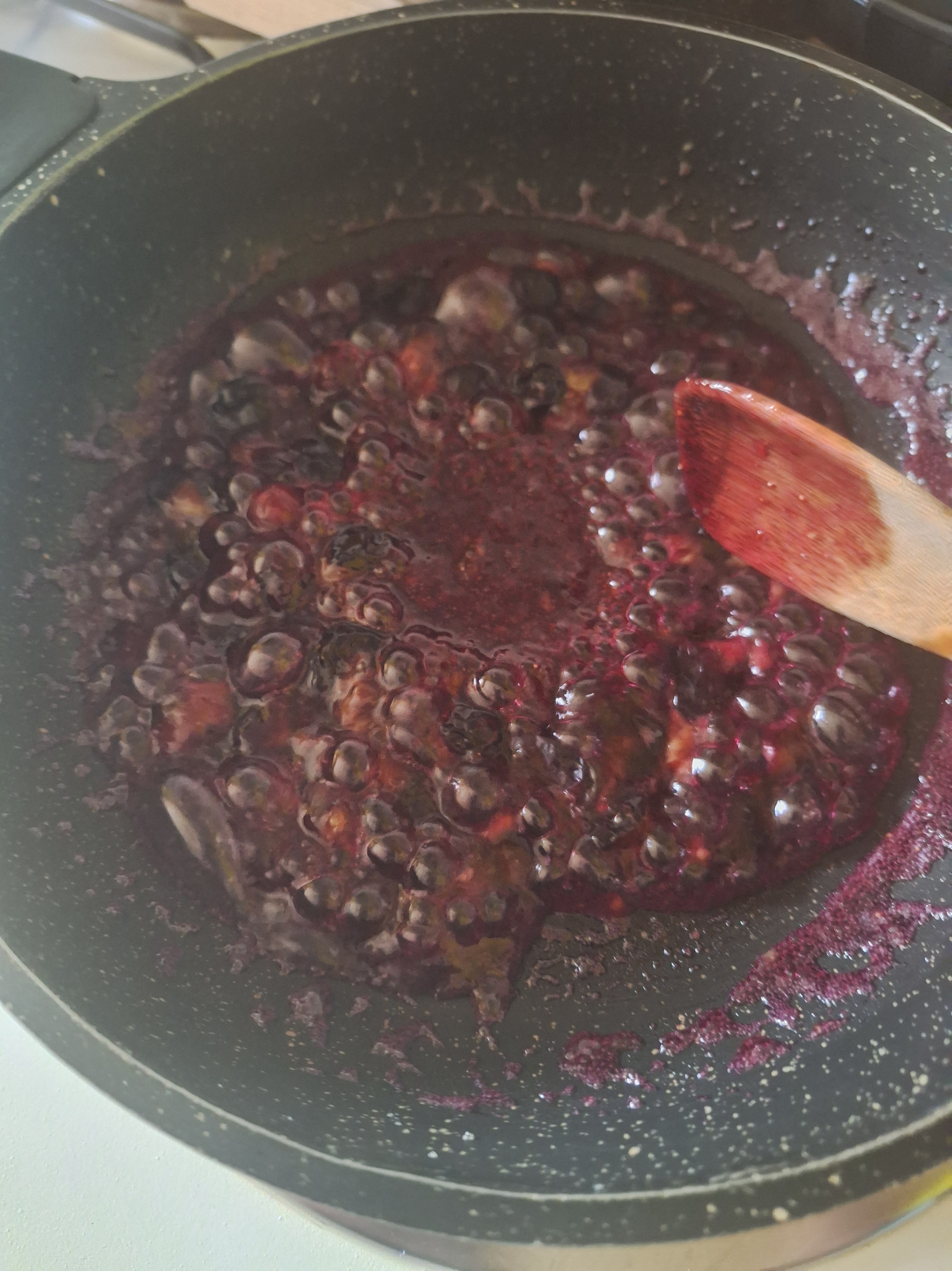 Prepara la cobertura: vierte los arándanos en la sartén junto con el sirope y el vinagre de manzana y deja que se rompan y suelten el jugo. Tritura y cuela si quieres eliminar las pieles. Añade el agua y el agar agar y vuelve a llevar a ebullición 2-3 minutos.