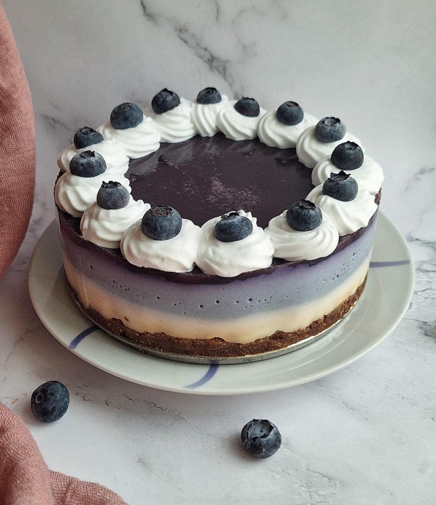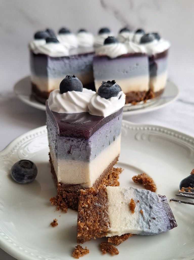 Vierte sobre la capa de cheesecake de arándanos y deja refrigerar al menos 4 horas. Decora con nata vegetal y arándanos frescos.