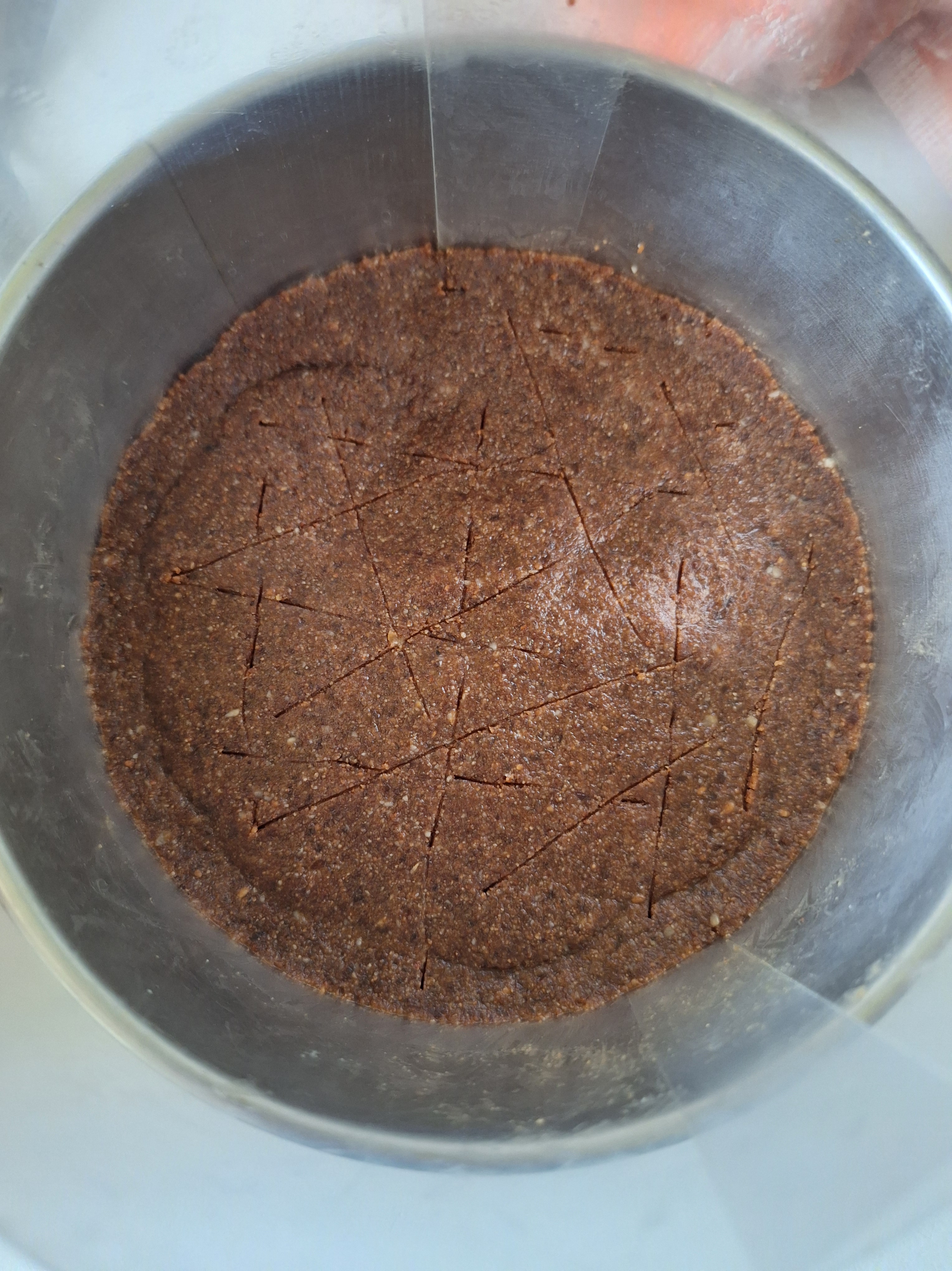 Prepara la base, triturando las galletas junto con los dátiles y la mantequilla vegana de coco. Forra un molde con una lámina de acetato y vierte la mezcla de galletas, presionando para que quede compacta. Lleva al frigo.