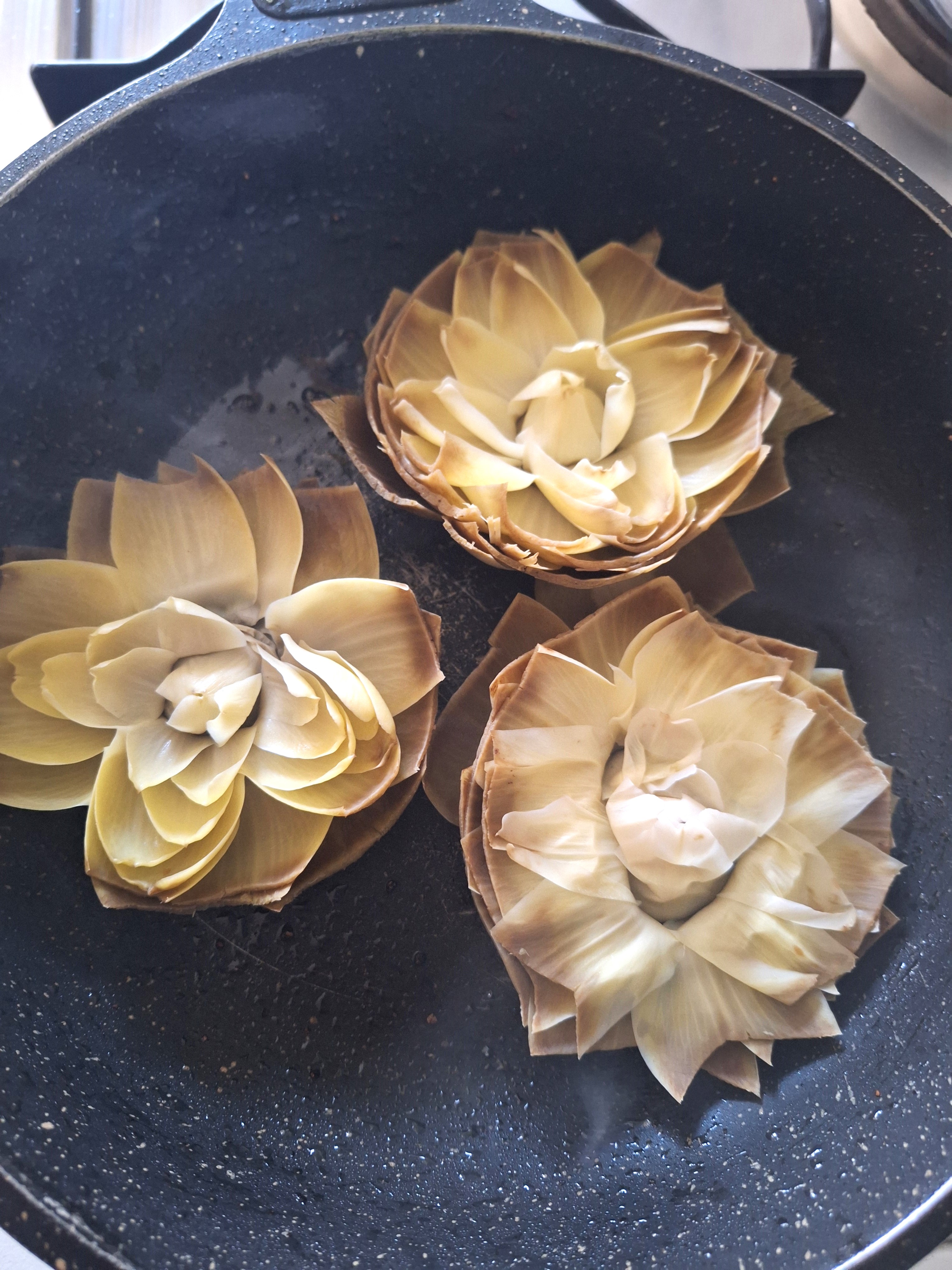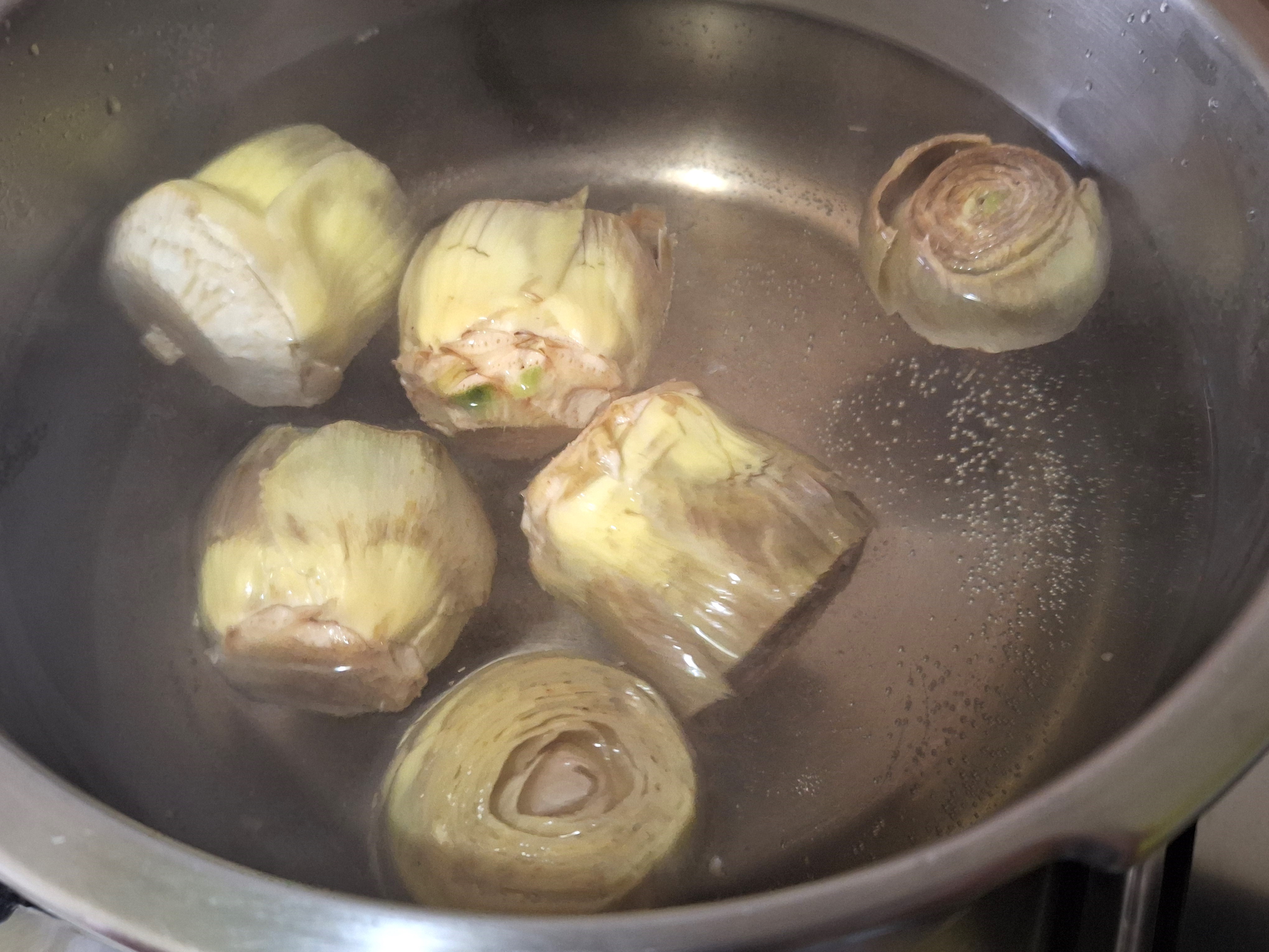 Lleva al fuego y cocina hasta que las alcachofas estén blanditas (comprueba con un tenedor). Escurre boca abajo para eliminar el máximo posible de agua.
