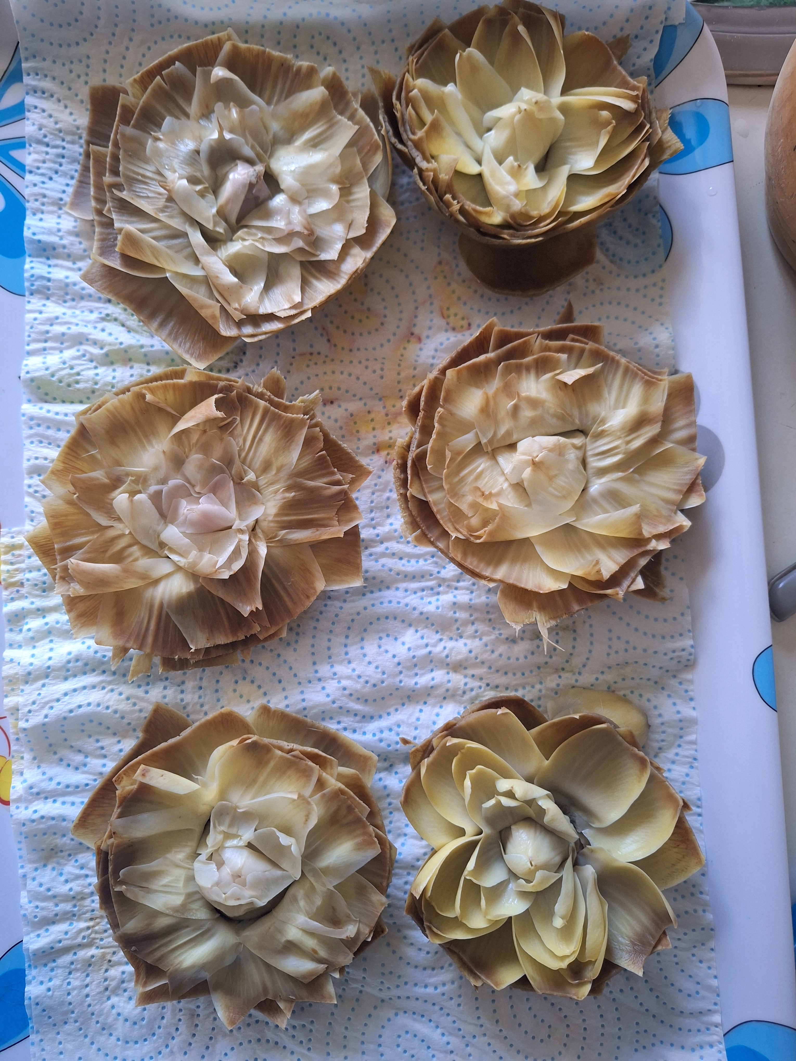 Coloca papel absorbente sobre una bandeja. Abre las alcachofas con cuidado, empezando a separar las hojas desde fuera hacia adentro. Escurre boca abajo sobre el papel absorbente.