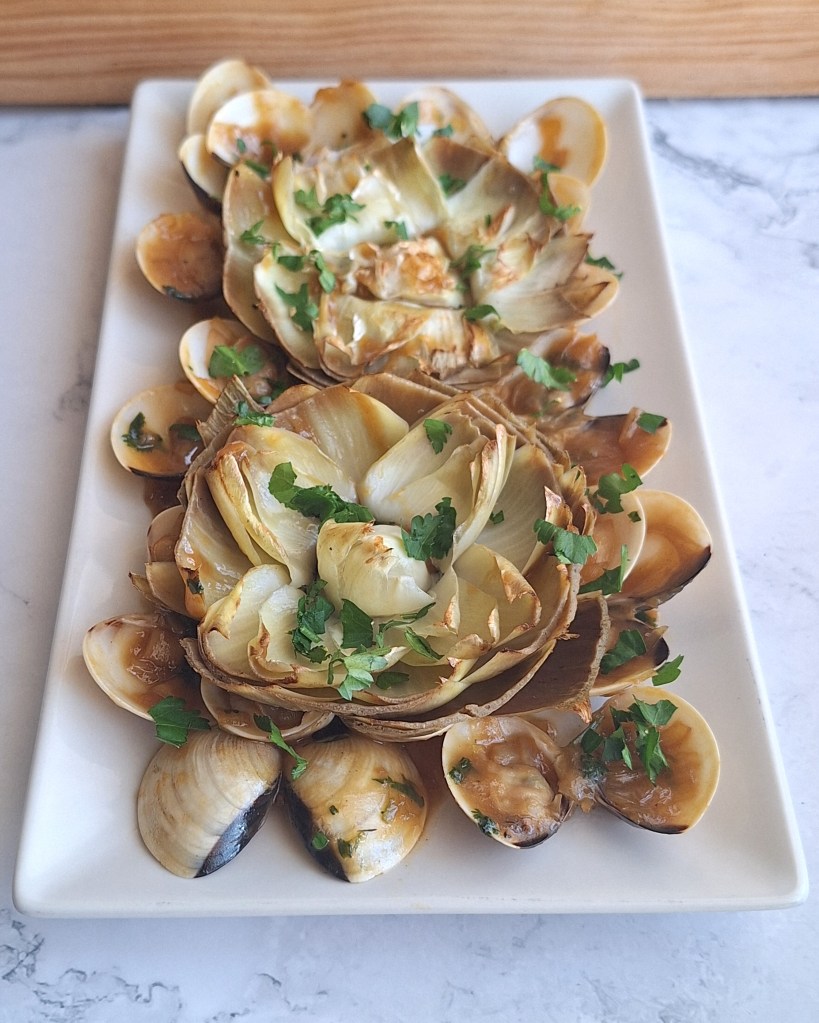 Coloca las almejas en la base del plato y encima las flores de alcachofa. Decora con perejil fresco picado.