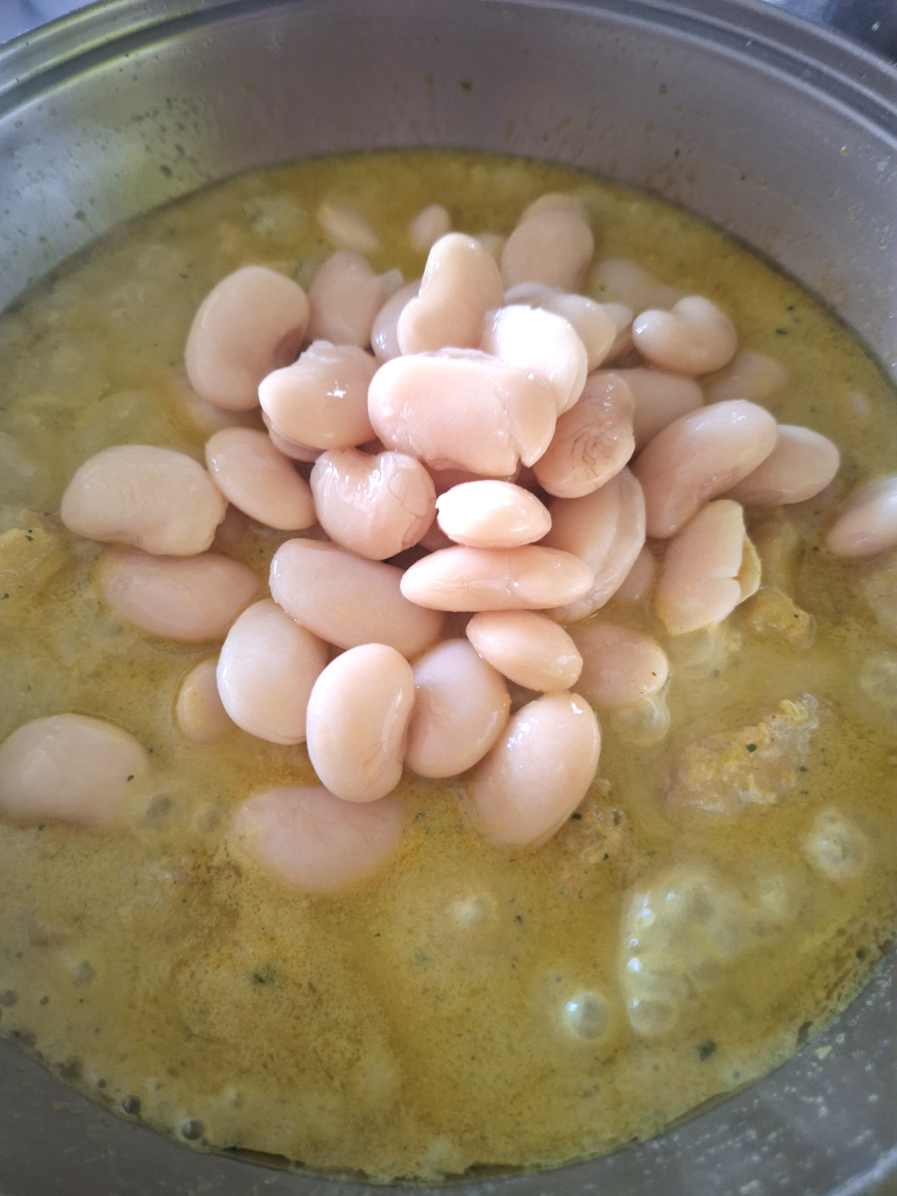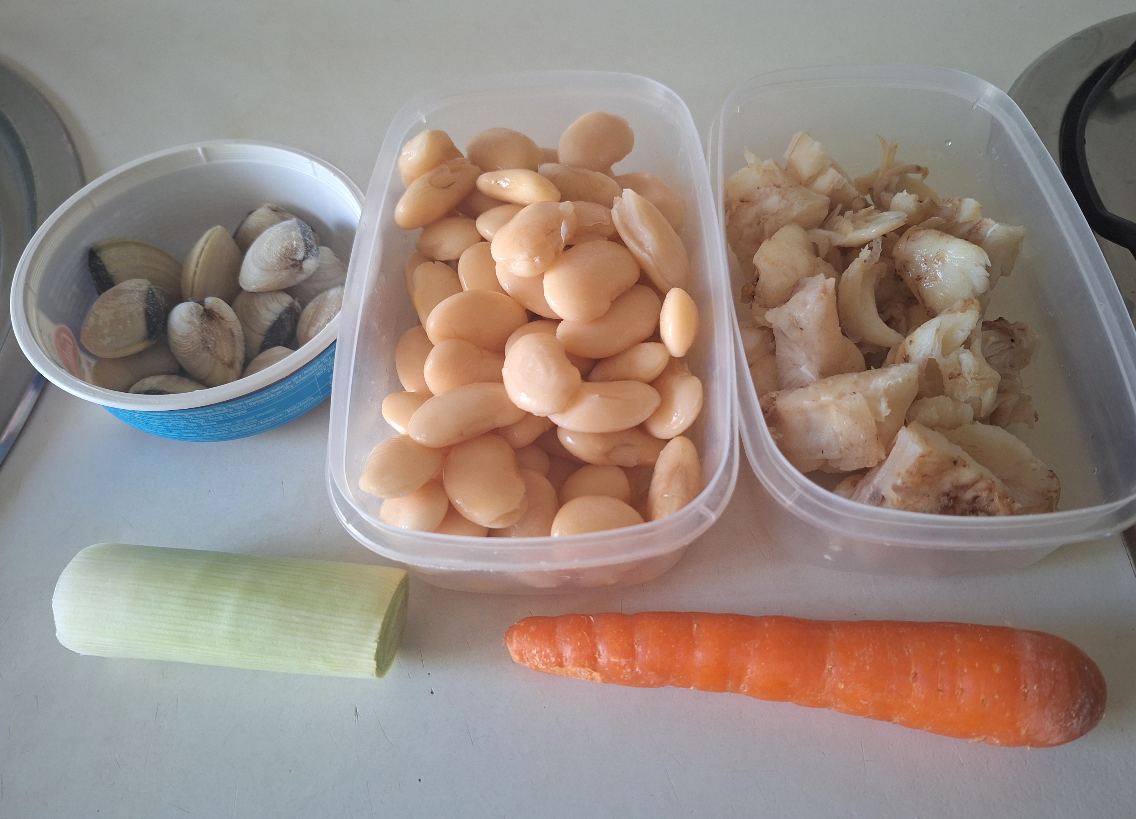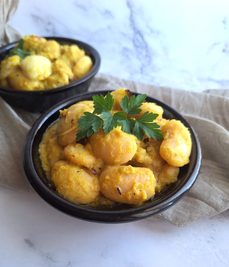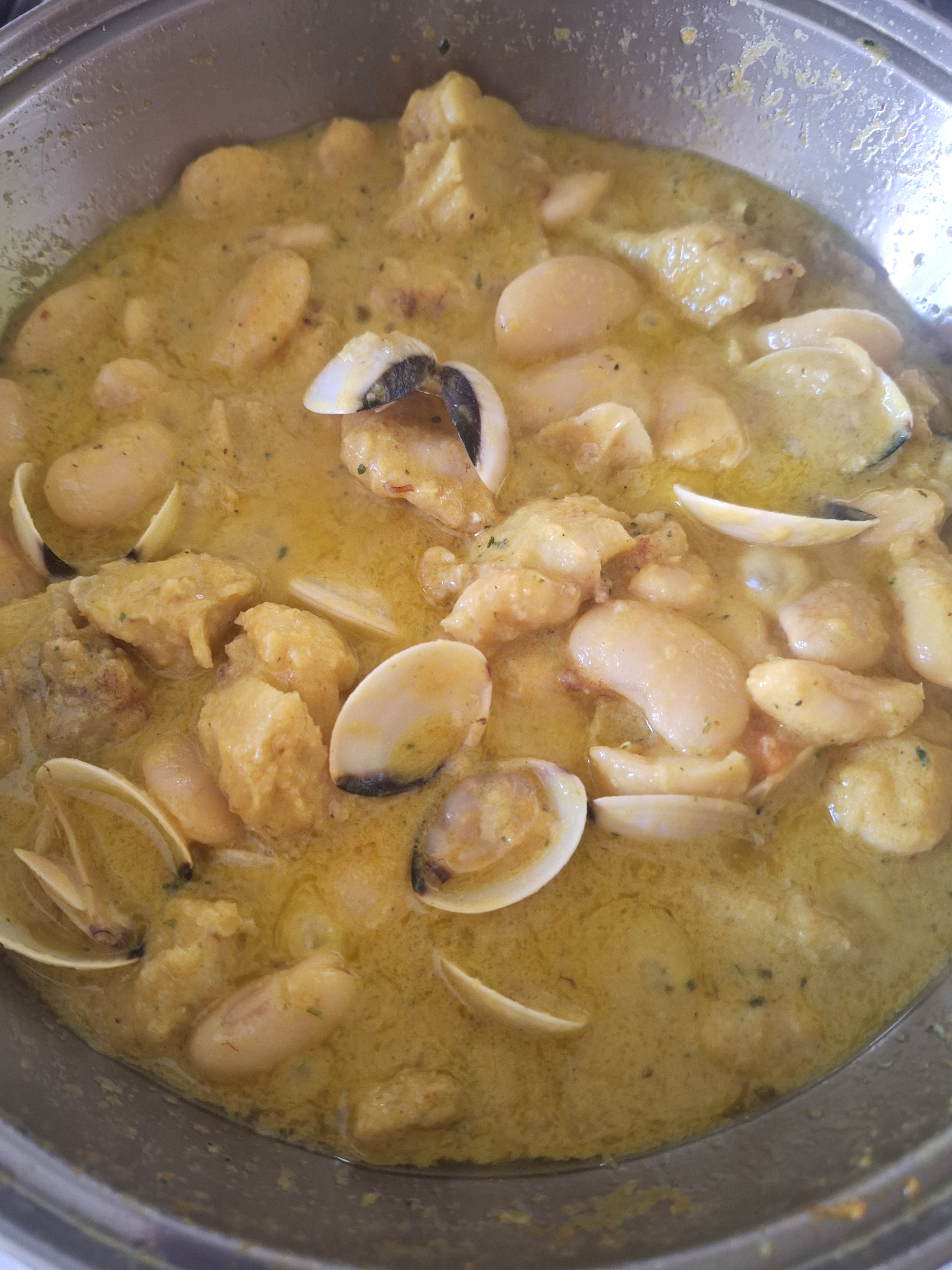 Tenía unos huesos de rape en el congelador que me trajo mi madre para hacer caldo y tenían tanta carne que decidí aprovecharlos para hacer este guiso. Rape, almejas, leche de coco y una combinación de especias típica de la cocina india. Una combinación exótica y llena de sabor que hará que ames las alubias por siempre jamás. Espero que te guste.