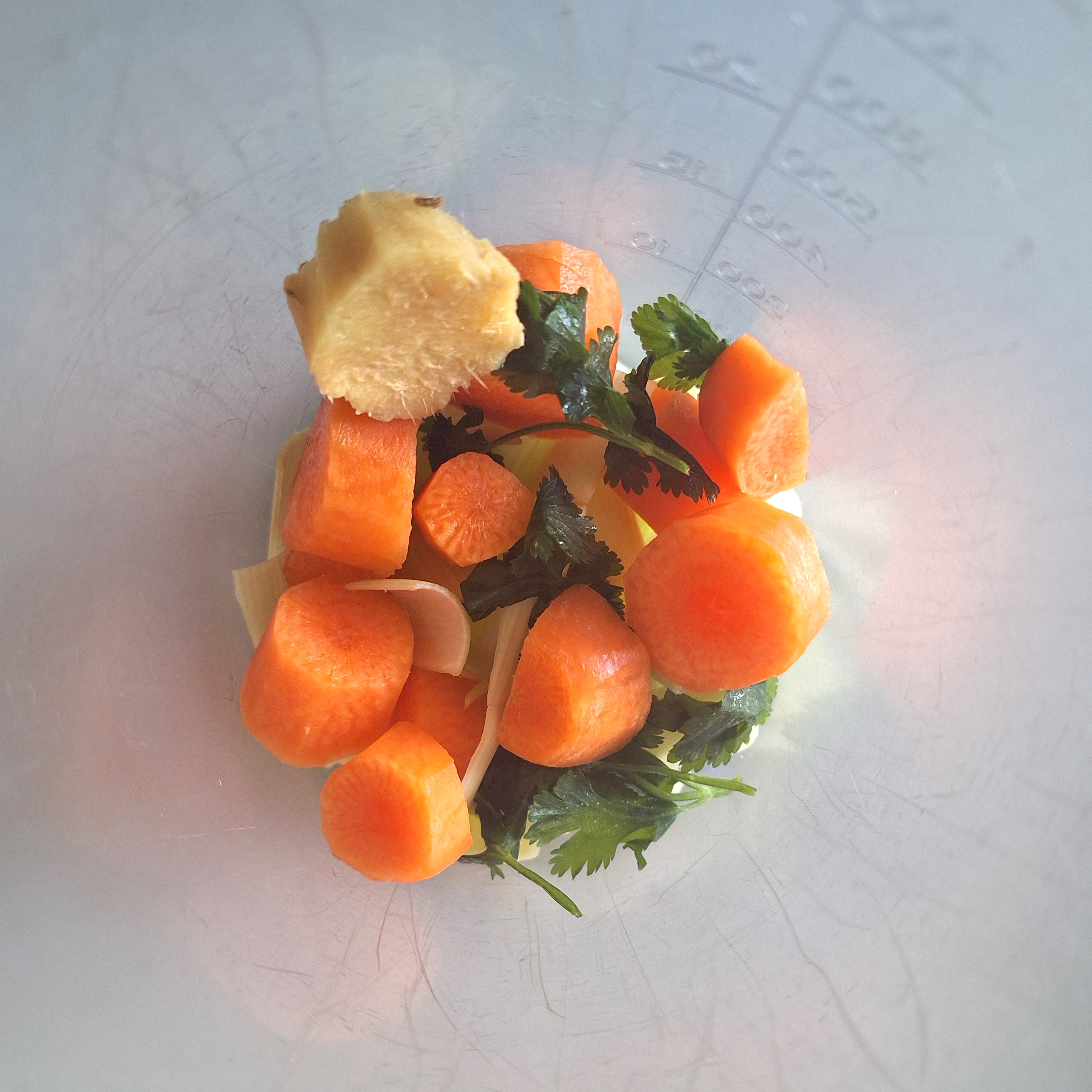 Corta el puerro y el cilantro en trozos pequeños; pela la zanahoria y el jengibre y corta también. Vierte en el vaso de la batidora y tritura hasta obtener una pasta.