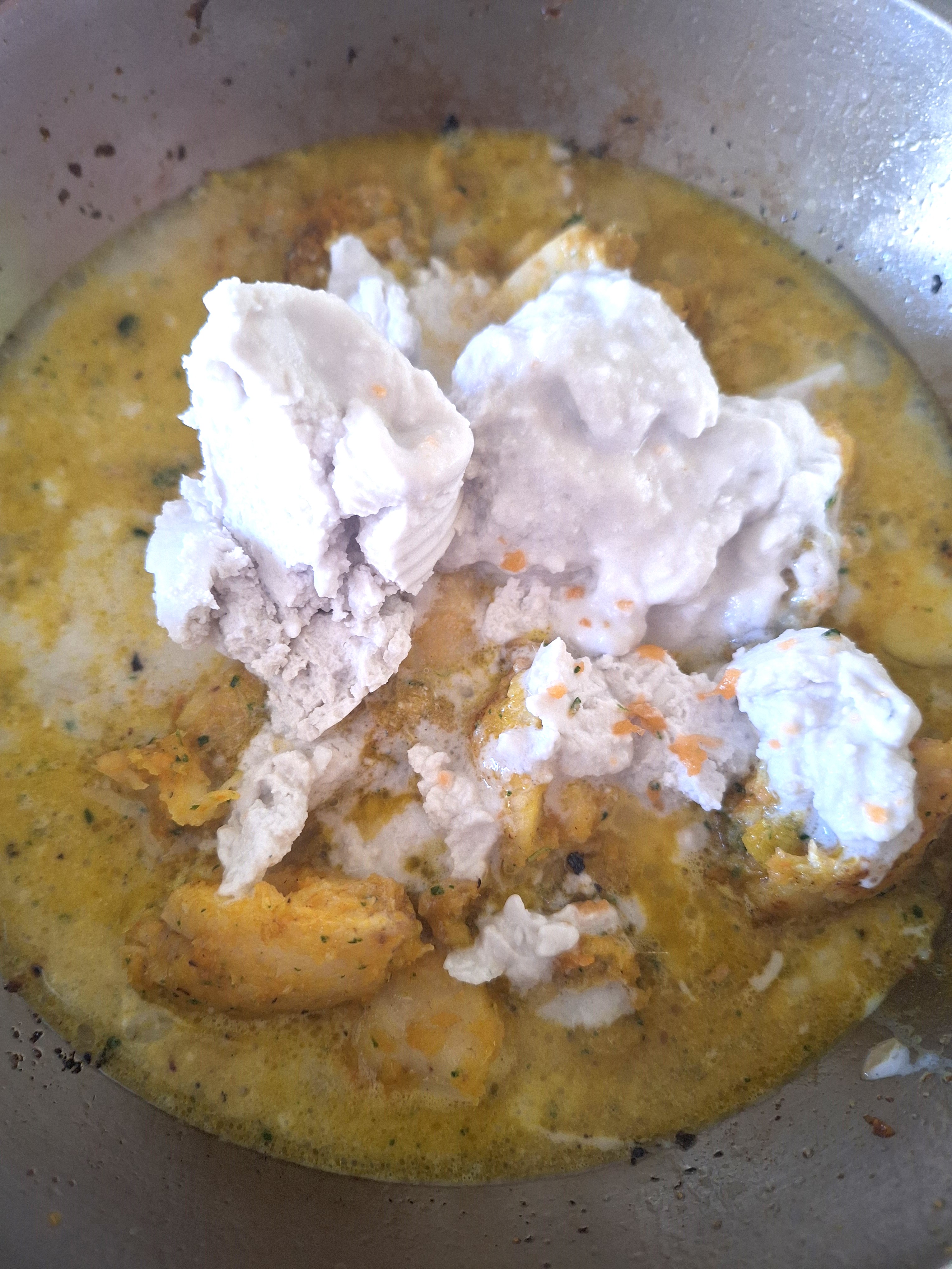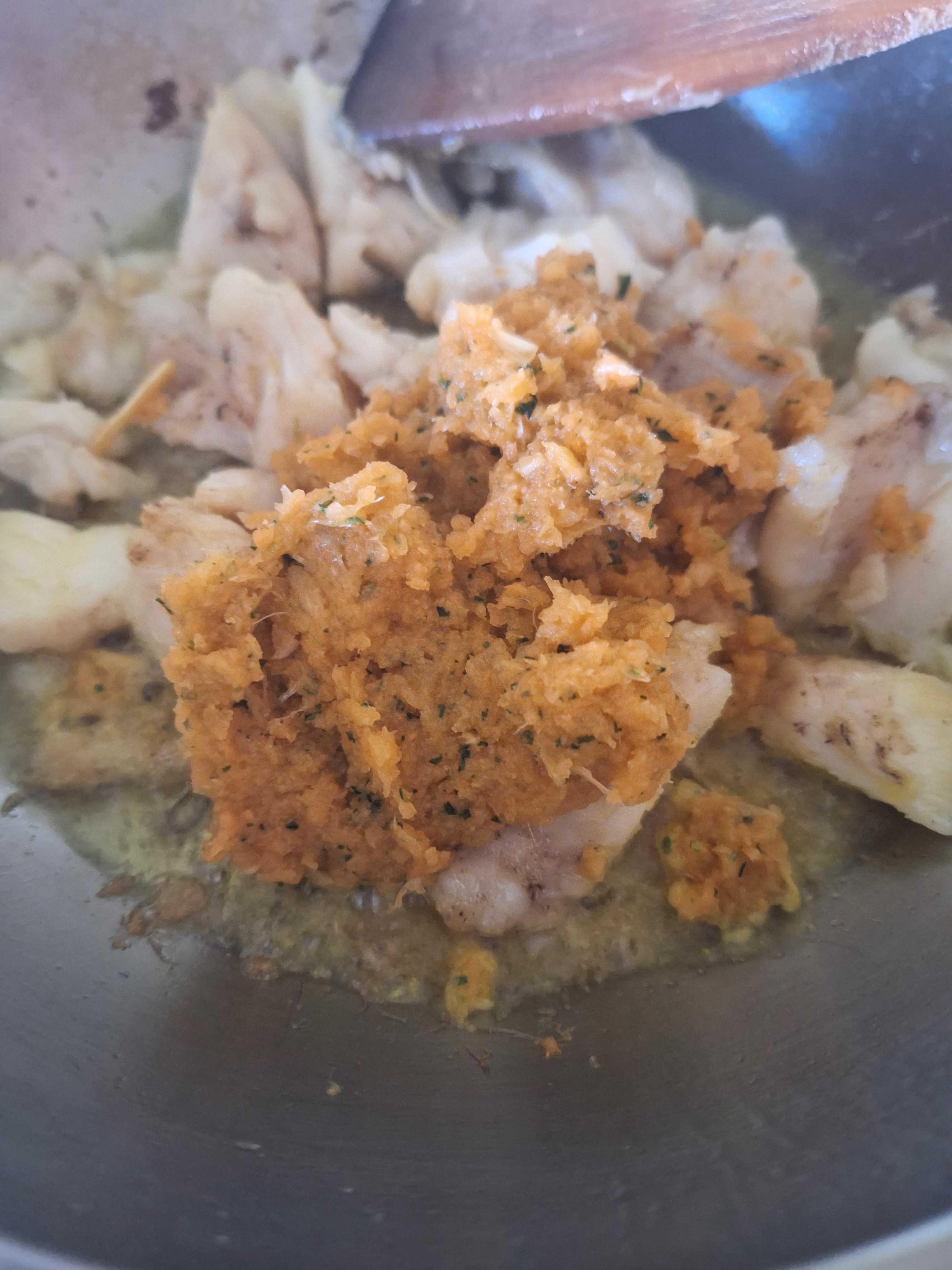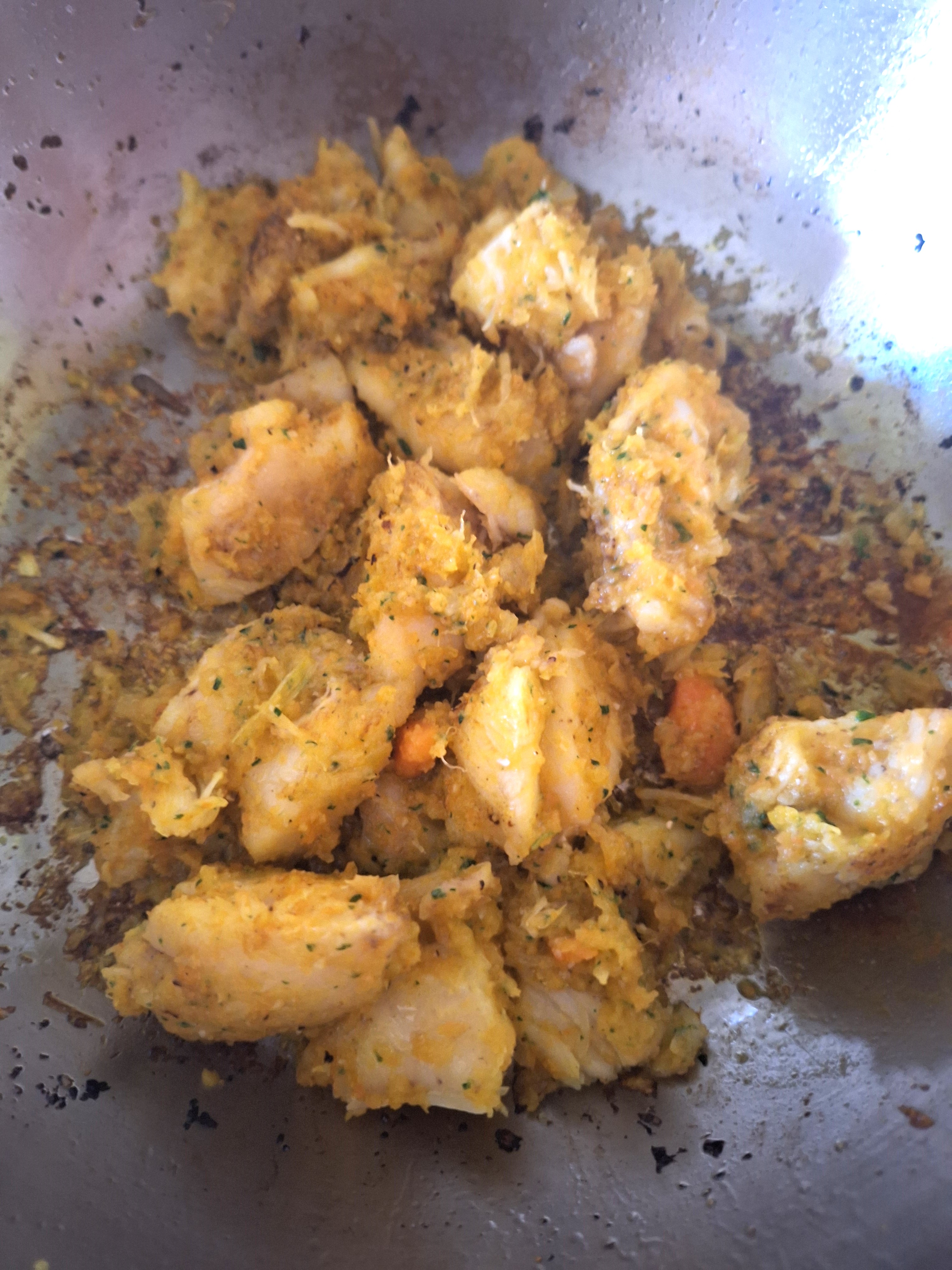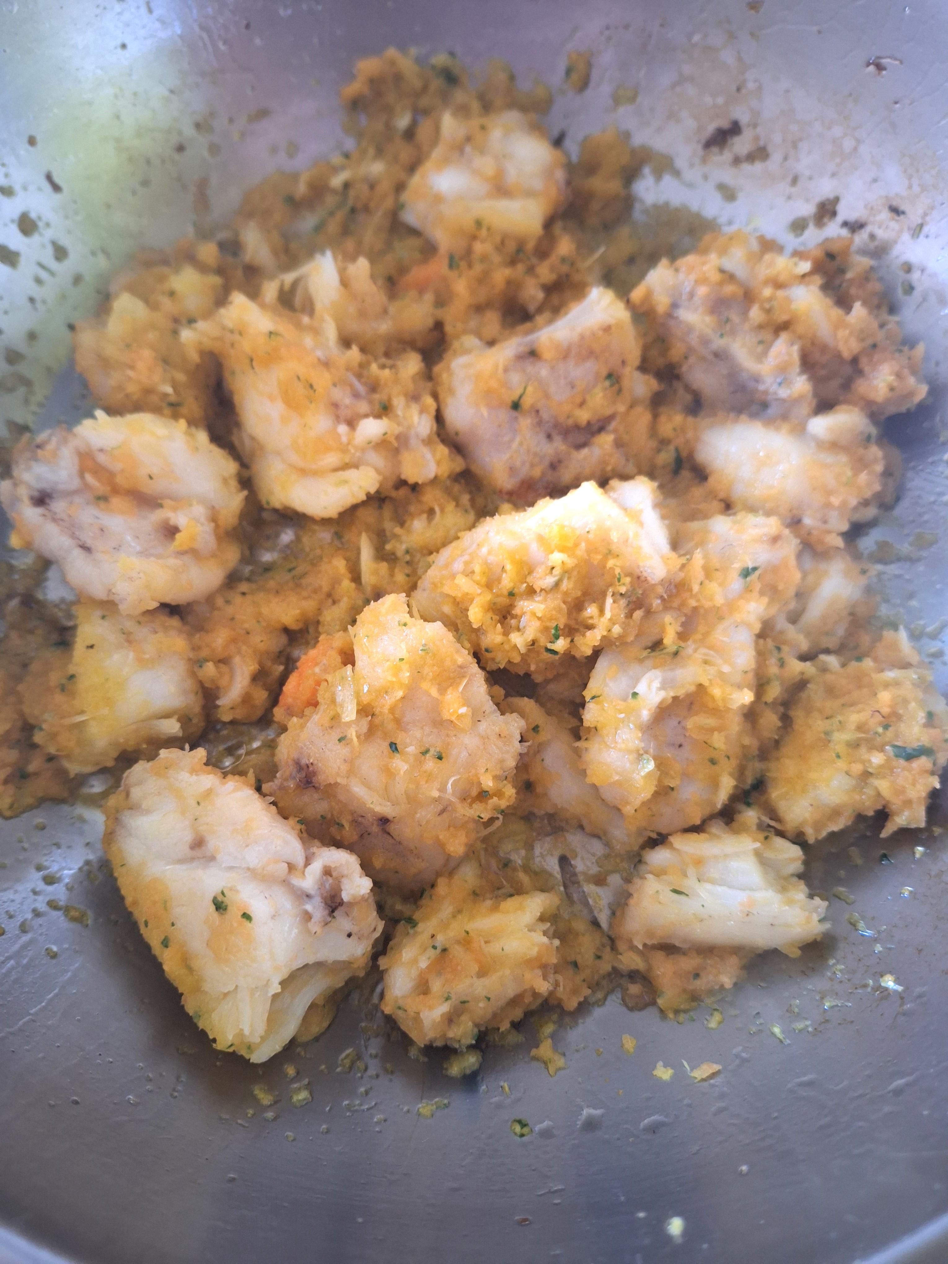 Calienta un poco de aceite en una cazuela y dora el rape. Agrega entonces la pasta anterior y cocina unos 5 minutos, removiendo para que no se pegue. Añade las especias y mezcla bien.