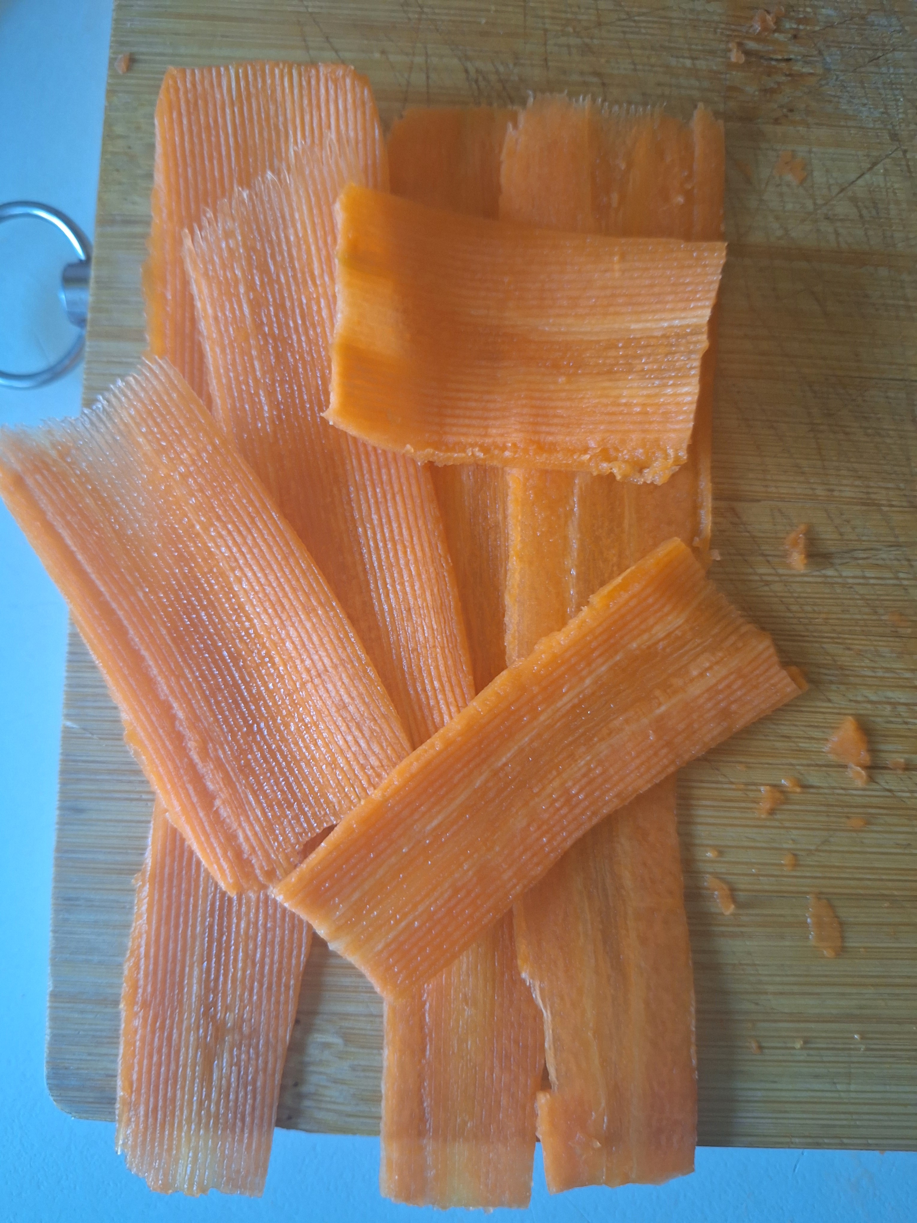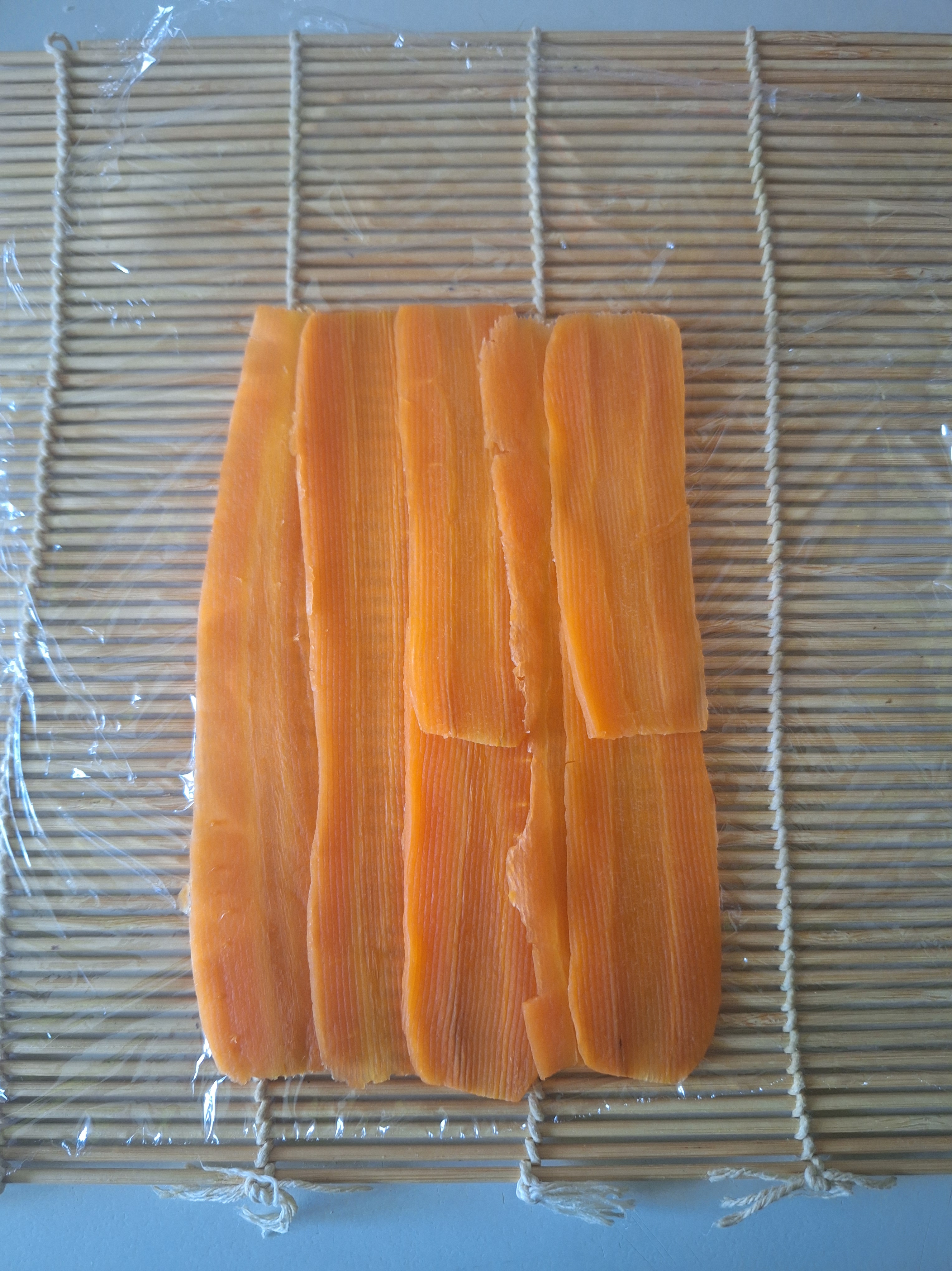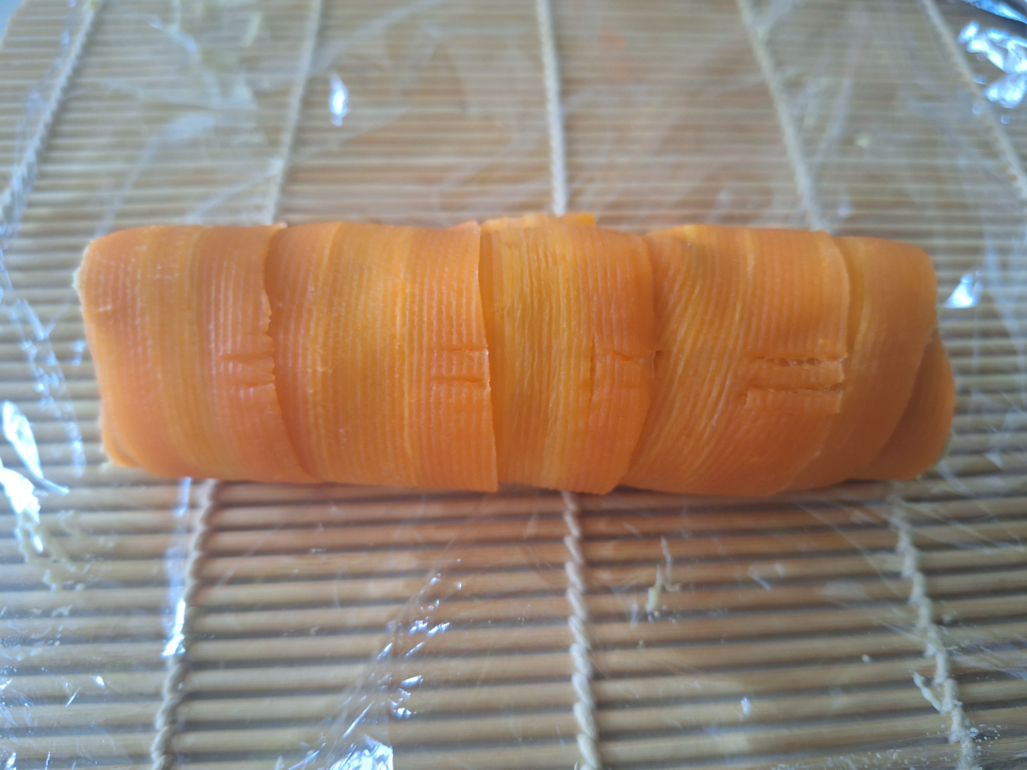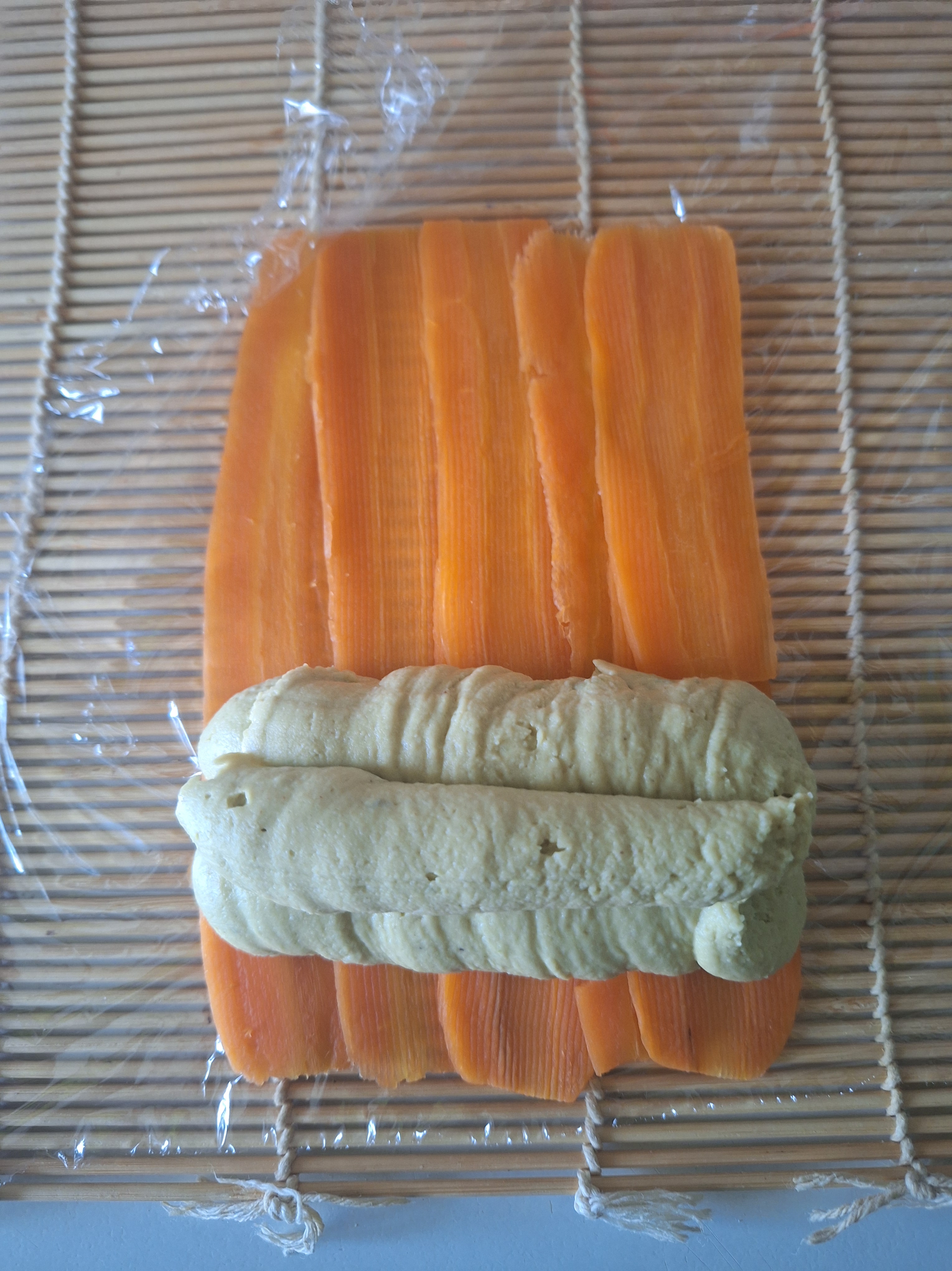 Coloca un trozo de papel film sobre una esterilla de bambú y las tiras de zanahoria superpuestas un poco. Rellena con el hummus de habas y con cuidado enrolla y reserva.