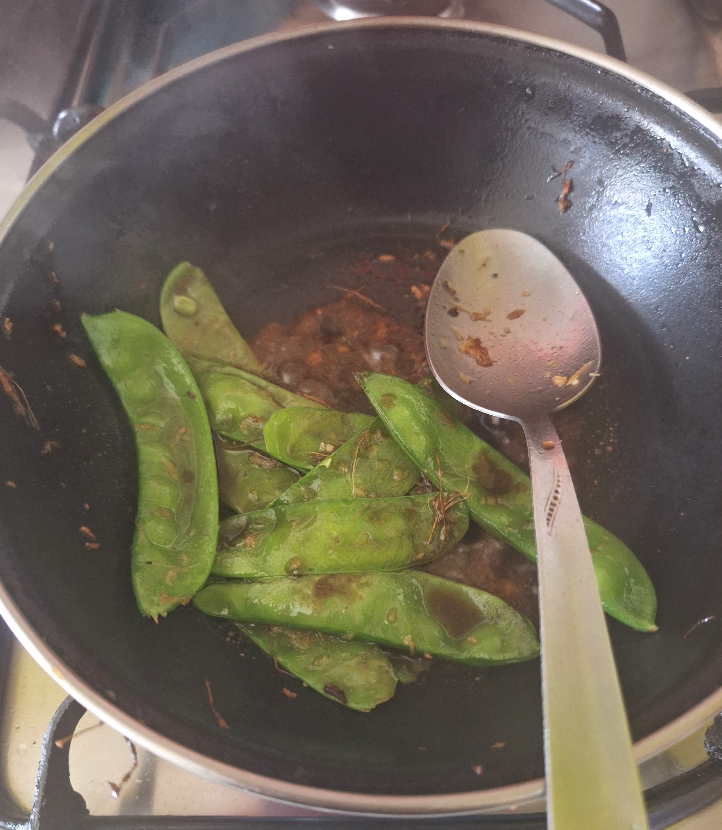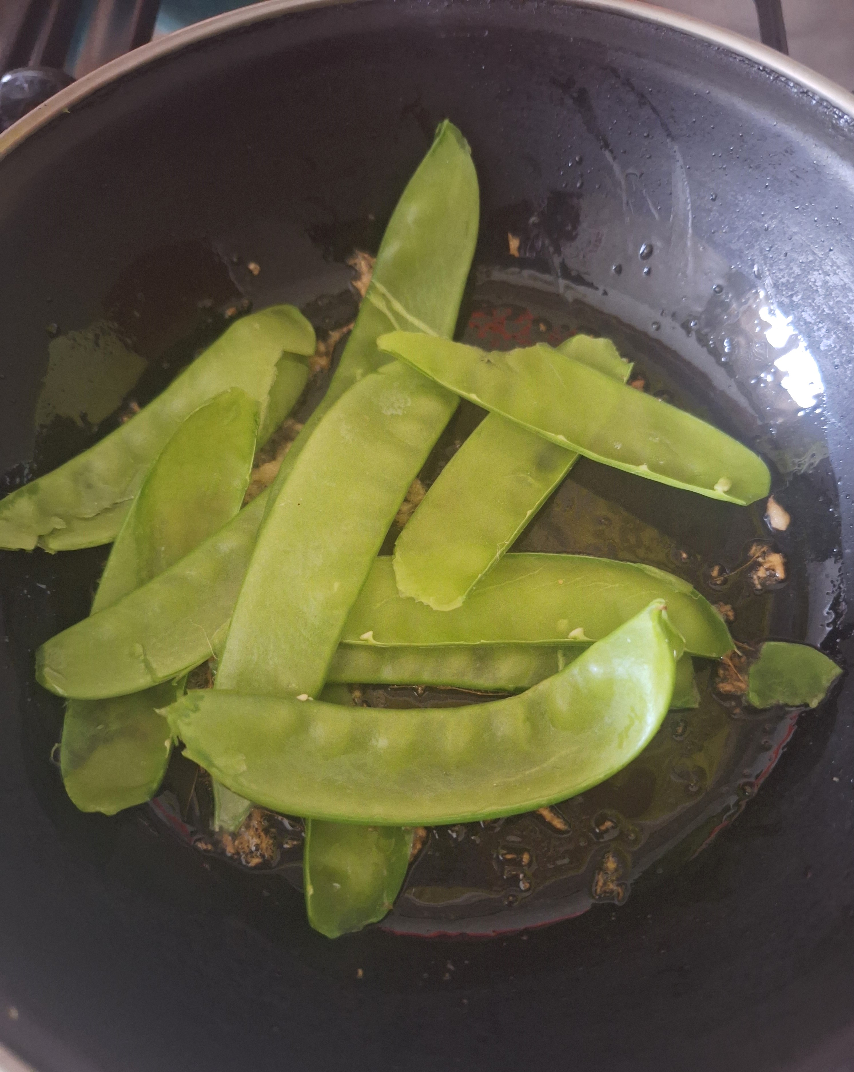 En una sartén con un poco de aceite de sésamo dora el jengibre majado a fuego bajo. Añade los tirabeques y sube el fuego, saltea hasta dorar y añade el vinagre de arroz y aminos de coco. Mezcla unos segundos y retira del fuego.