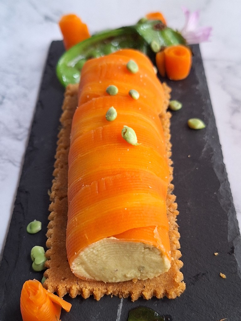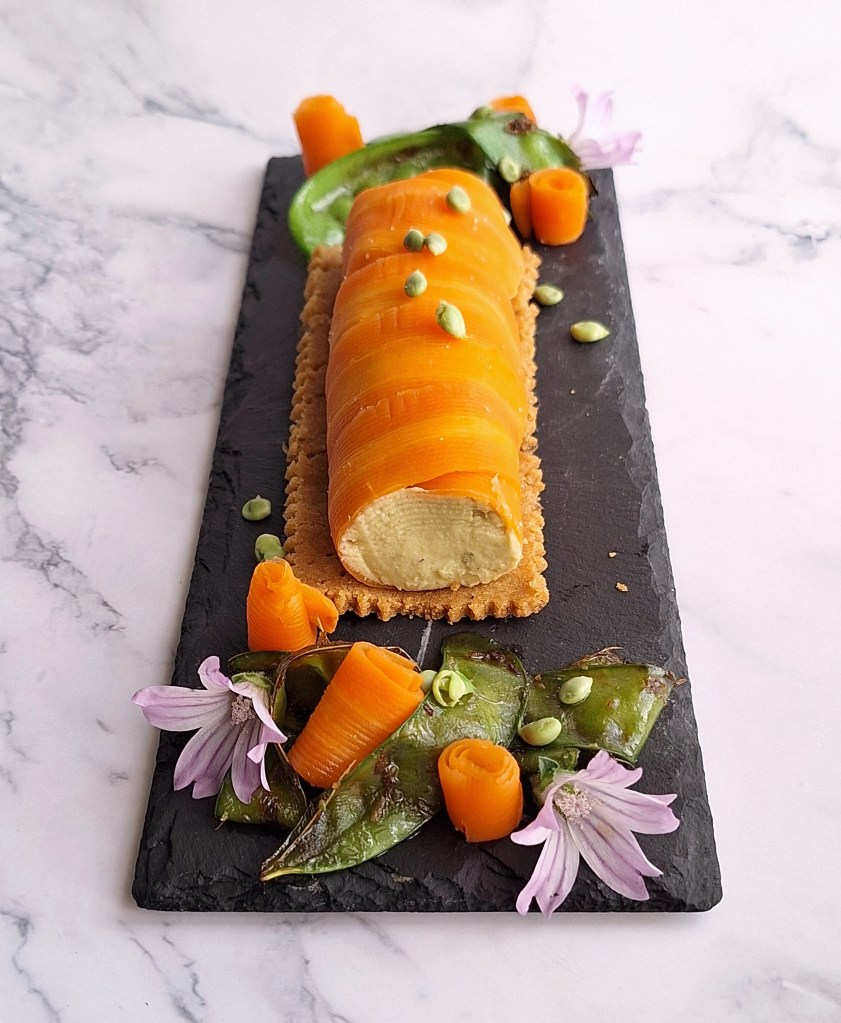 CANELÓN DE ZANAHORIA, HUMMUS DE HABAS Y TIRABEQUES