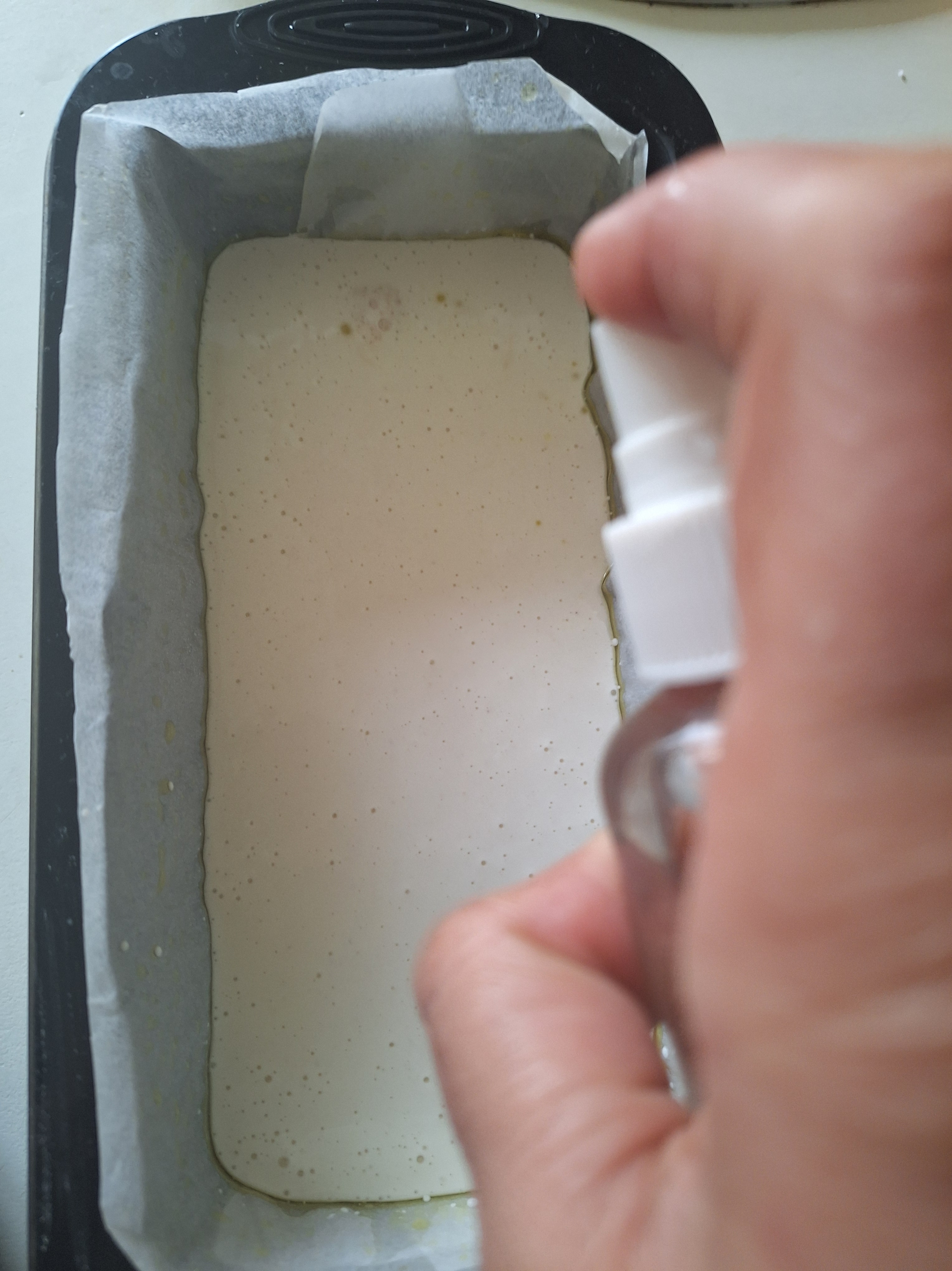 Precalienta el horno a 180ºC, vuelve a pulverizar la masa y hornea durante 55 minutos o una hora. Si ves que se dora demasiado cubre con papel albal.