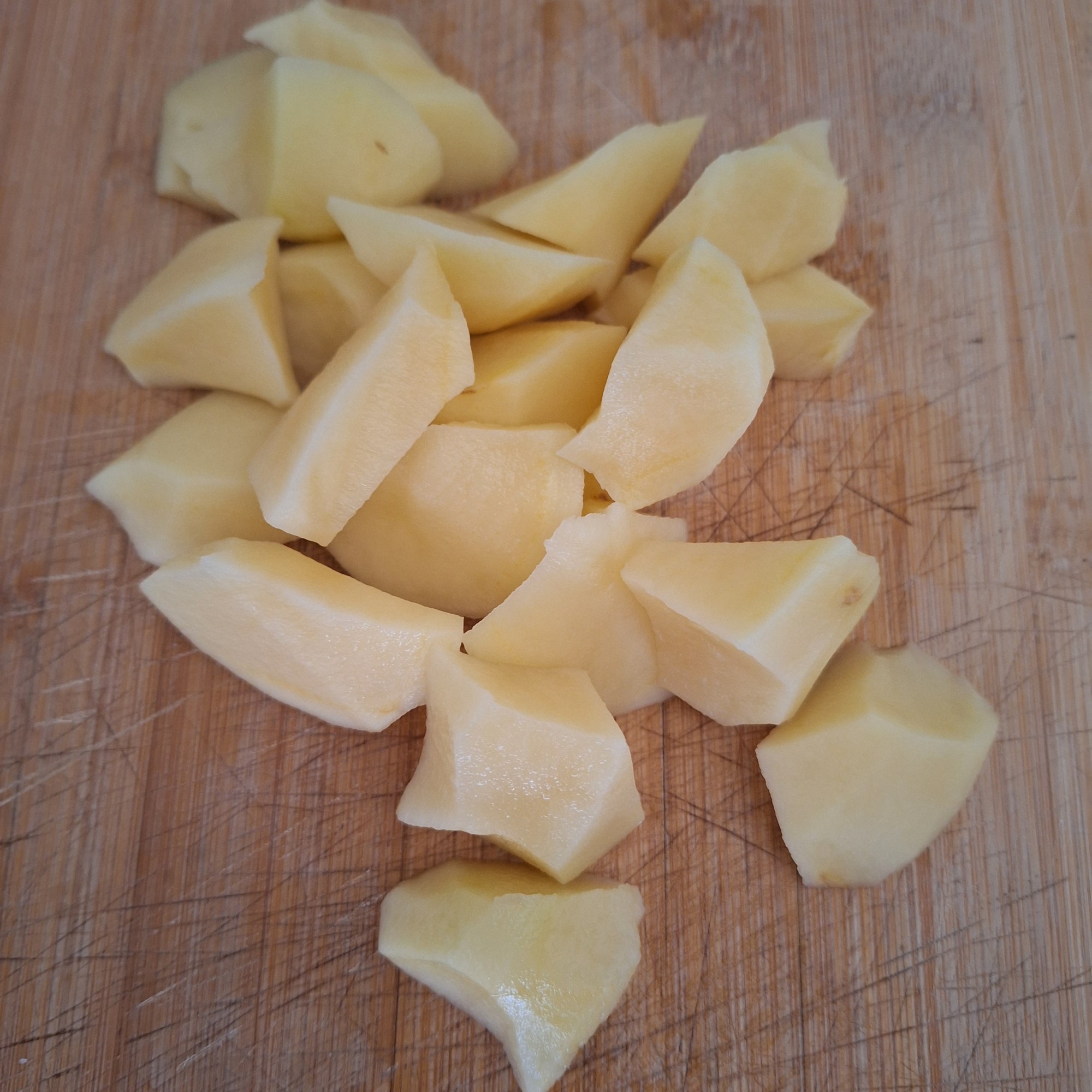 Limpia el puerro y pica en brunoise. Pela la patata y corta en cachelos. Retira las hojas externas de la alcachofa, corta las puntas y el corazón en seis partes.