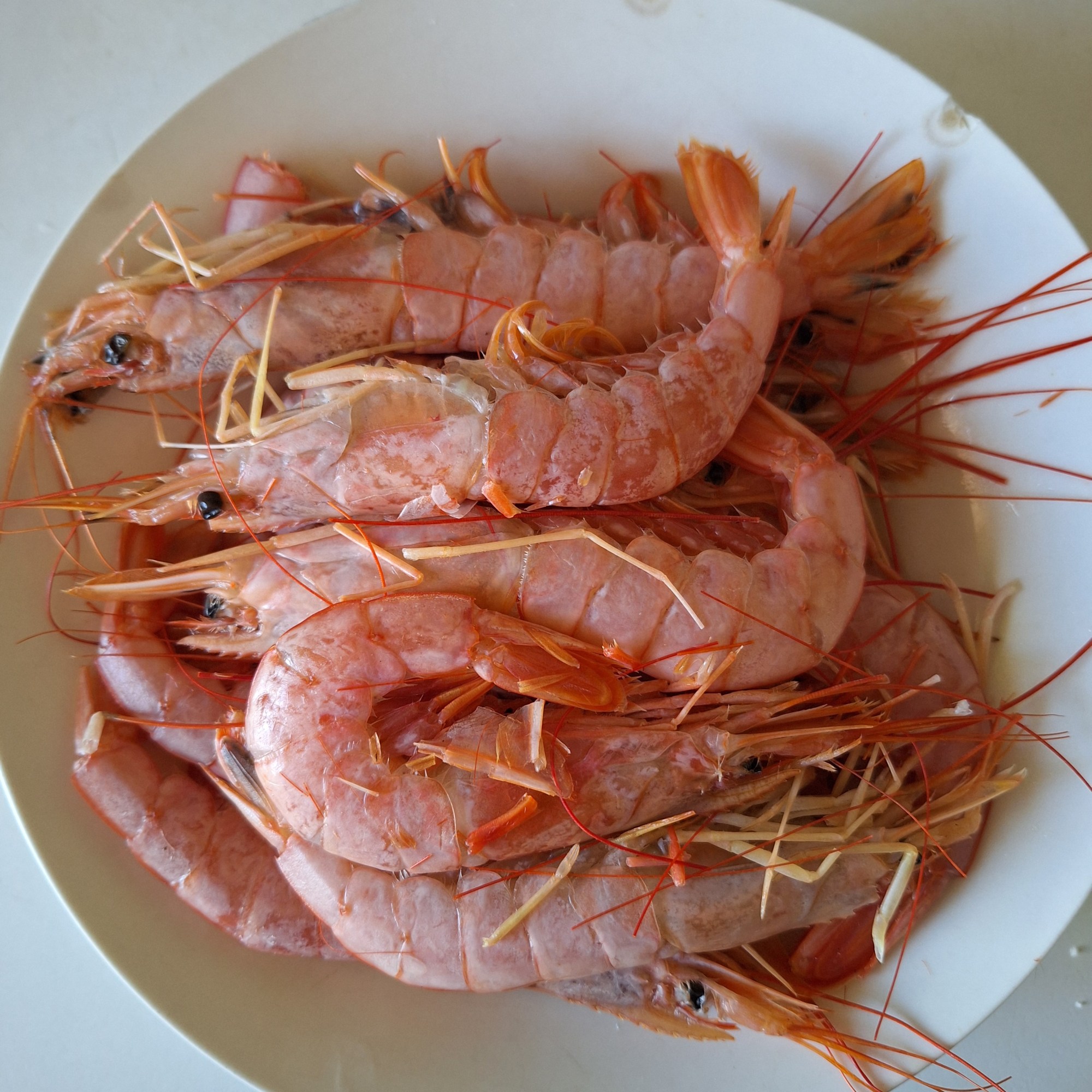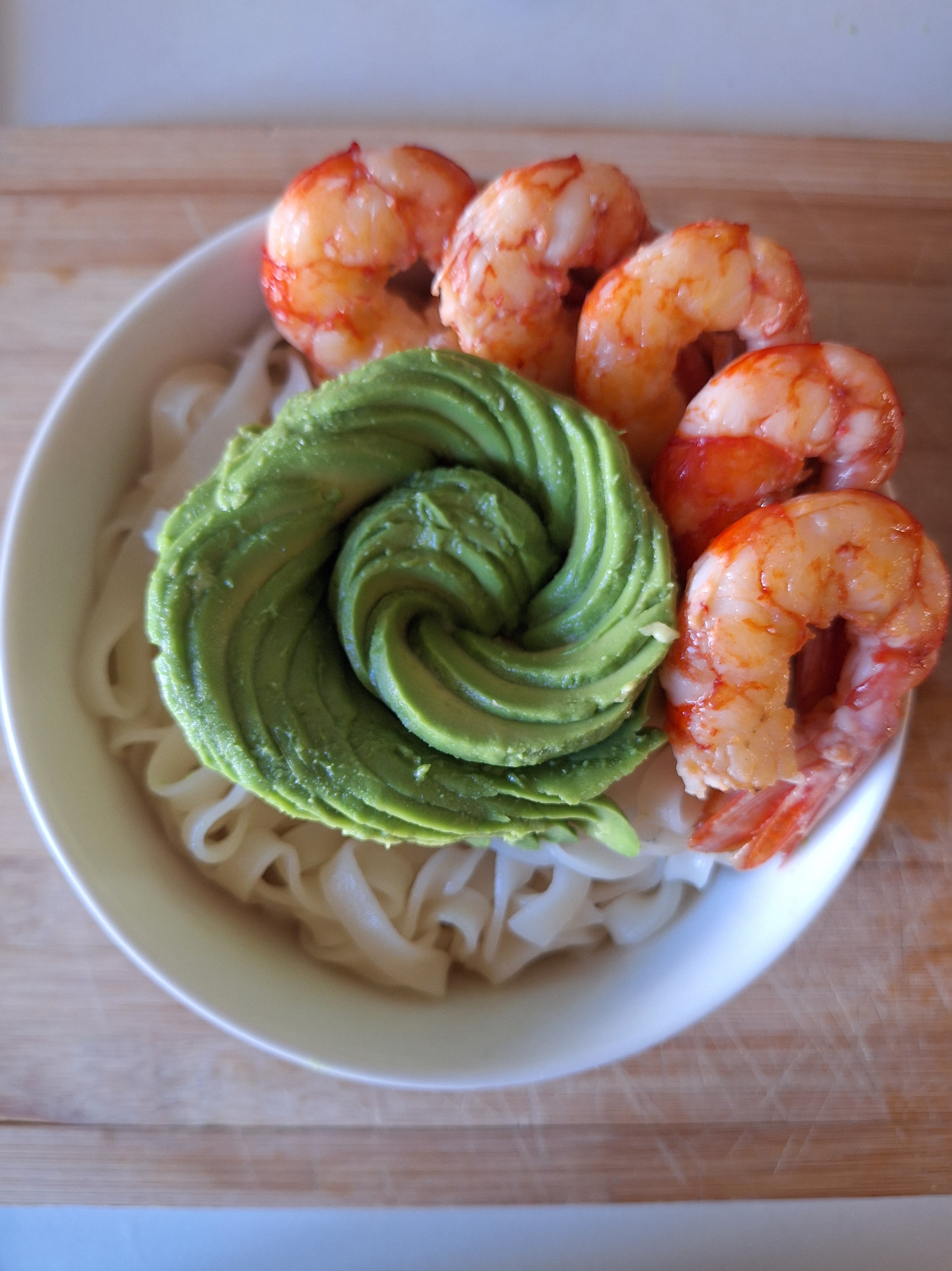 Pela los gambones, dejando únicamente la cáscara en la cola. Cuece las cáscaras durante unos 30 minutos. Cuela y cuece los tallarines siguiendo instrucciones del fabricante. Deja enfriar y añade un chorrito de aceite de sésamo para que no se peguen.