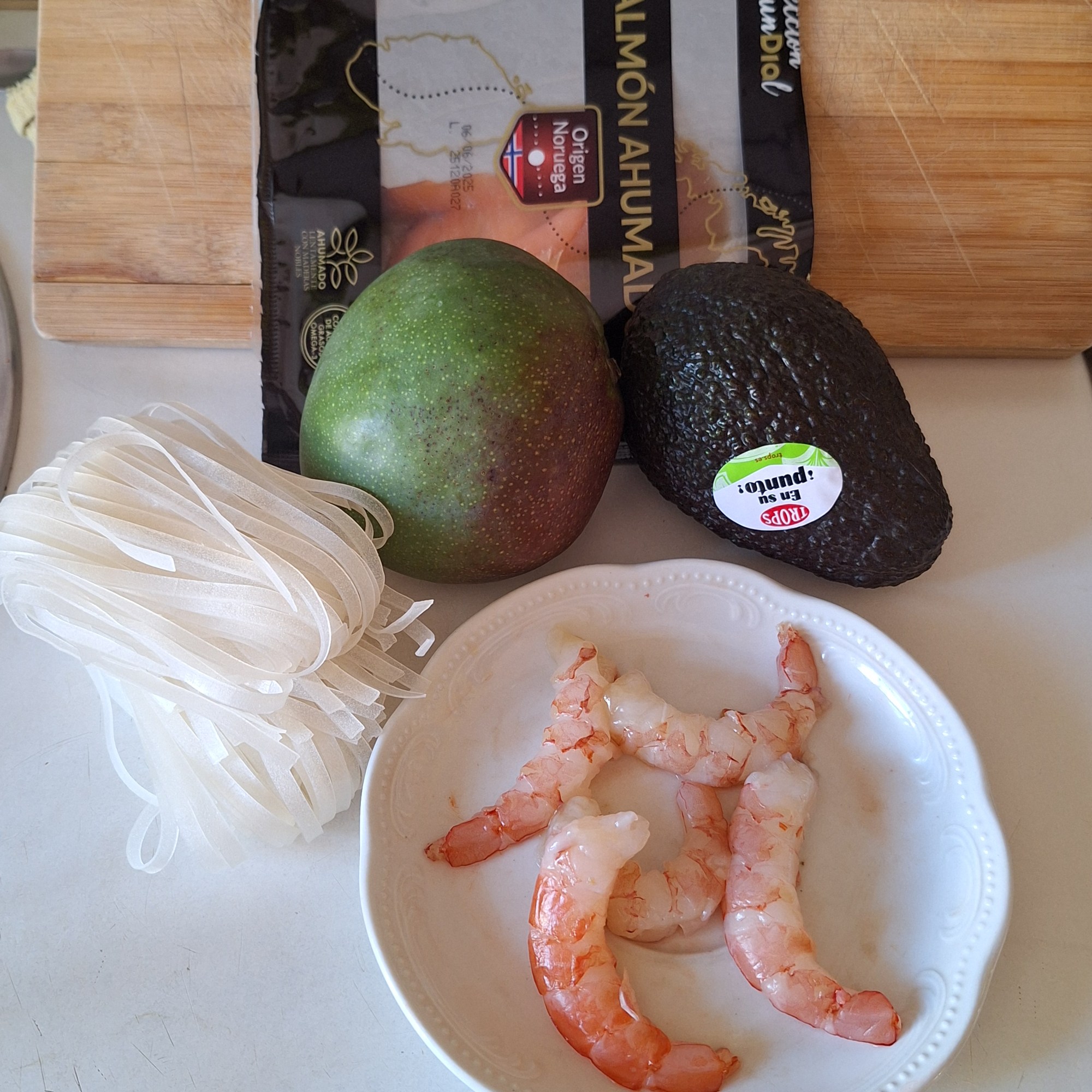 Corta el mango en cubos pequeños. Corta el salmón en tiras y enrolla. Dora los gambones a fuego bajo en un poco de aceite de sésamo, un par de minutos por cada lado.