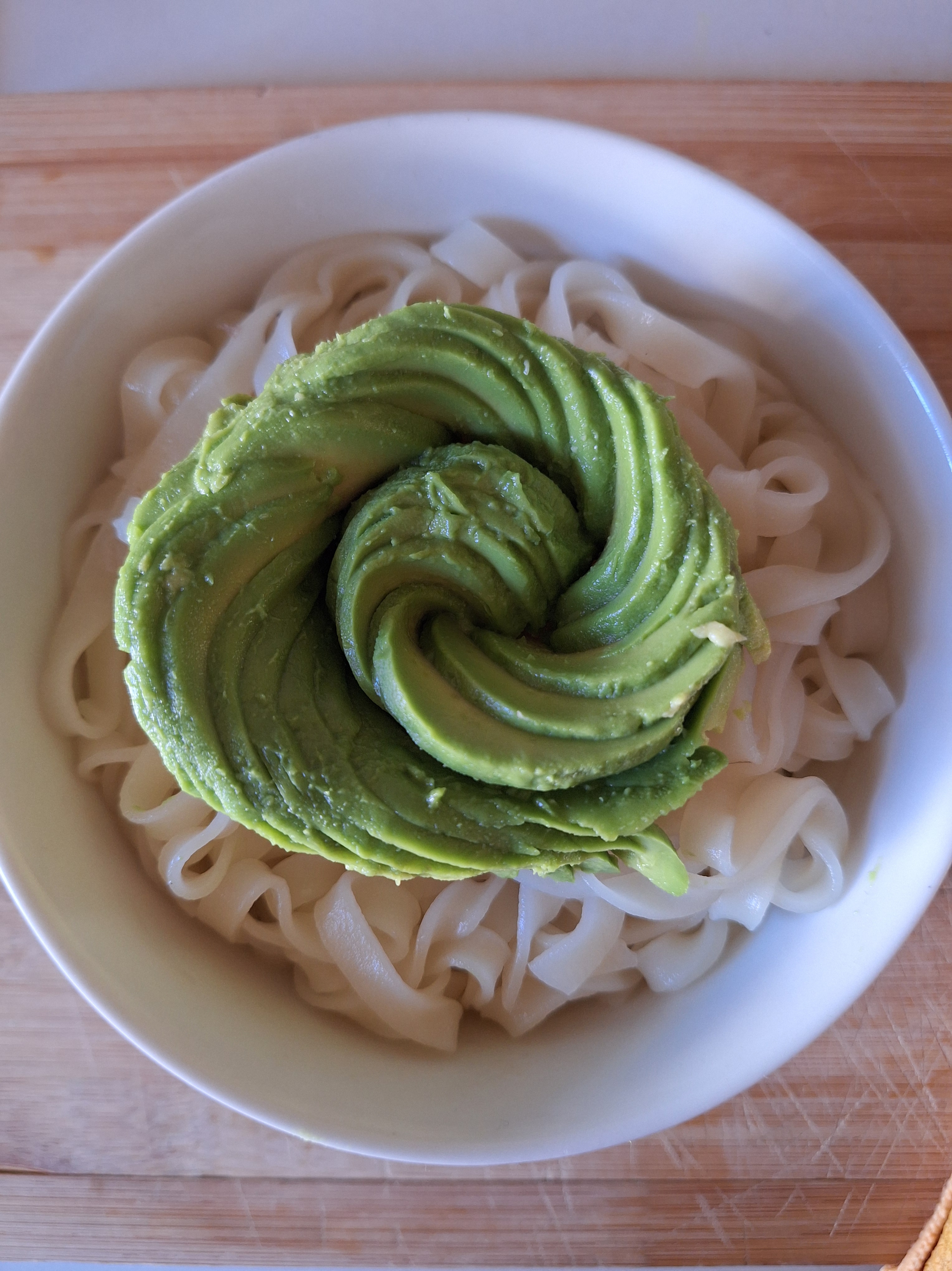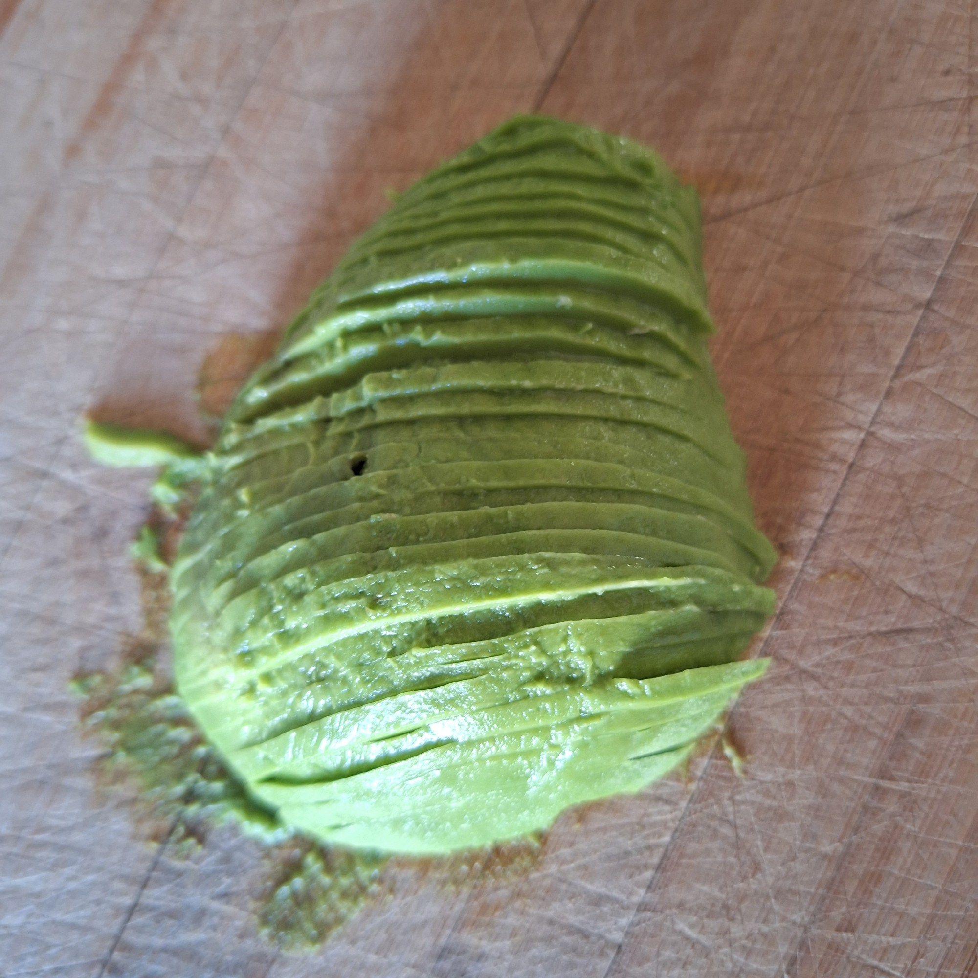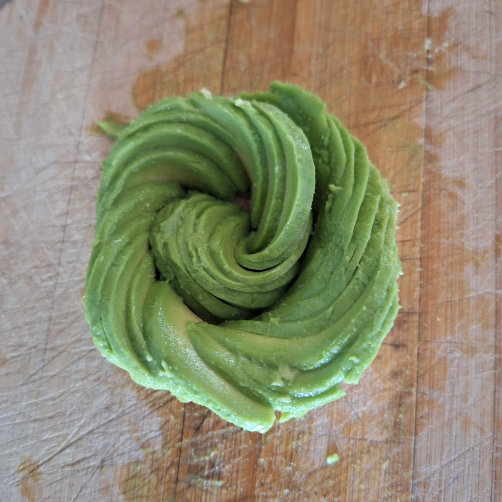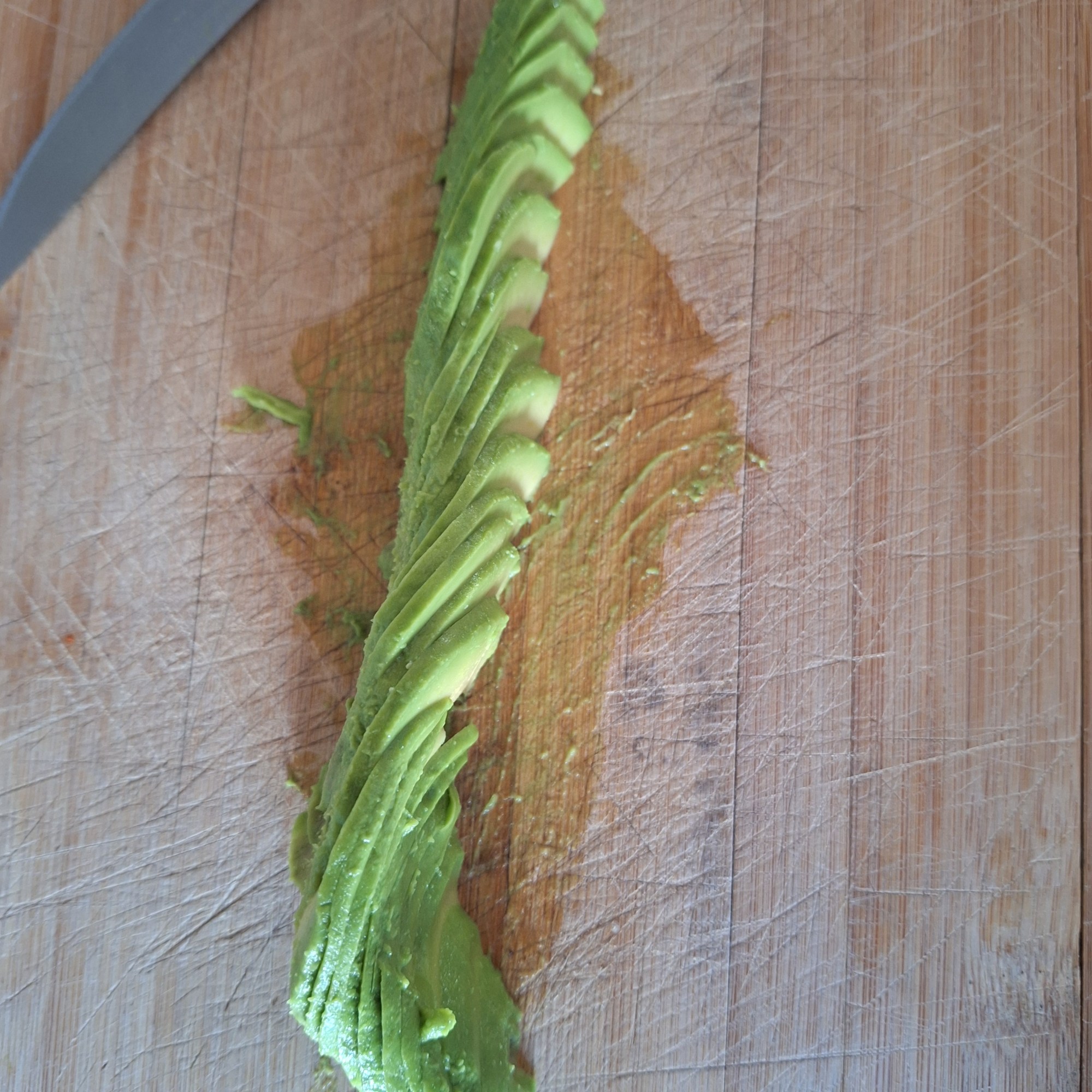Corta el aguacate a la mitad y después en láminas paralelas finitas. Extiende las láminas con cuidado (según la fotografía) y enrolla sobre sí mismas para hacer una rosa.