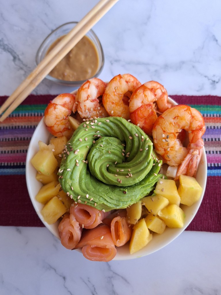 Hoy en día es una receta muy extendida que incluye entre sus ingredientes carbohidratos (arroz o quinoa), pescado y/o gambas (aunque también podéis utilizar pollo o tofu para las versiones veganas), verduras y hortalizas (lechuga, kale, espinacas, tomate, pepino, rabanitos, cebolla, zanahoria, maíz), frutas (mango, piña, aguacate), algas y un aderezo (salsa de soja, aceite de sésamo, zumo de lima, salsa ponzu). Así que echad mano de vuestra imaginación y probad cuantas versiones se os ocurran. Aquí os traigo la mía de salmón y gambones.