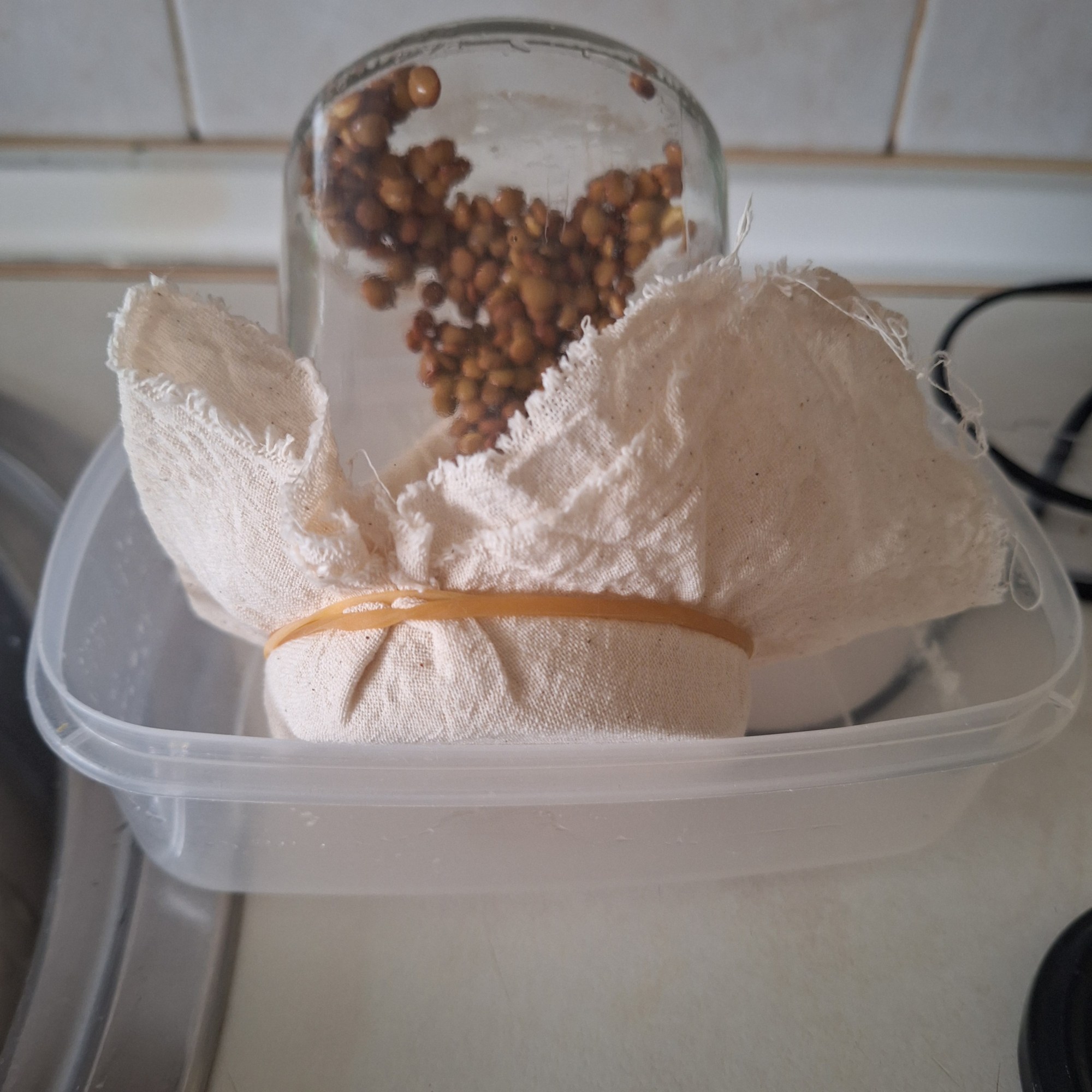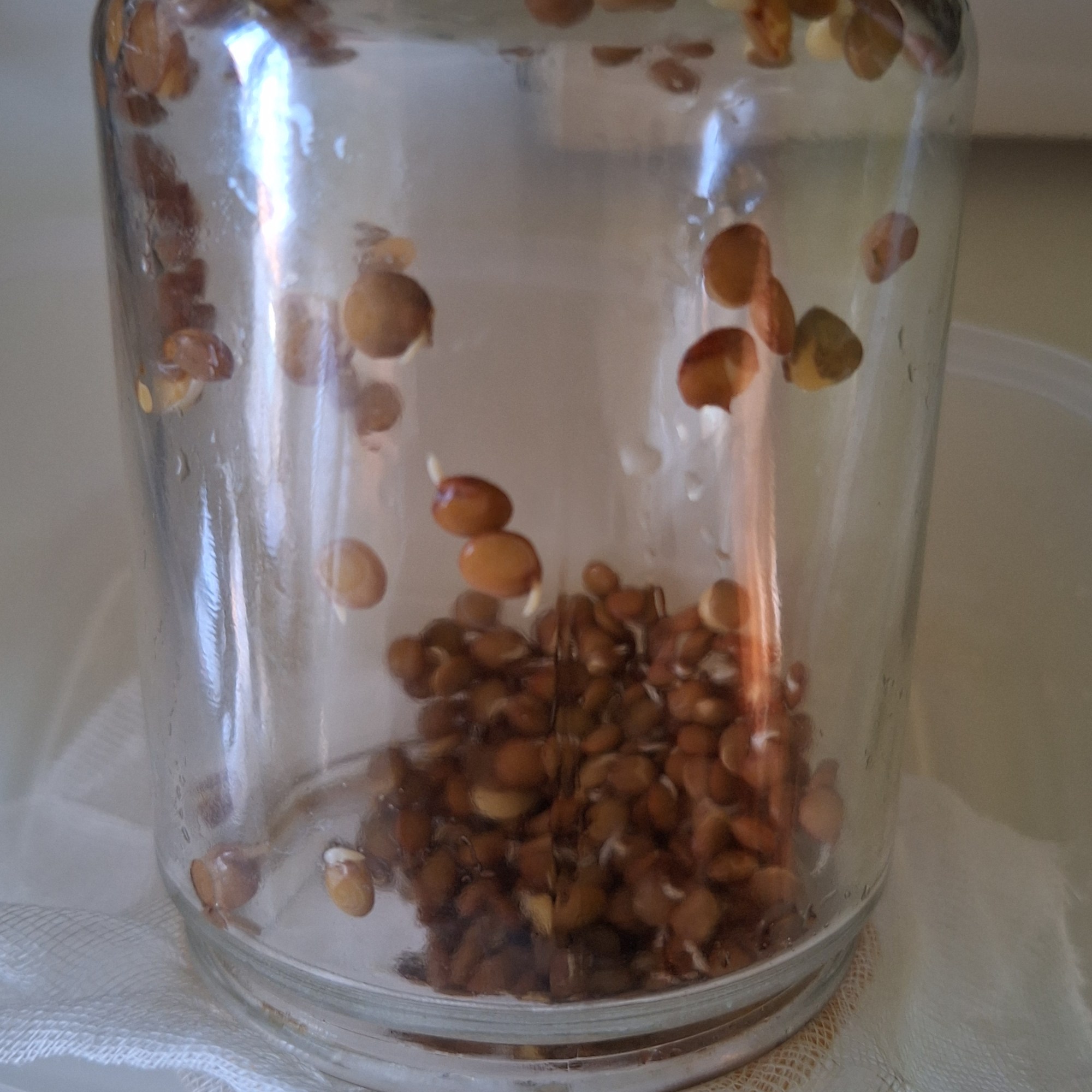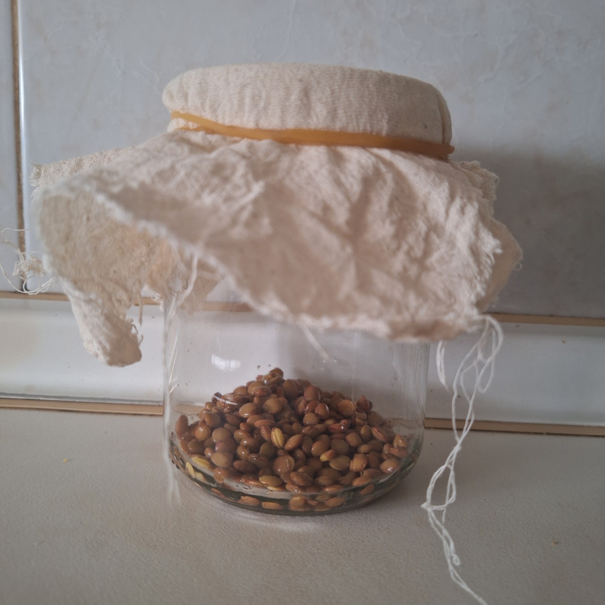 Para los germinados: vierte las lentejas en un recipiente grande, cubre con agua y deja en remojo toda la noche. Al día siguiente aclara las lentejas, escurre e introduce en un frasco grande de cristal. Cubre con la gasa, sujeta con la goma y coloca en un recipiente en un ángulo de 45º. Guarda en lugar fresco y seco (en mi caso en un armario). Cada 12 horas llena el frasco con agua, escurre, cambia de gasa y guarda de nuevo. Repite el proceso 3 días. Pasado este tiempo las lentejas habrán empezado a germinar. Repite el proceso, esta vez en un lugar donde le de la luz para que las hojitas se pongan verdes.