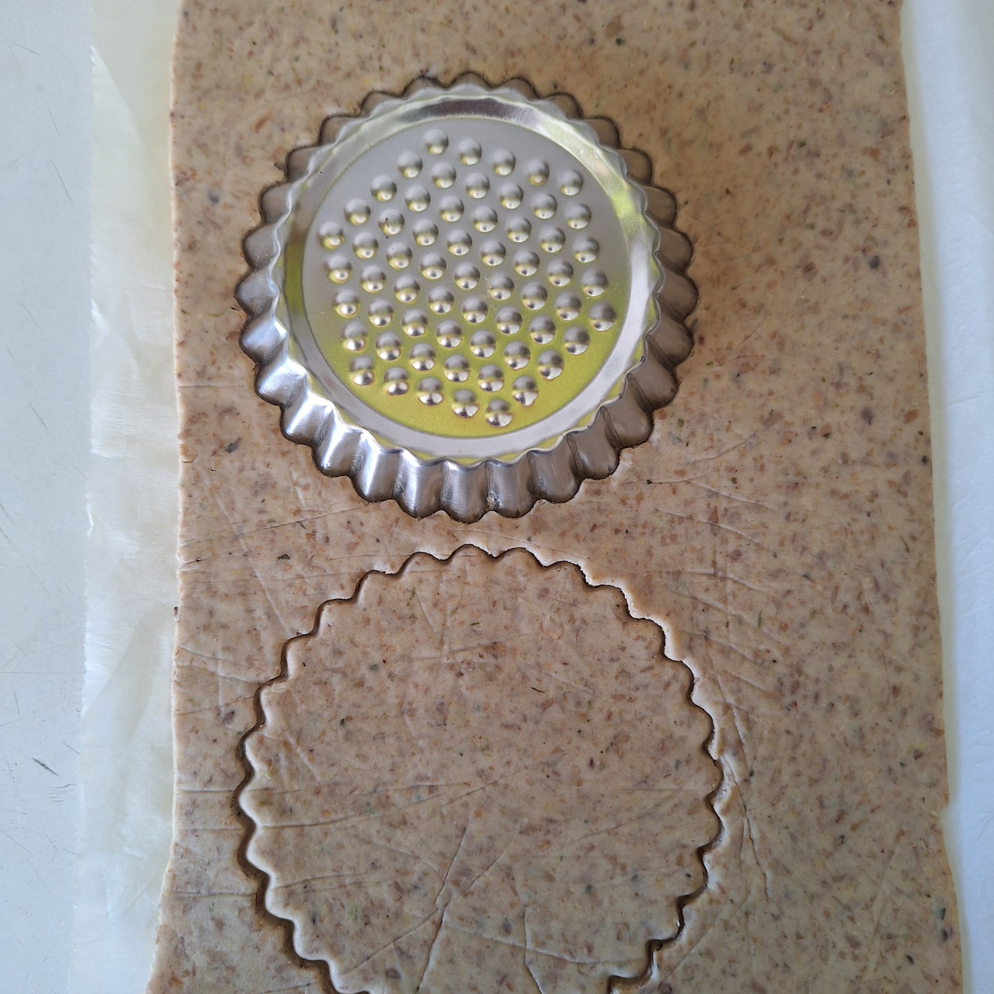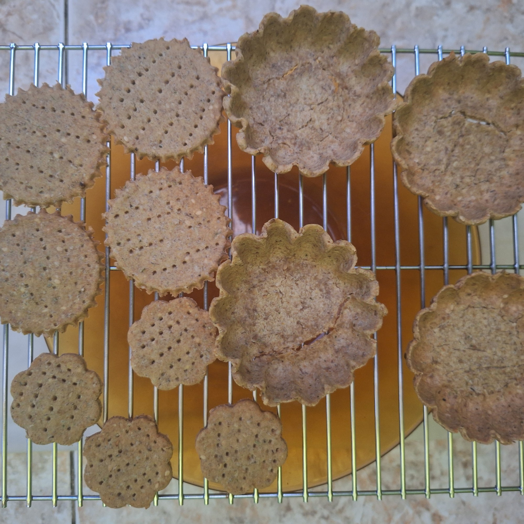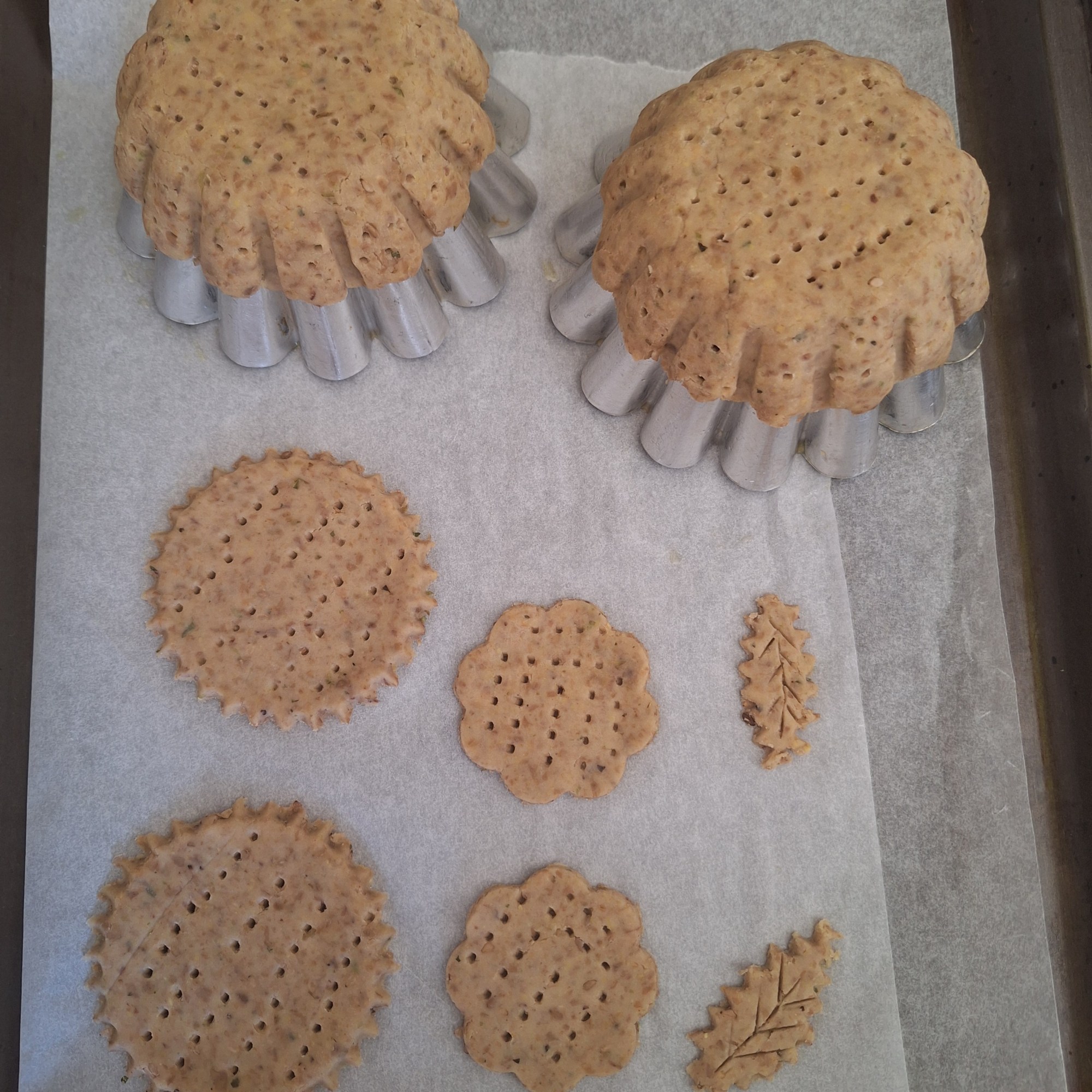 Precalienta el horno a 180ºC. Engrasa una flanera del revés con un poco de aceite y coloca con cuidado la masa, aplastando para dar forma y marcando las líneas con el mango de un cuchillo (no la extiendas demasiado para que no se rompa…). Pincha los crackers con un tenedor y hornea unos 15-20 minutos (hasta que empiecen a dorarse). Coloca sobre una rejilla para que se enfríen por completo.