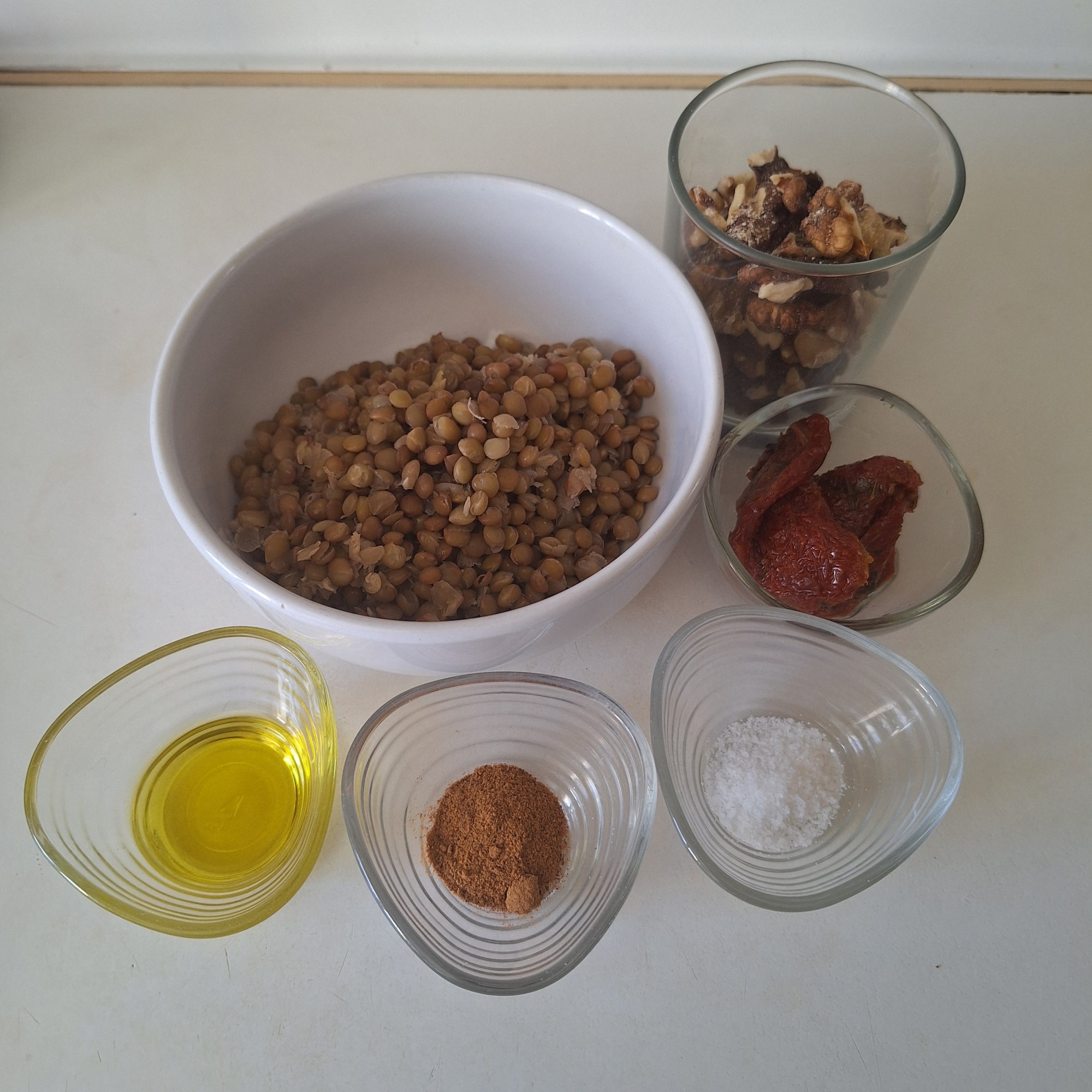 Pon 150 gr de lentejas en remojo en un recipiente con abundante agua durante toda la noche. Al día siguiente aclara y cuece en agua con un poco de sal hasta que estén tiernas. Escurre.