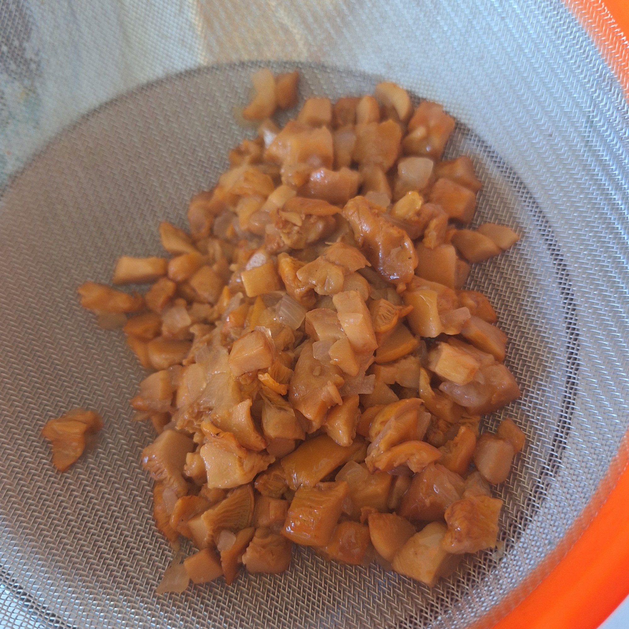 Para el relleno y crema de chantarelas: limpia las setas y corta en trozos pequeños, pero no demasiado. Corta la cebolla en brunoise y pocha en un poco de aceite. Cuando empiece a transparentar agrega las chantarelas y cocina hasta que estén tiernas. Coloca en un escurridor para eliminar el exceso de aceite.