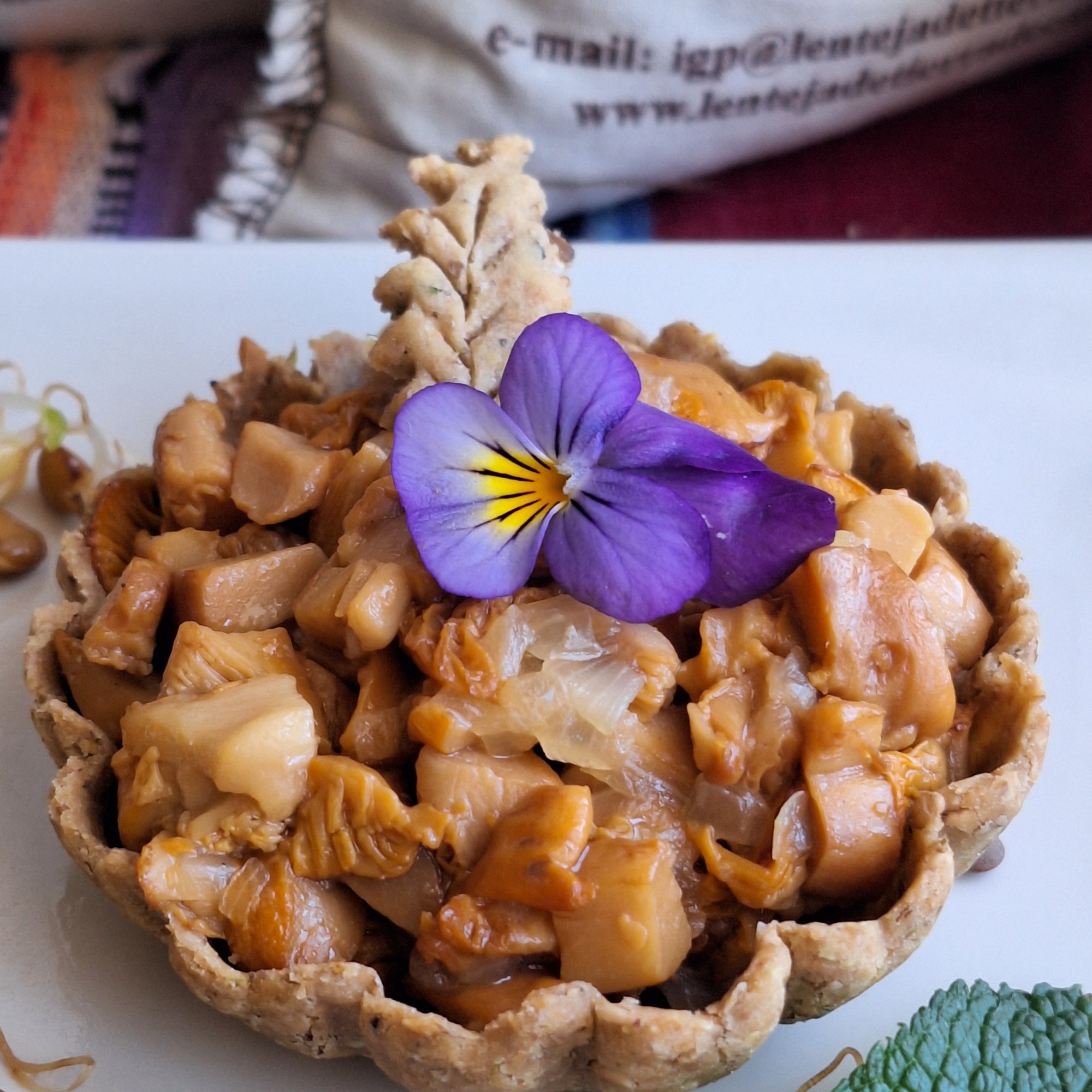 Emplatado: rellena las cestitas con las chantarelas y la cebolla. Tritura el sobrante para hacer una especie de crema. Coloca una bola de paté sobre los crackers de tamaño mediano. Cubre el cracker más pequeño con una capa de crema de chantarelas y una bolita de paté. Termina de decorar el plato con los brotes aliñados y unos pensamientos para darle color.