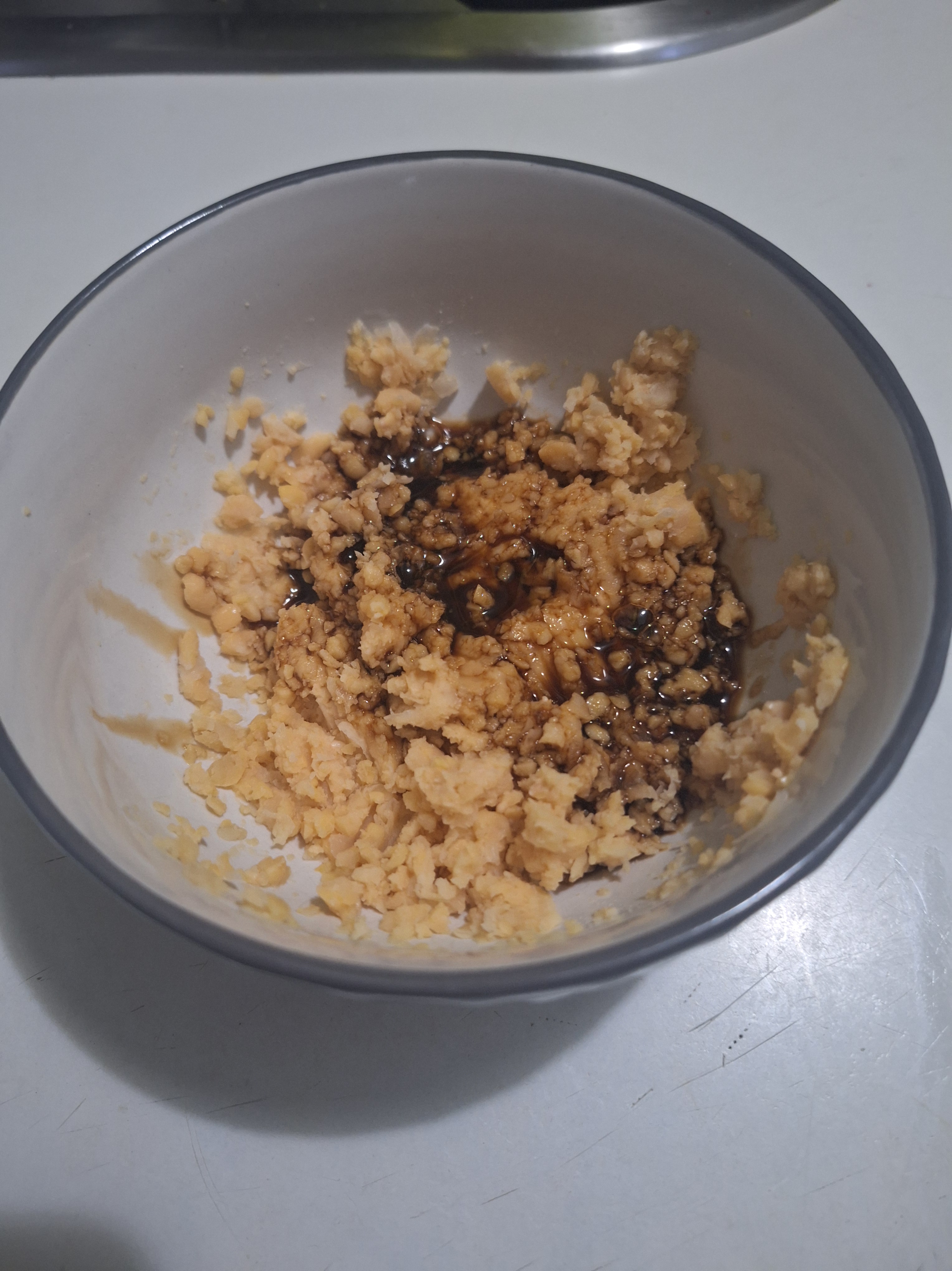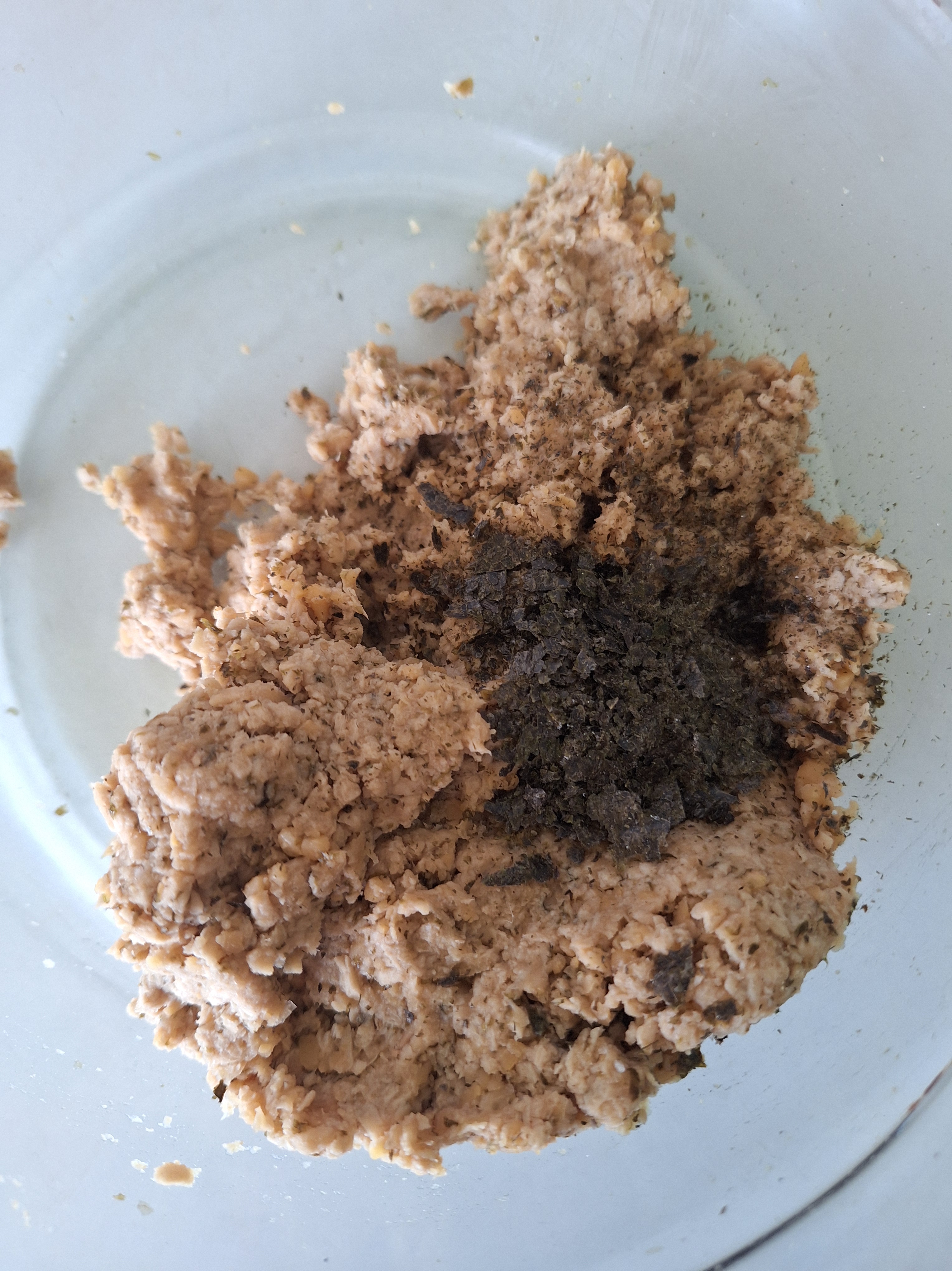 Calienta la mitad del alga para que se seque un poco más y tritura en un molinillo de café hasta hacerla polvo. Mezcla los garbanzos con aminos de coco y tritura con un tenedor.