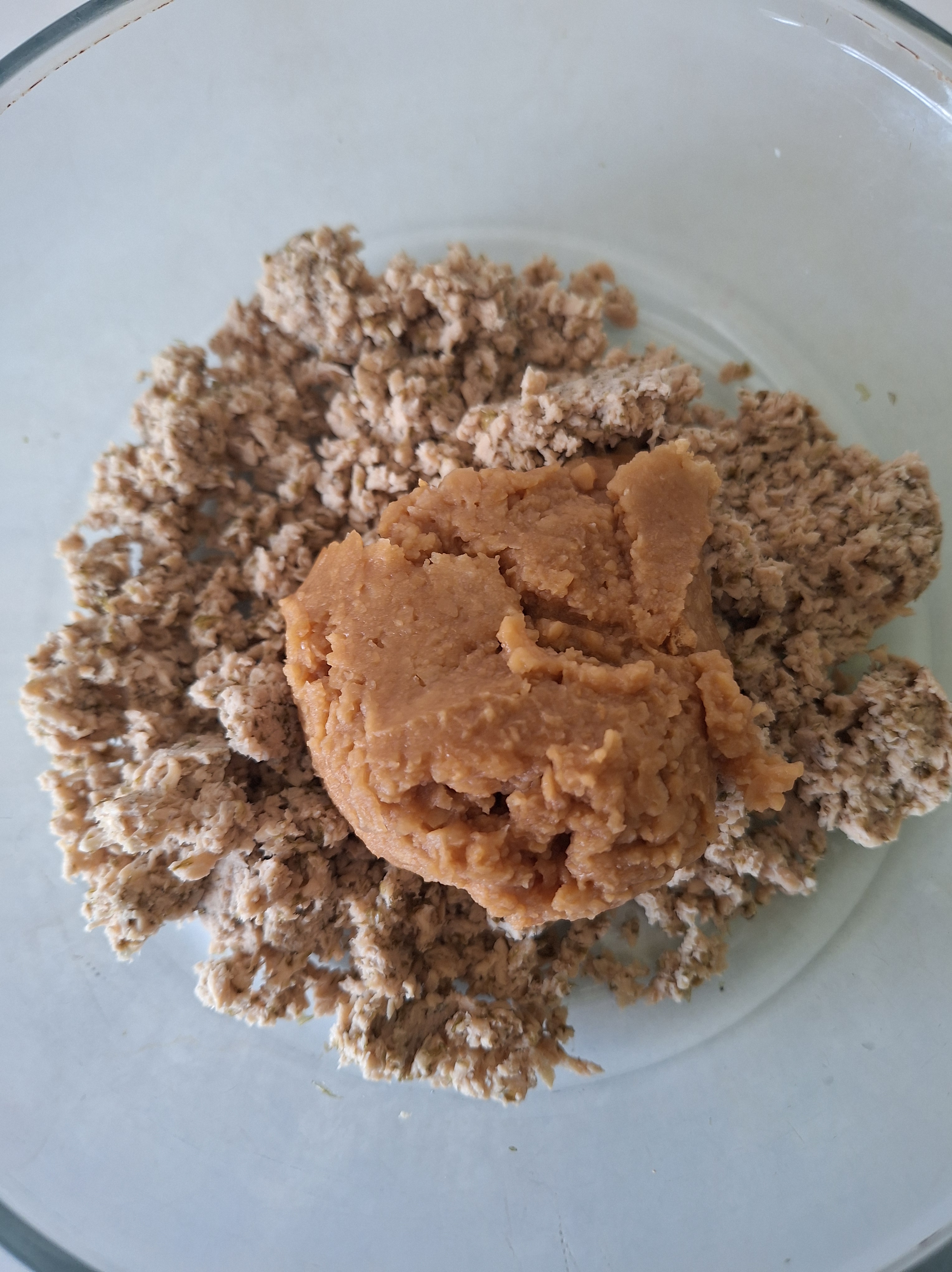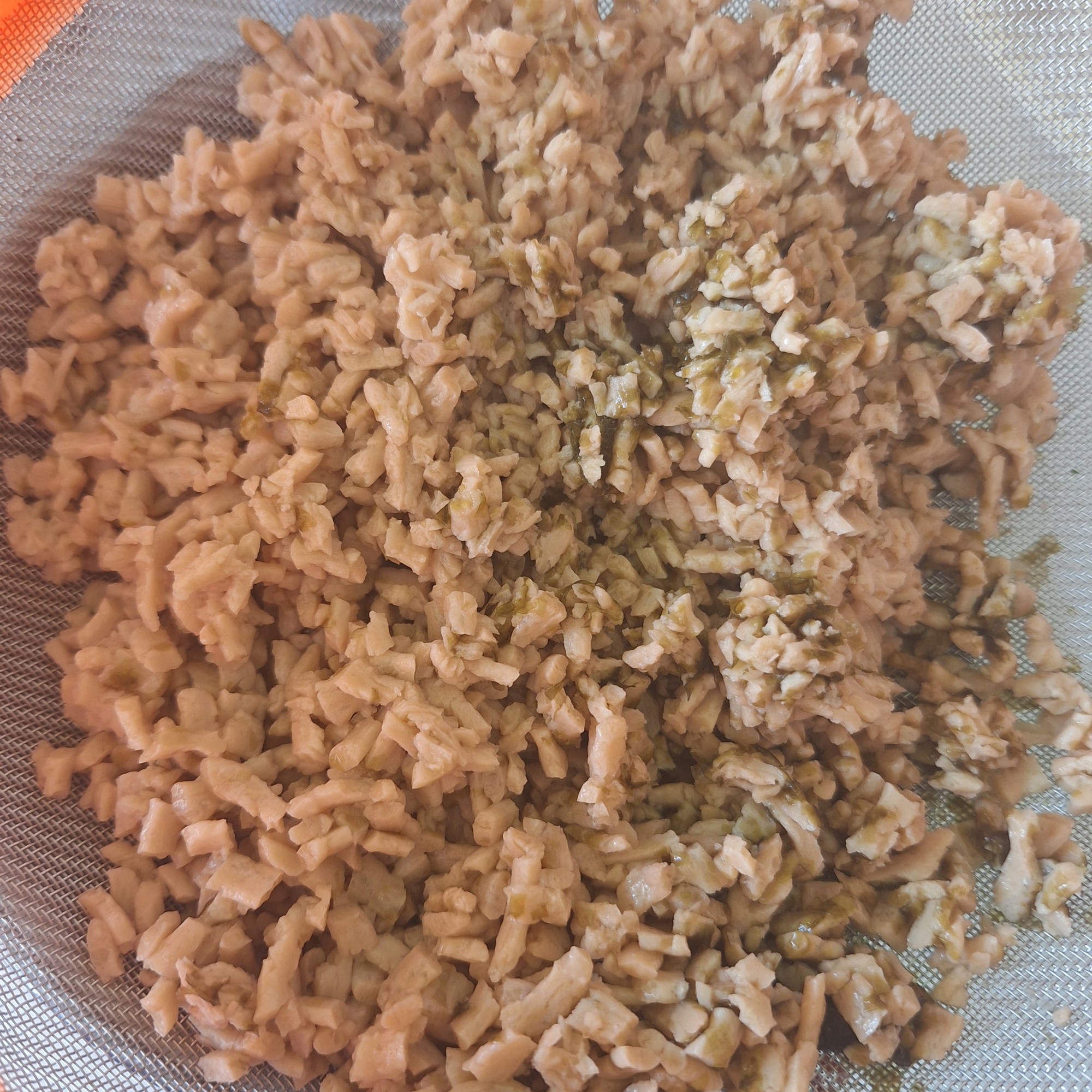 Llena una cazuela con 250 ml de agua, pica el cuarto de alga finamente y lleva a ebullición. Retira del fuego, añade el texturizado y deja que se hidrate (yo lo dejé toda la noche). Cuela y retira el máximo posible de agua, estrujando con las manos. Reserva.