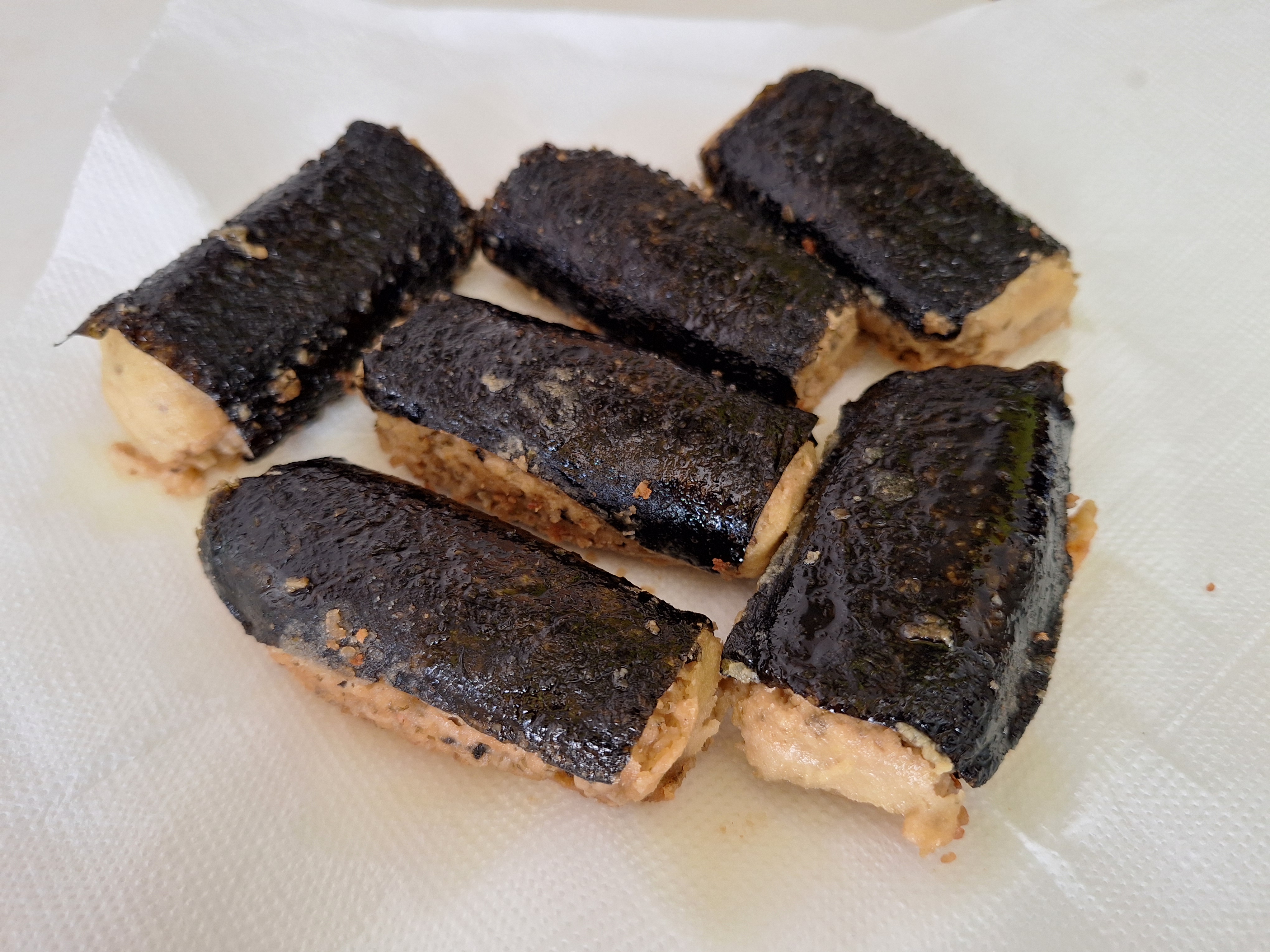 Fríe en abundante aceite a fuego bajo. Ten cuidado de que no se abran porque empezará a saltar el aceite como si fuera pescaíto frito. Coloca sobre papel absorbente para retirar el exceso de aceite.
