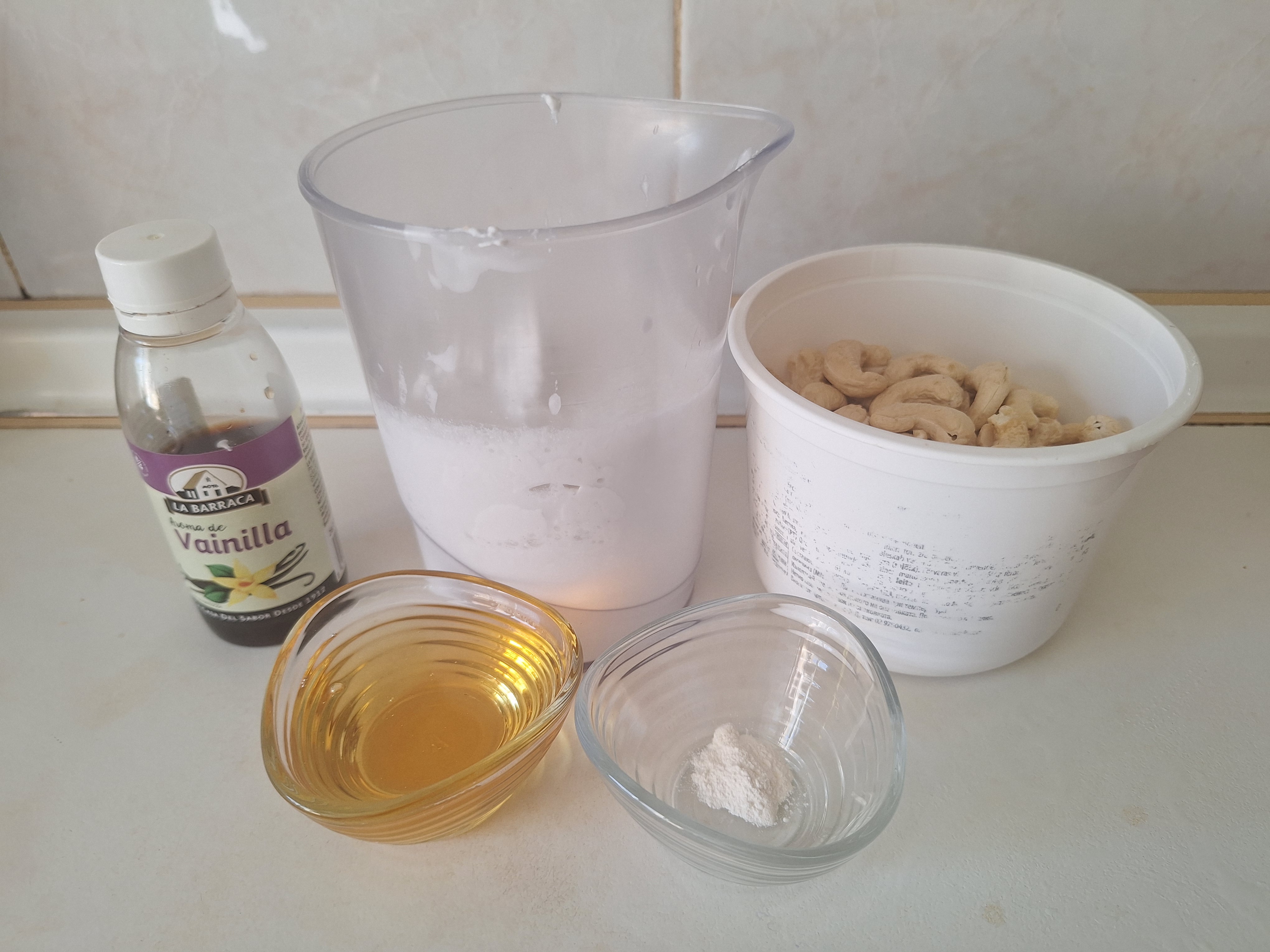 Guarda la leche de coco en la nevera durante toda la noche. Vierte los anacardos en un recipiente, cubre con agua y deja en remojo durante toda la noche.