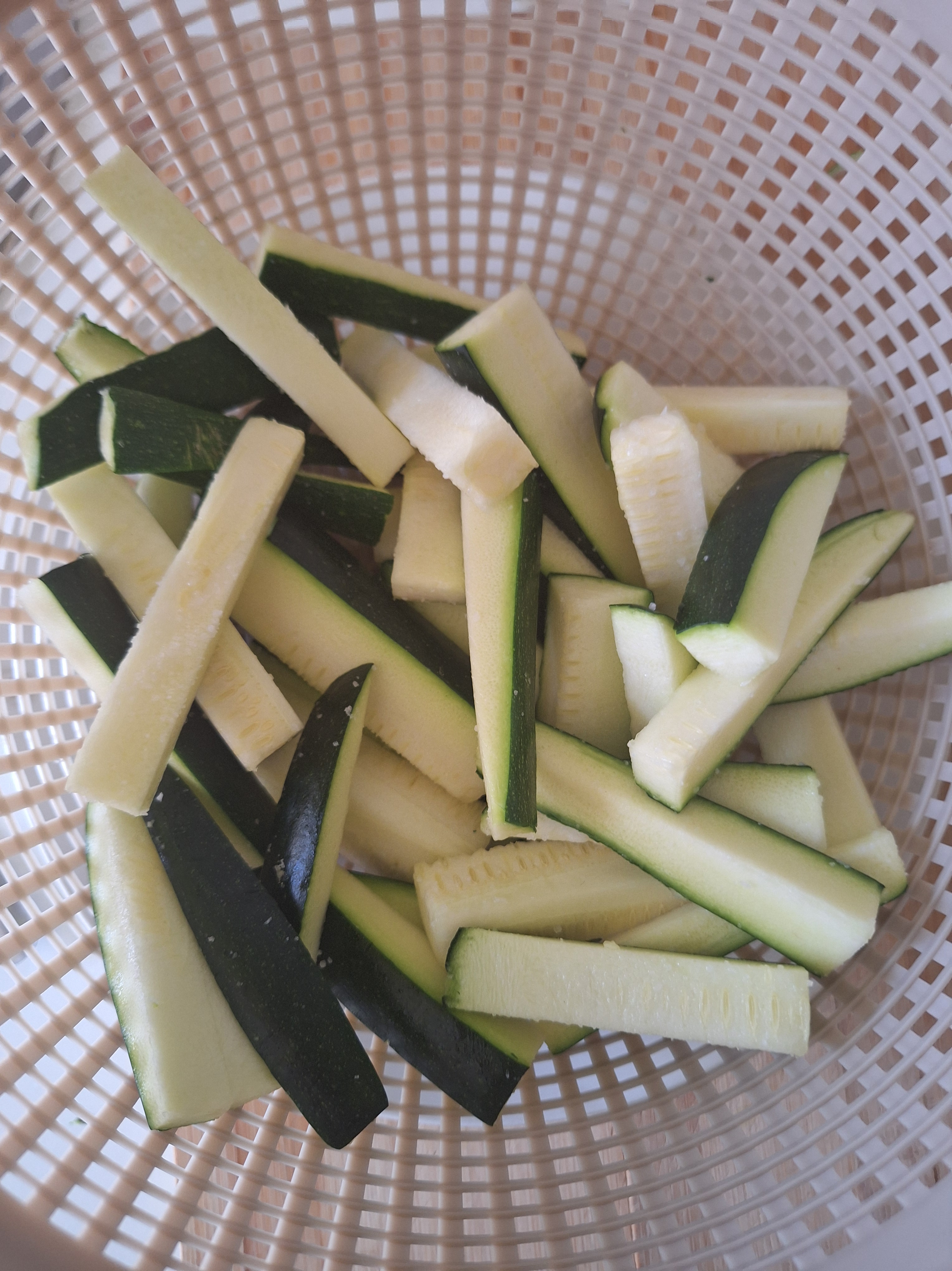 Lava bien el calabacín y corta en bastones de 1 cm de grosor. Coloca en un colador, sazona y deja que sude por 30 minutos.