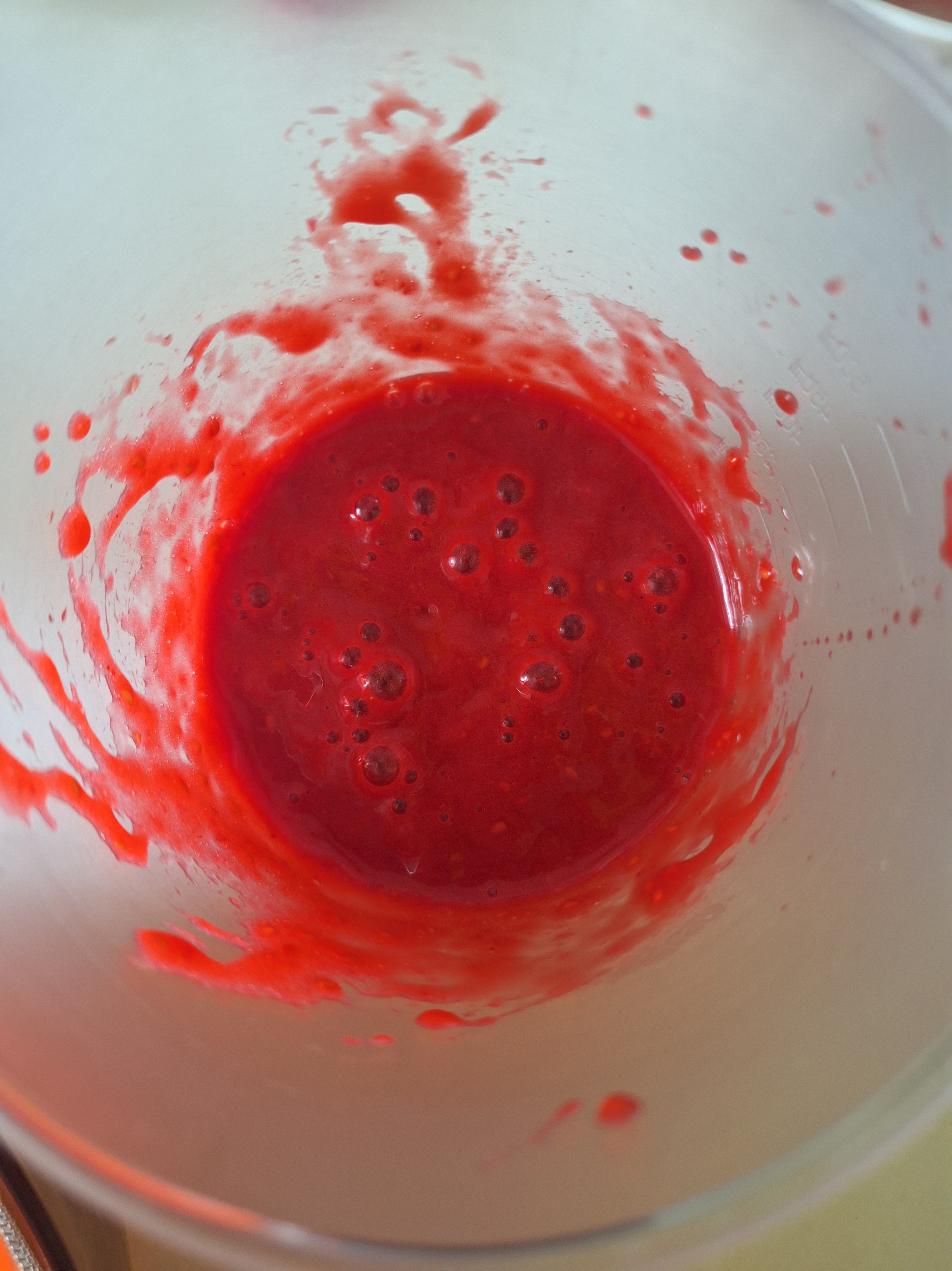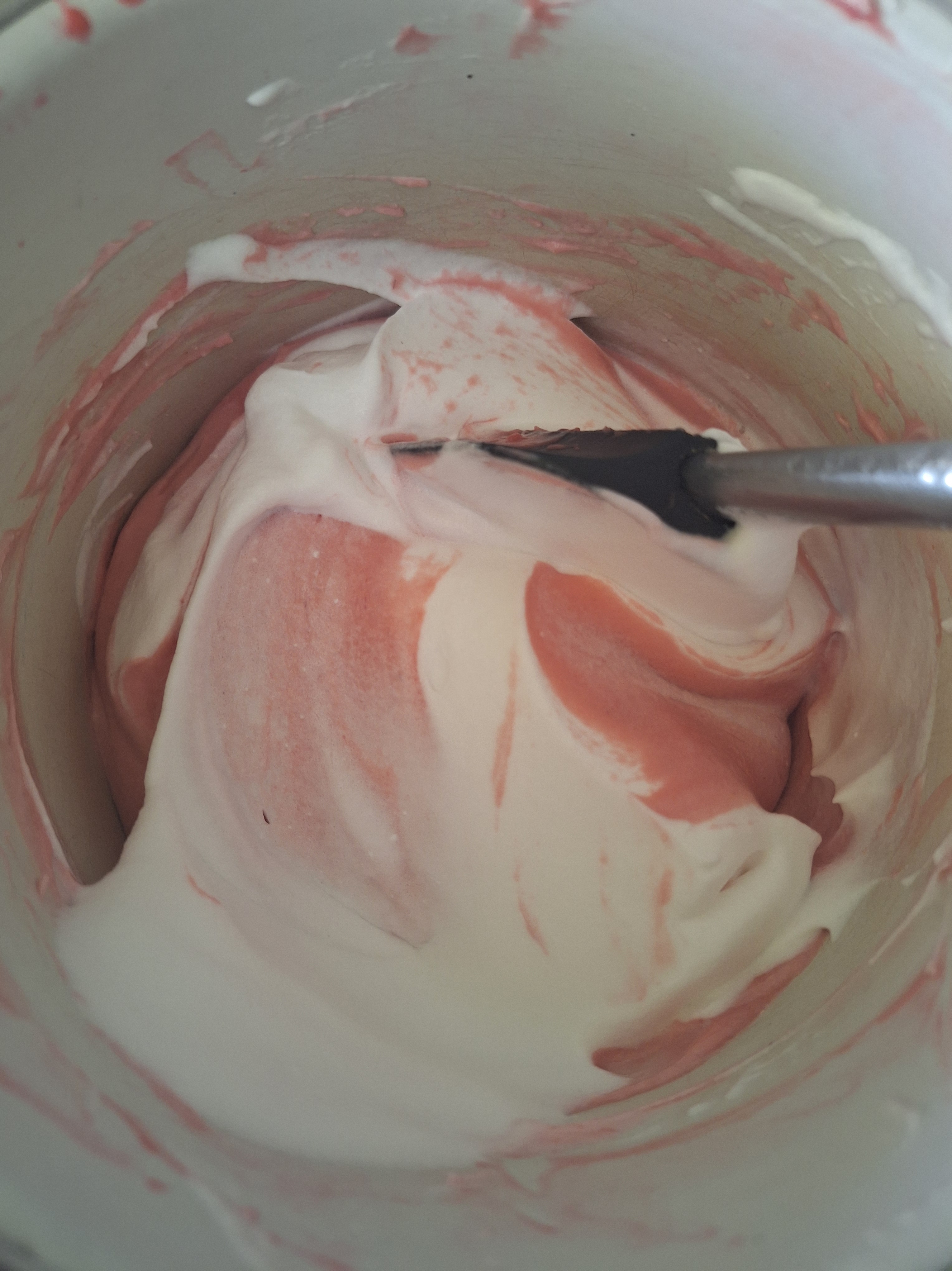 Una vez fría, vierte la crema en un recipiente y tritura con la batidora para aligerar su consistencia. Monta el resto de la nata durante unos minutos sin que llegue a hacer picos y añade un par de cucharadas a la crema de frambuesa. Integra muy bien. Añade el resto, vierte en un recipiente y lleva al congelador.