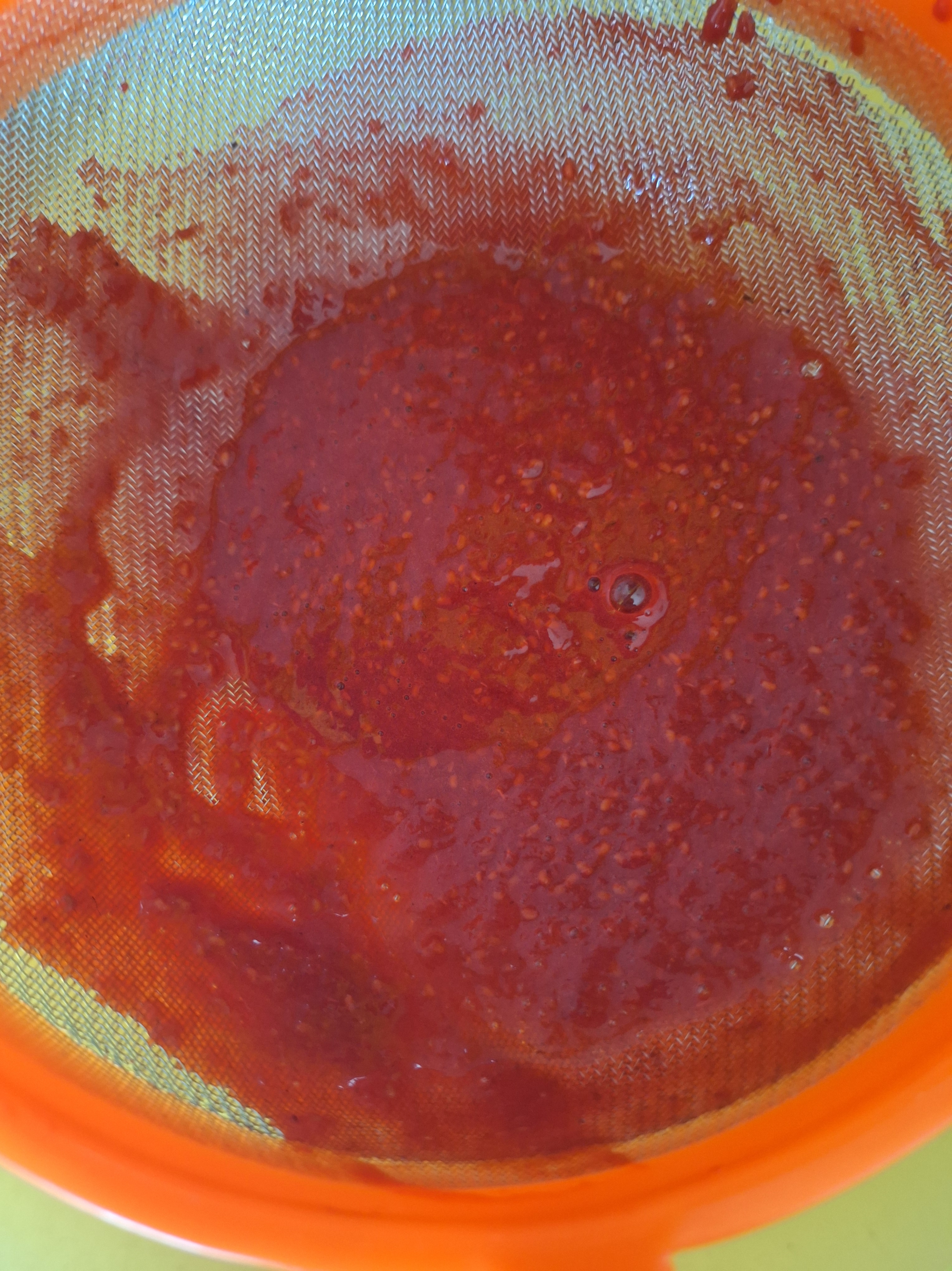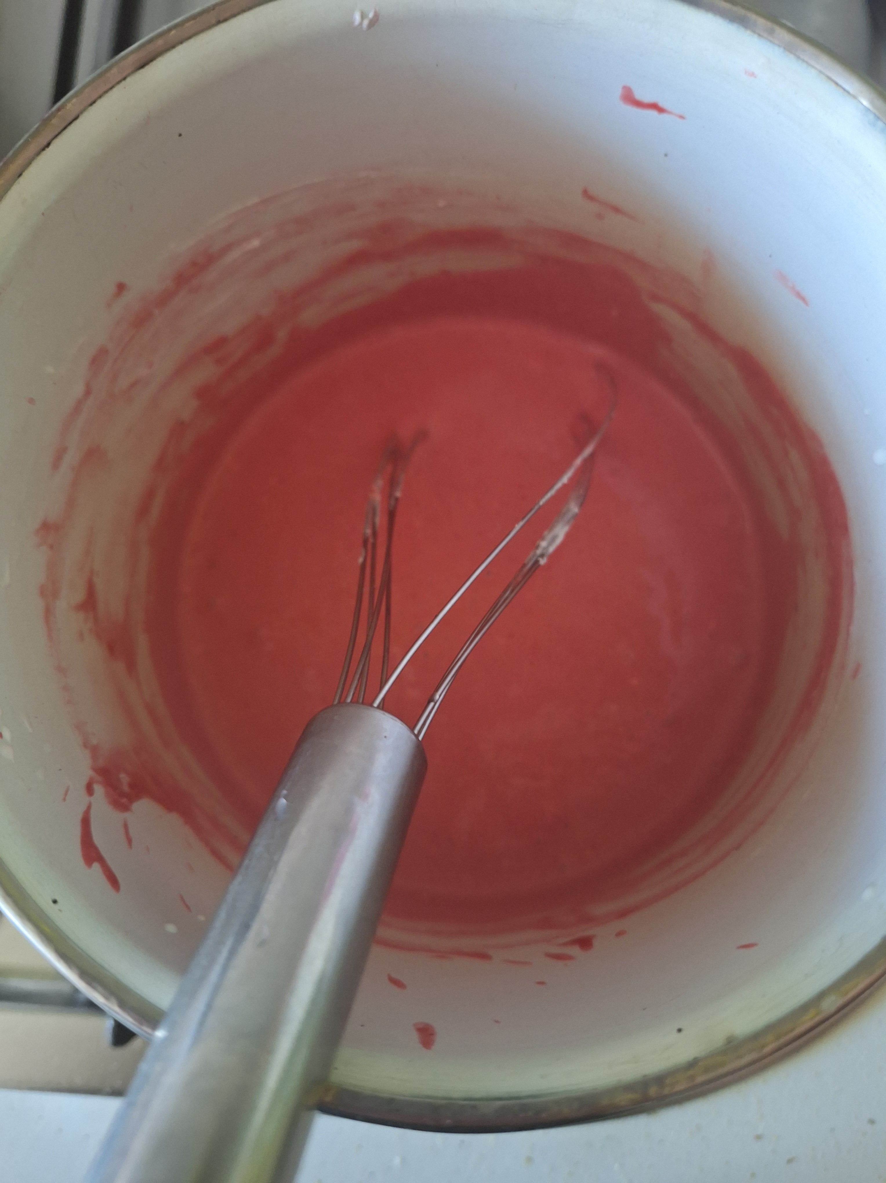 Lava las frambuesas, tritura y cuela para retirar las semillas. Mezcla este puré con 100 ml de nata vegetal, el sirope y la maicena (puedes hacerlo con una batidora) y lleva al fuego, removiendo constantemente, hasta conseguir una especie de natillas. Retira y vierte en un recipiente. Cubre con film para que no se seque la superficie y deja enfriar por completo.