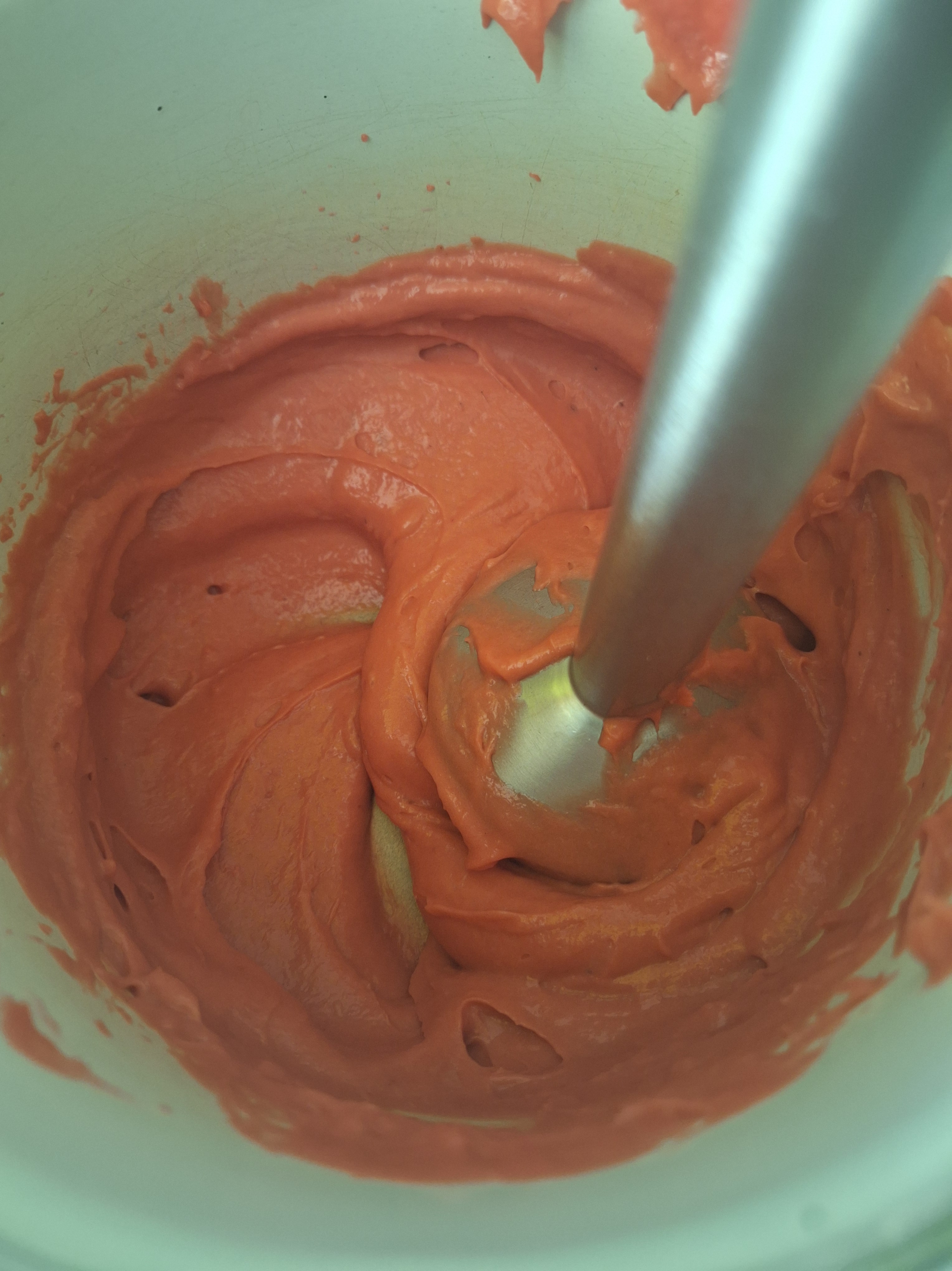 Después de 30 minutos, saca del congelador, tritura con la batidora y congela nuevamente. Repite este proceso unas 6 veces (3 horas) y vierte el helado en un molde de cubitos de hielo.