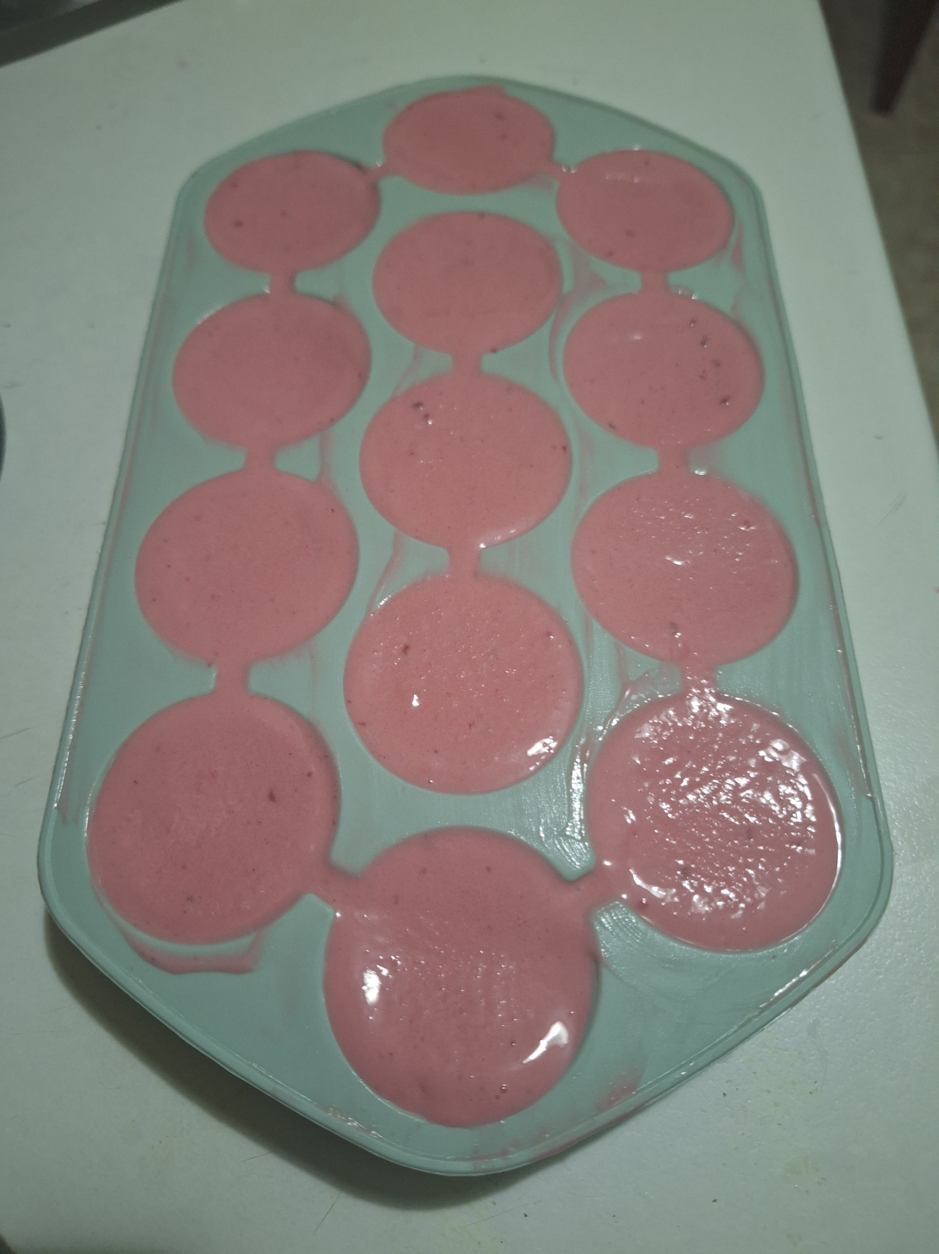 El resultado es un poquito diferente a los anteriores, ya que la textura recuerda más a los polos o paletas, aunque un poco más cremosos. Los hice en formato polo, pero los moldes que tengo son de los verticales, no de los horizontales, así que me costó desmoldarlos y se deshicieron un poco. Entonces decidí hacer unos bombones utilizando una cubitera y quedaron perfectos.