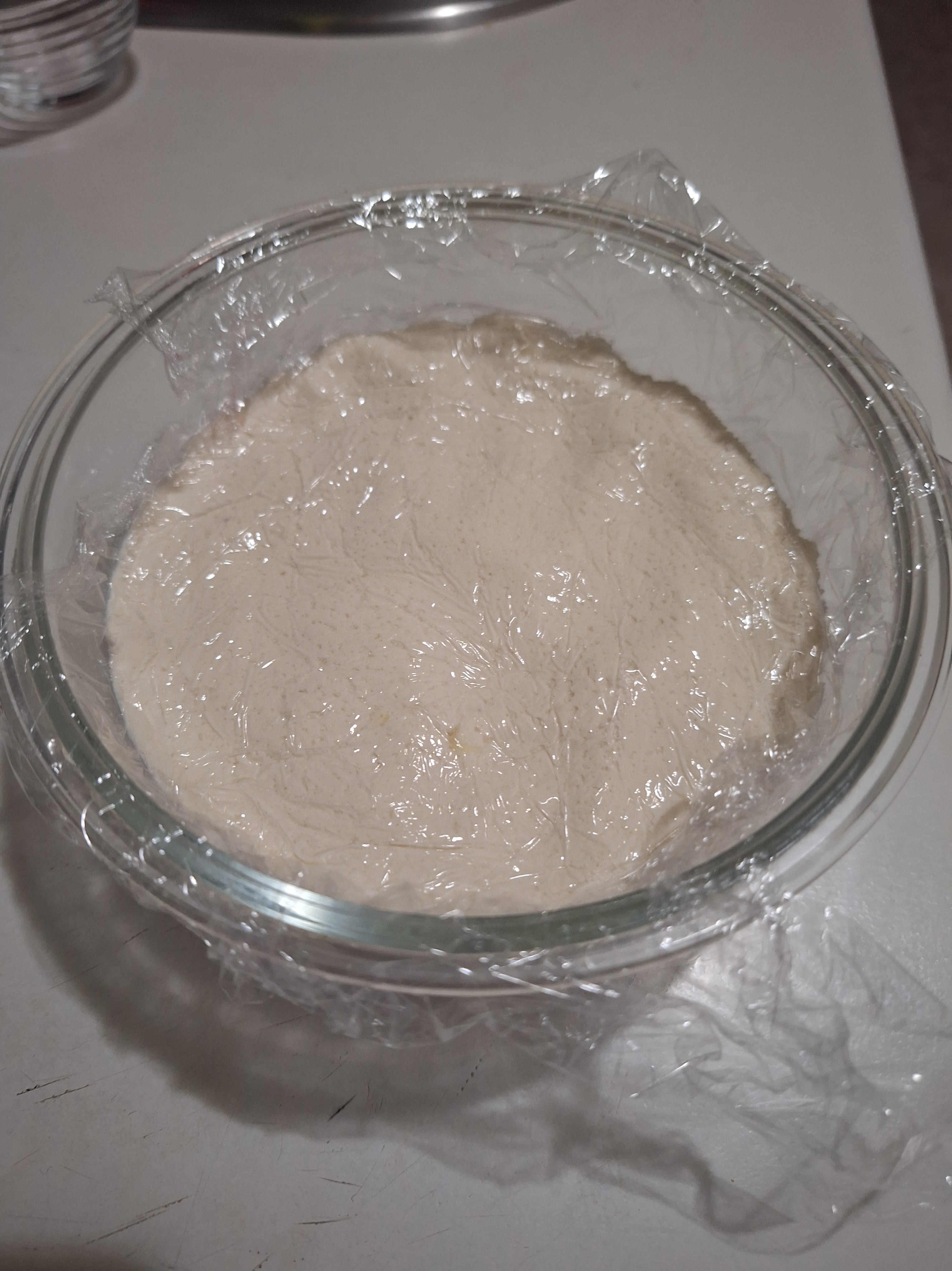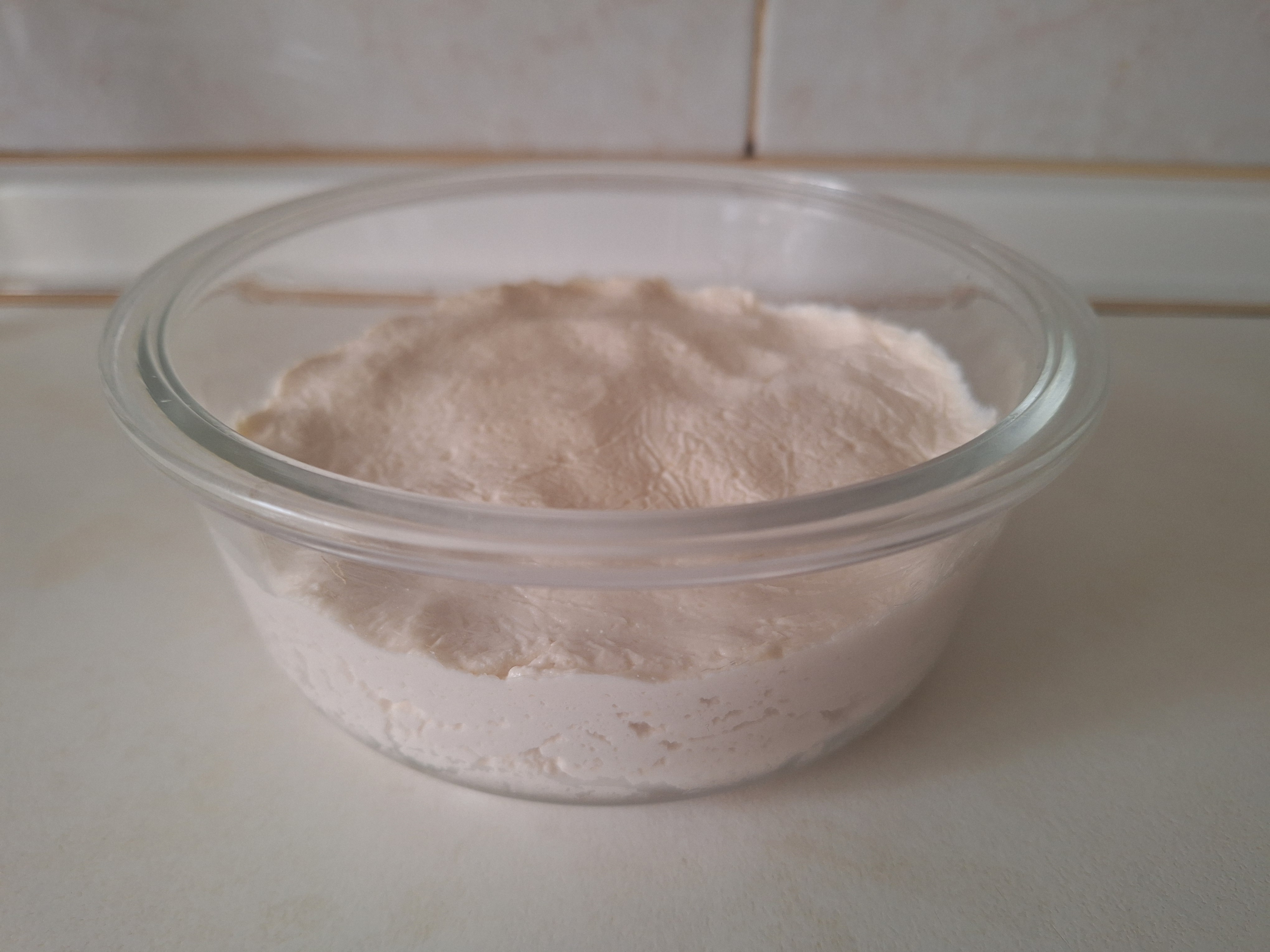 Coloca en un recipiente de cristal, cubre con film (tapando la superficie para que no entre aire) y una tapadera sin llegar a cerrar. Guarda en lugar cálido y reposa 24-48 horas (yo lo dejo dentro de un armario). Pasado este tiempo verás que la masa presenta burbujitas porque ya ha fermentado.