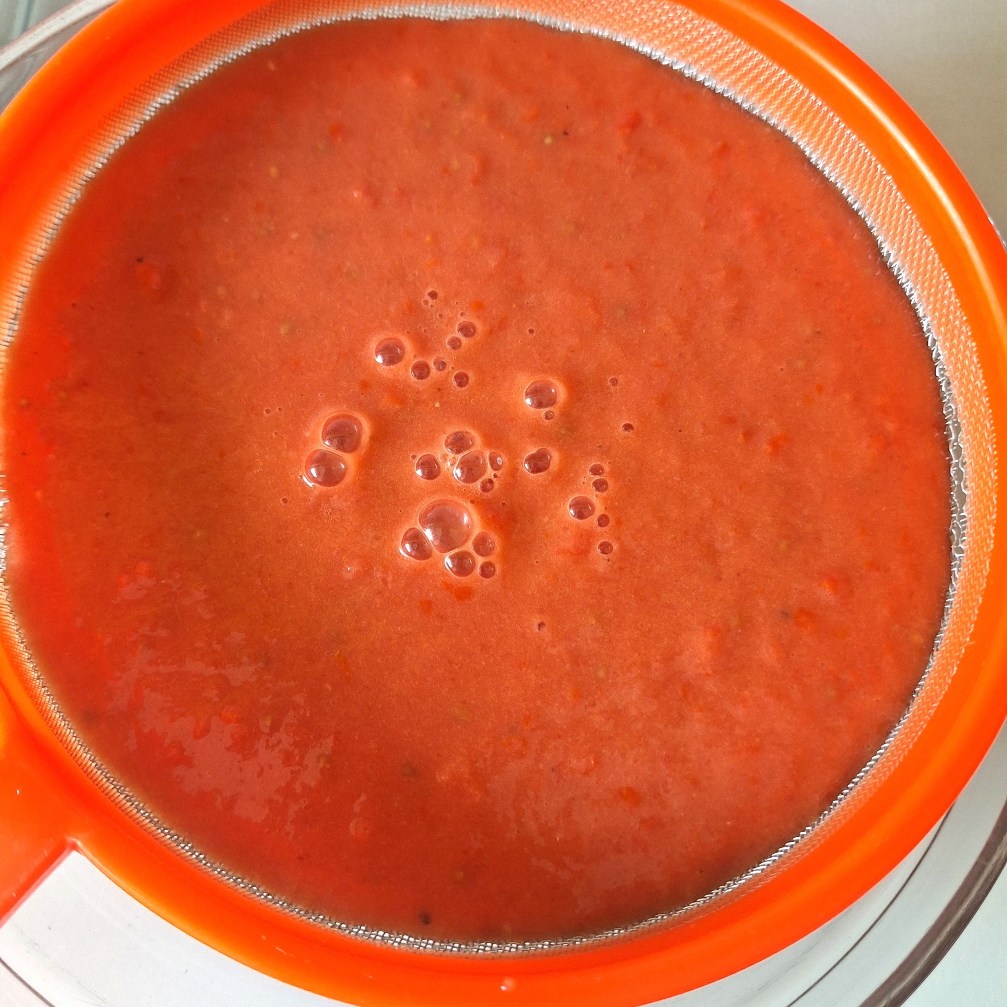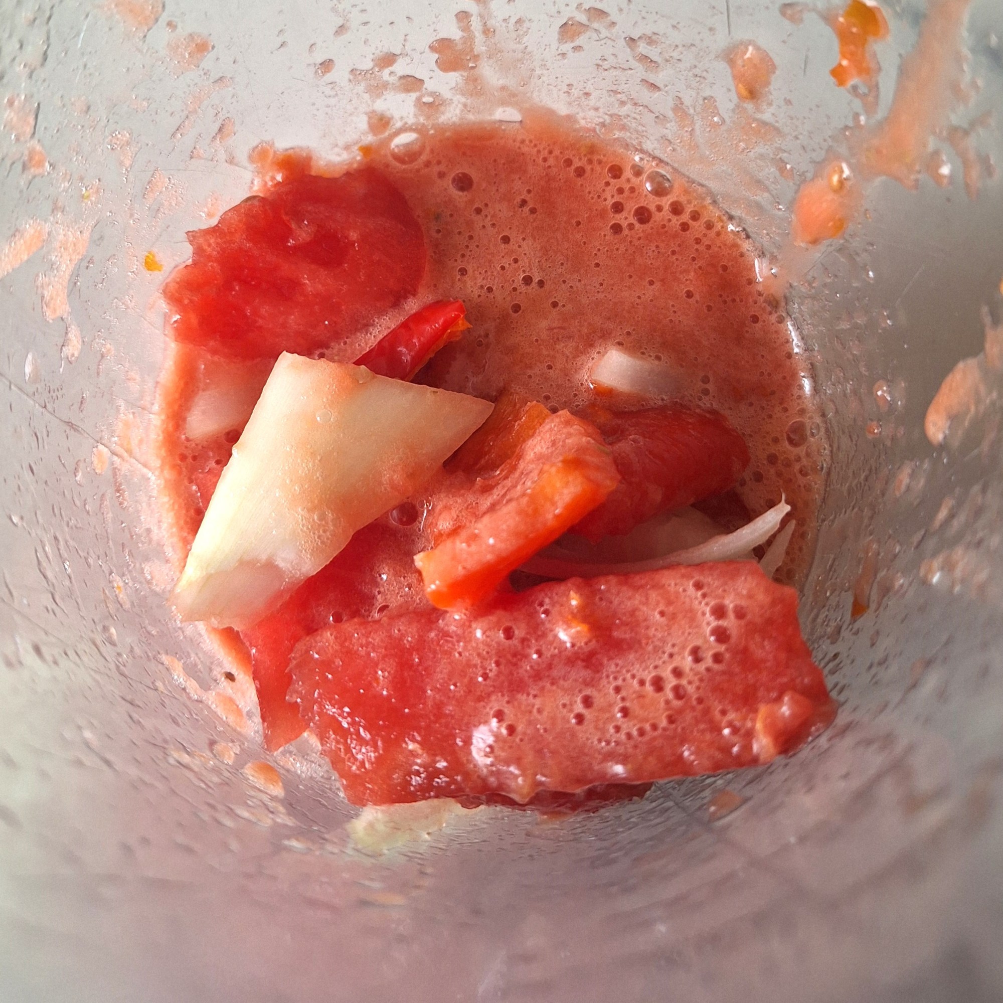 Lava el pimiento y tomates. Trocea todos los ingredientes y tritura hasta obtener una textura suave y homogénea. Añade las especias, el aceite y el vinagre y mezcla todo bien.