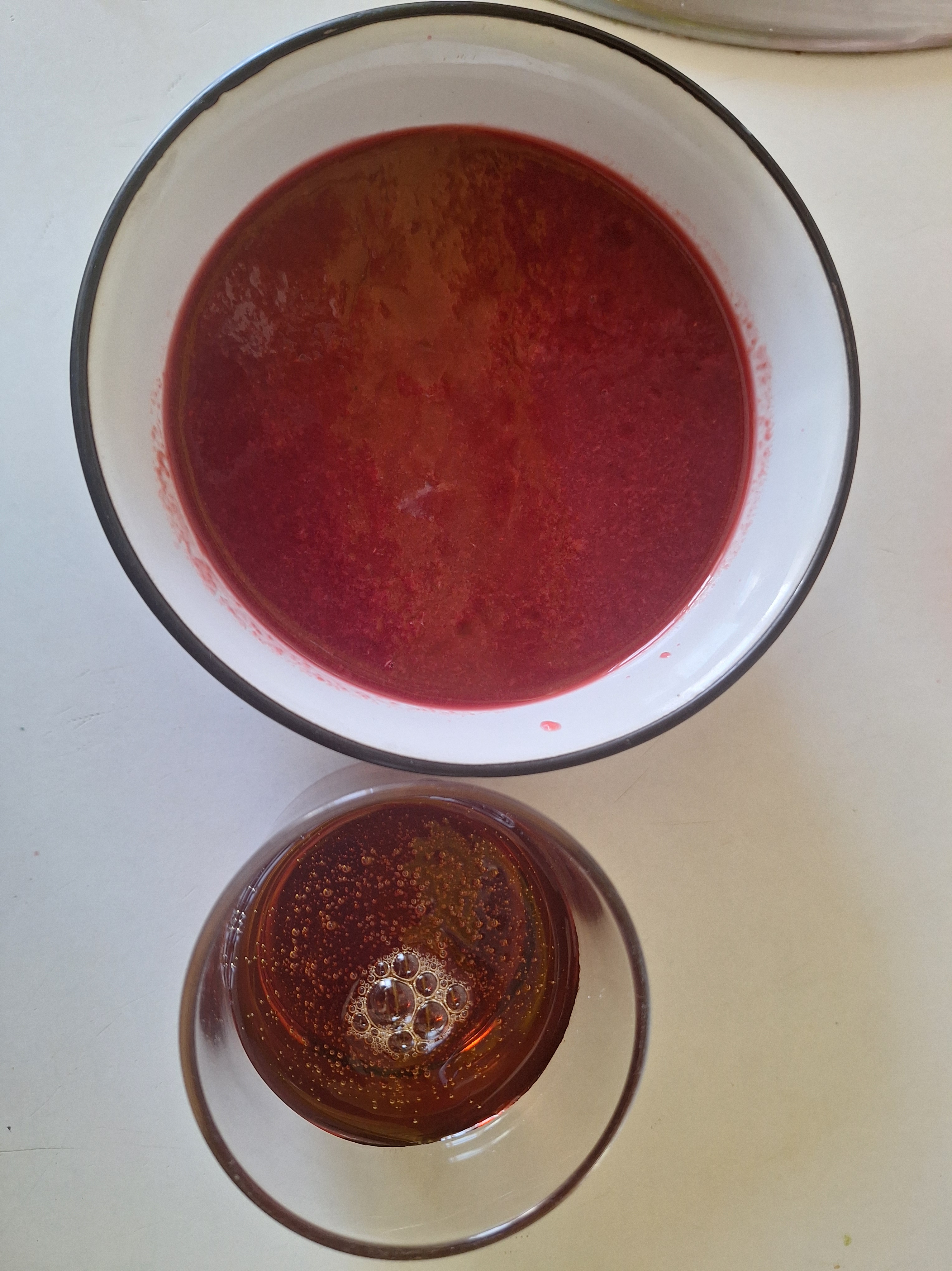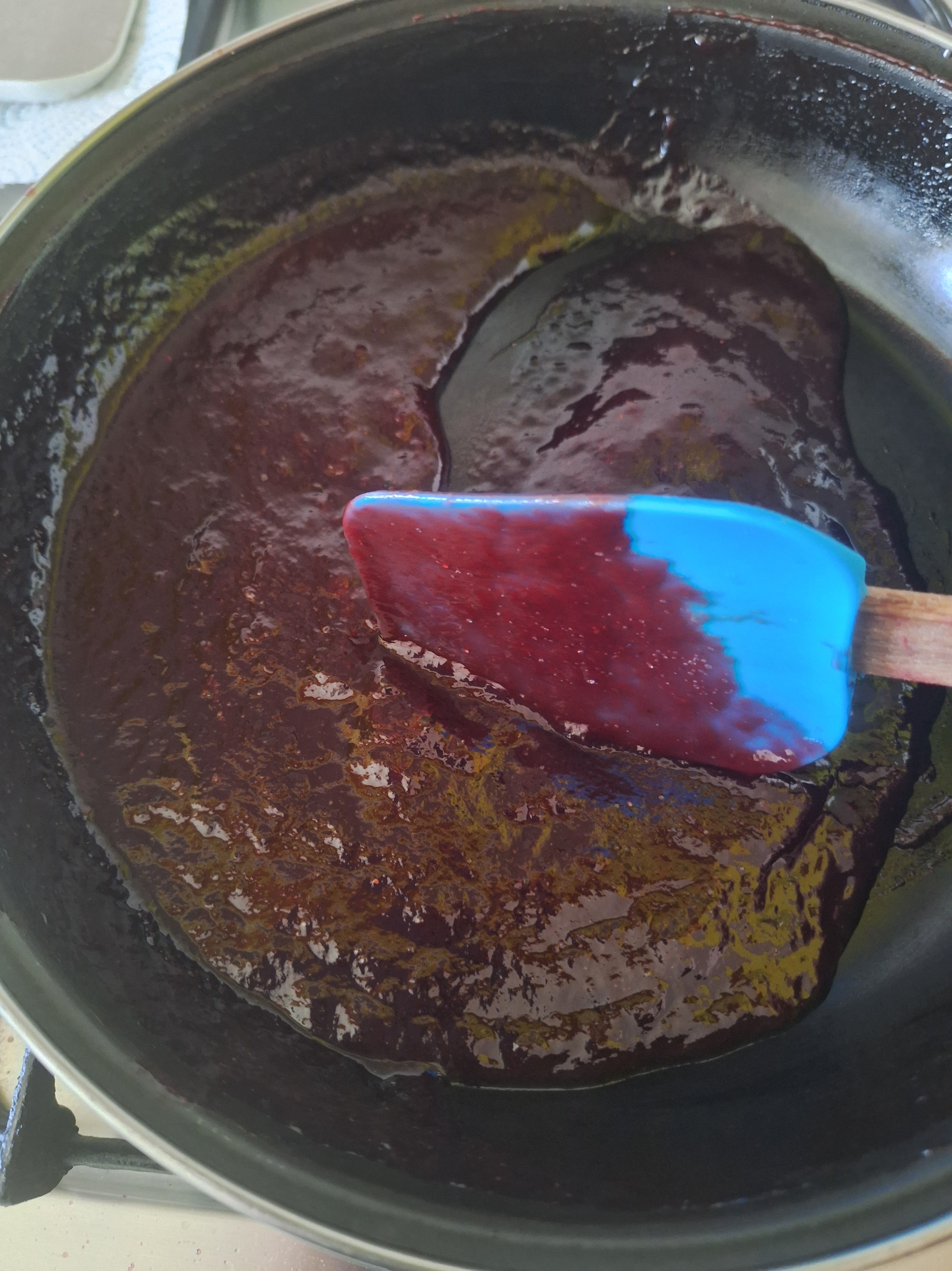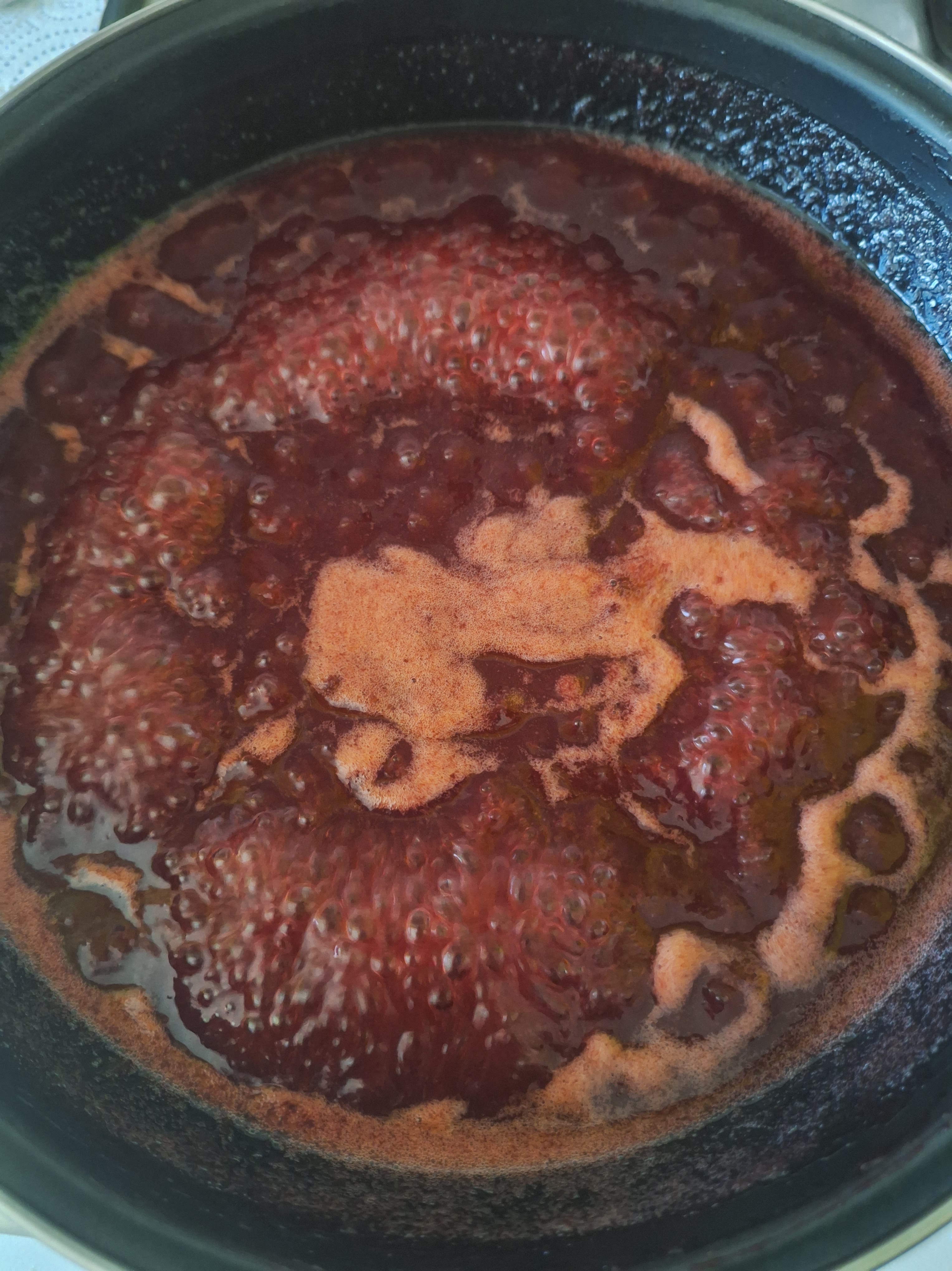 Prepara la mermelada: lava las frambuesas y tritura con la batidora. Cuela para retirar las semillas y obtener un puré. Vierte en una sartén junto con el sirope y el zumo de limón y cocina a fuego medio-bajo hasta que reduzca. Deja enfriar.