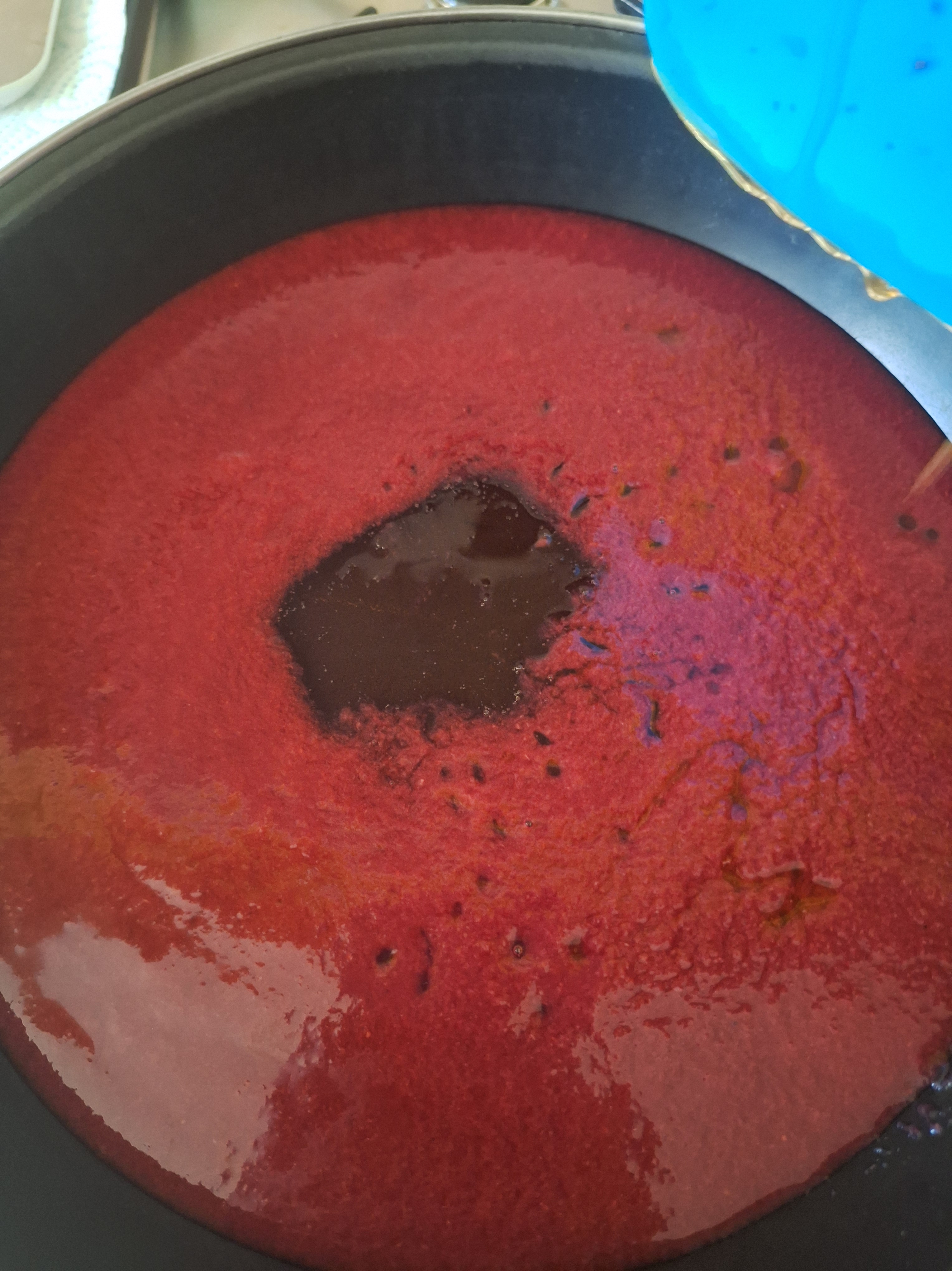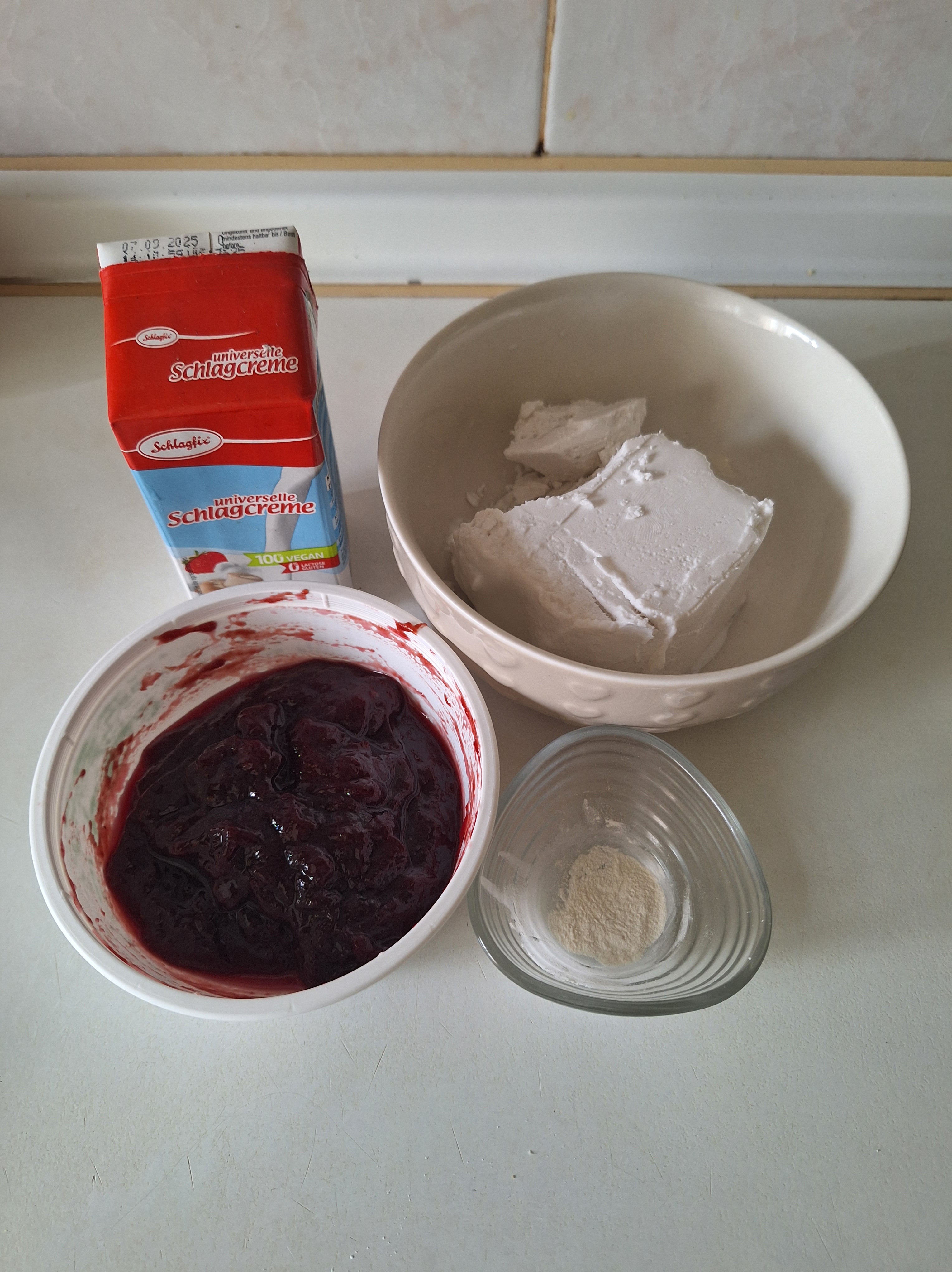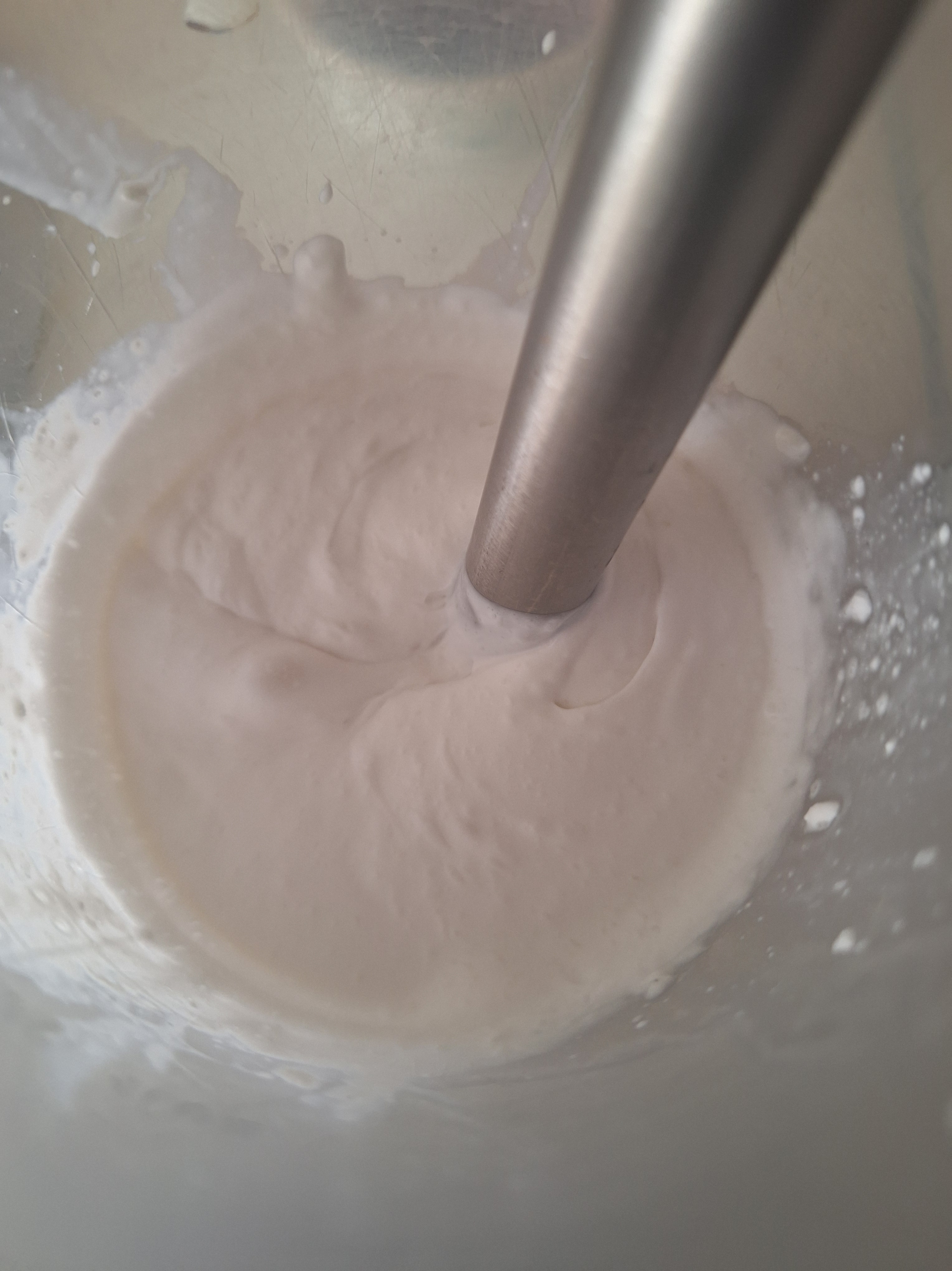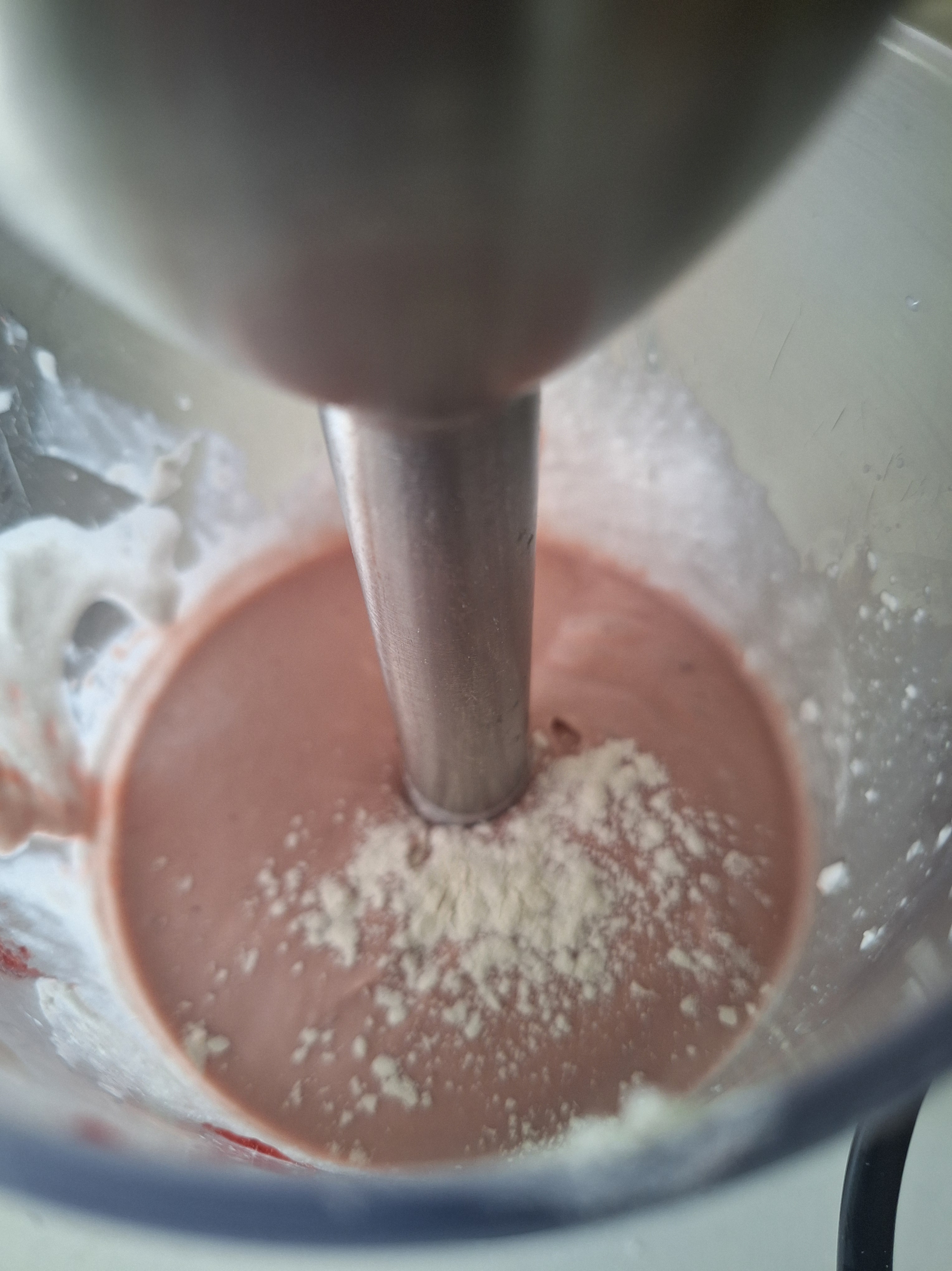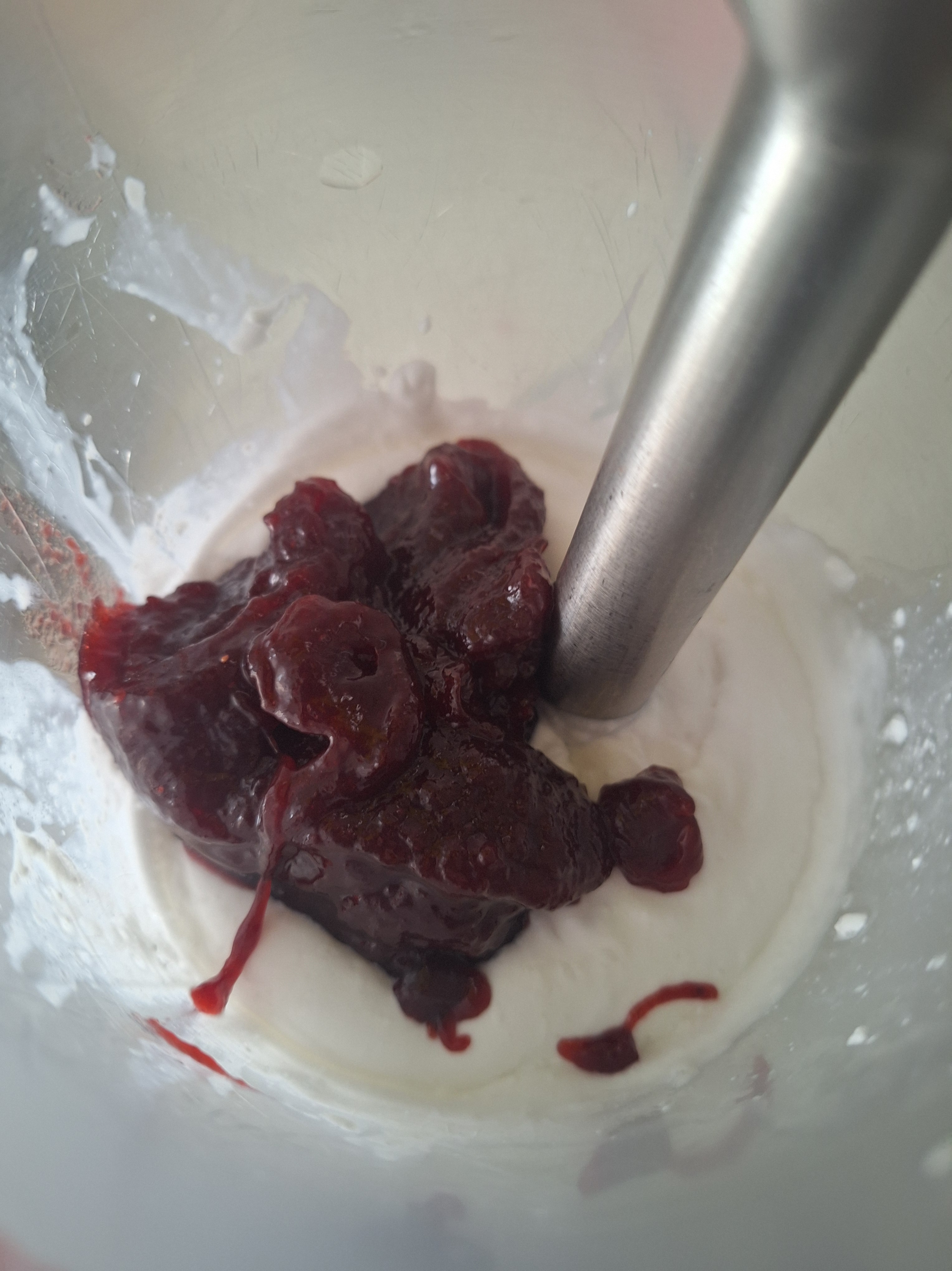 Mezcla la nata con la leche de coco con la batidora. Agrega la mermelada de frambuesa y la goma xantana y tritura todo muy bien.