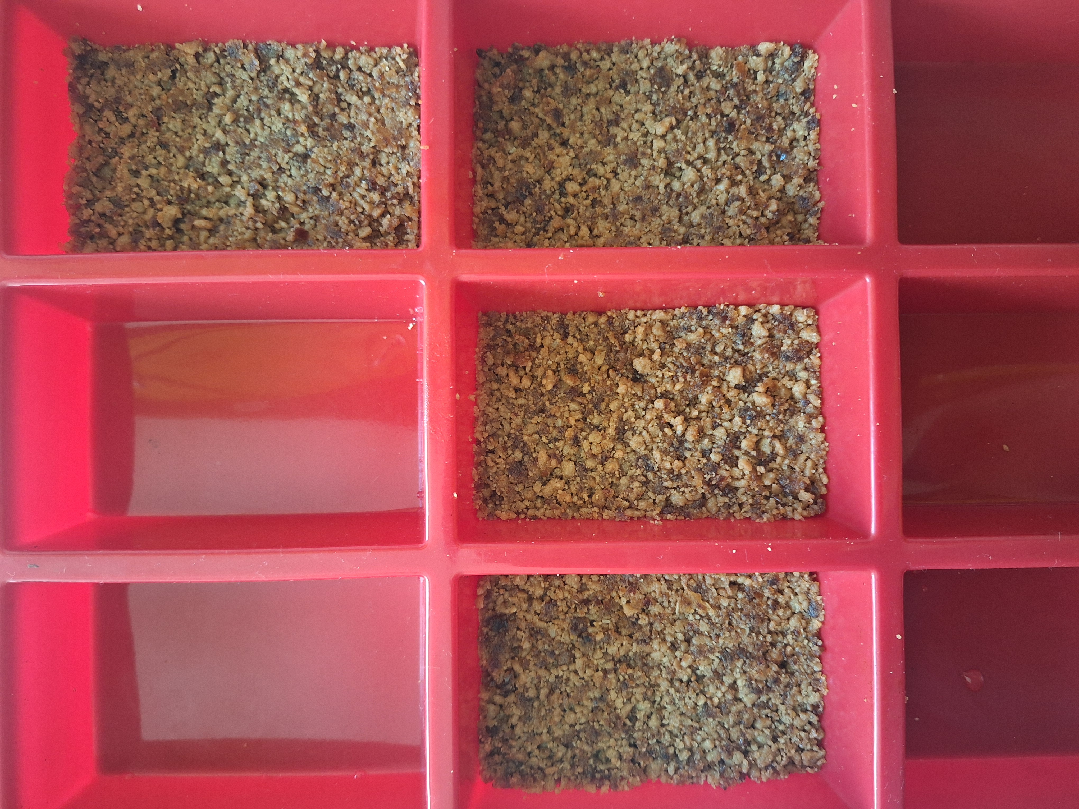 Tritura las galletas junto con el dátil y el aceite de coco hasta conseguir una masa homogénea y manejable. Desmolda los helados y guarda en el congelador. En el mismo molde coloca una cucharada de galletas y aplasta con una cuchara para que quede compacto. Guarda en el frigo hasta que endurezca.