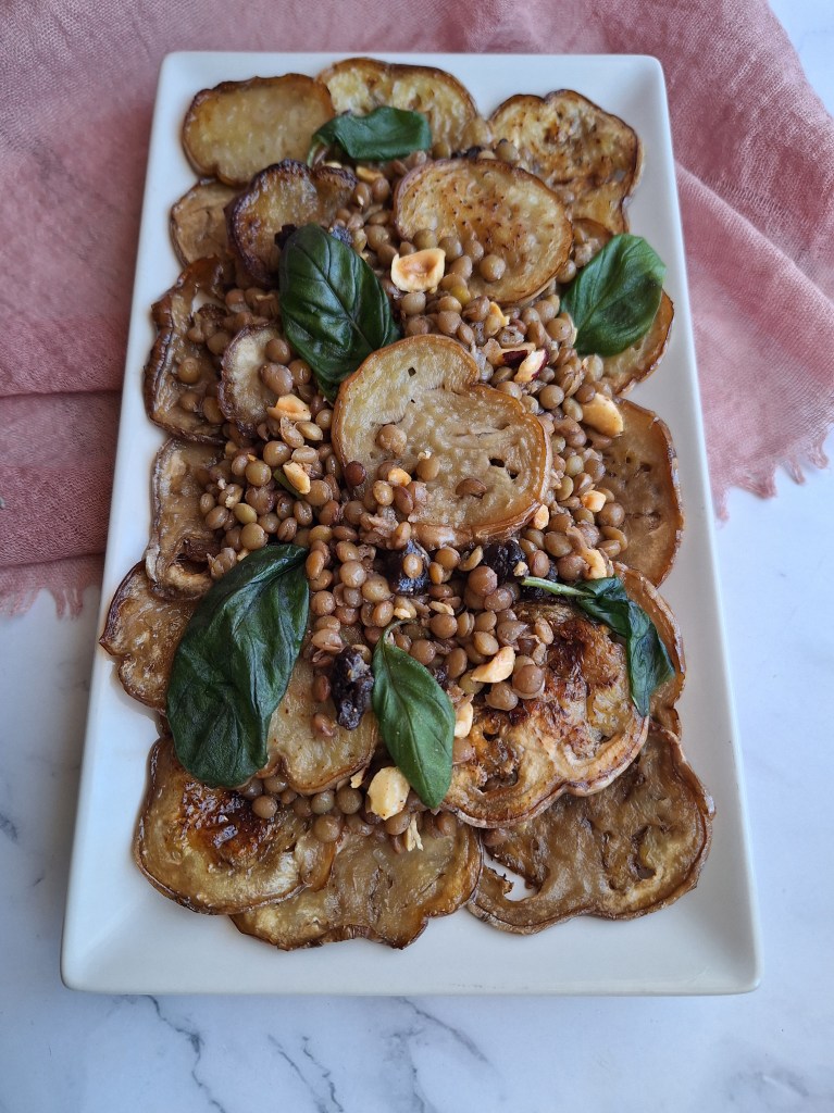 Emplata: coloca rodajas de berenjena en la base y sobre ella las lentejas aliñadas.