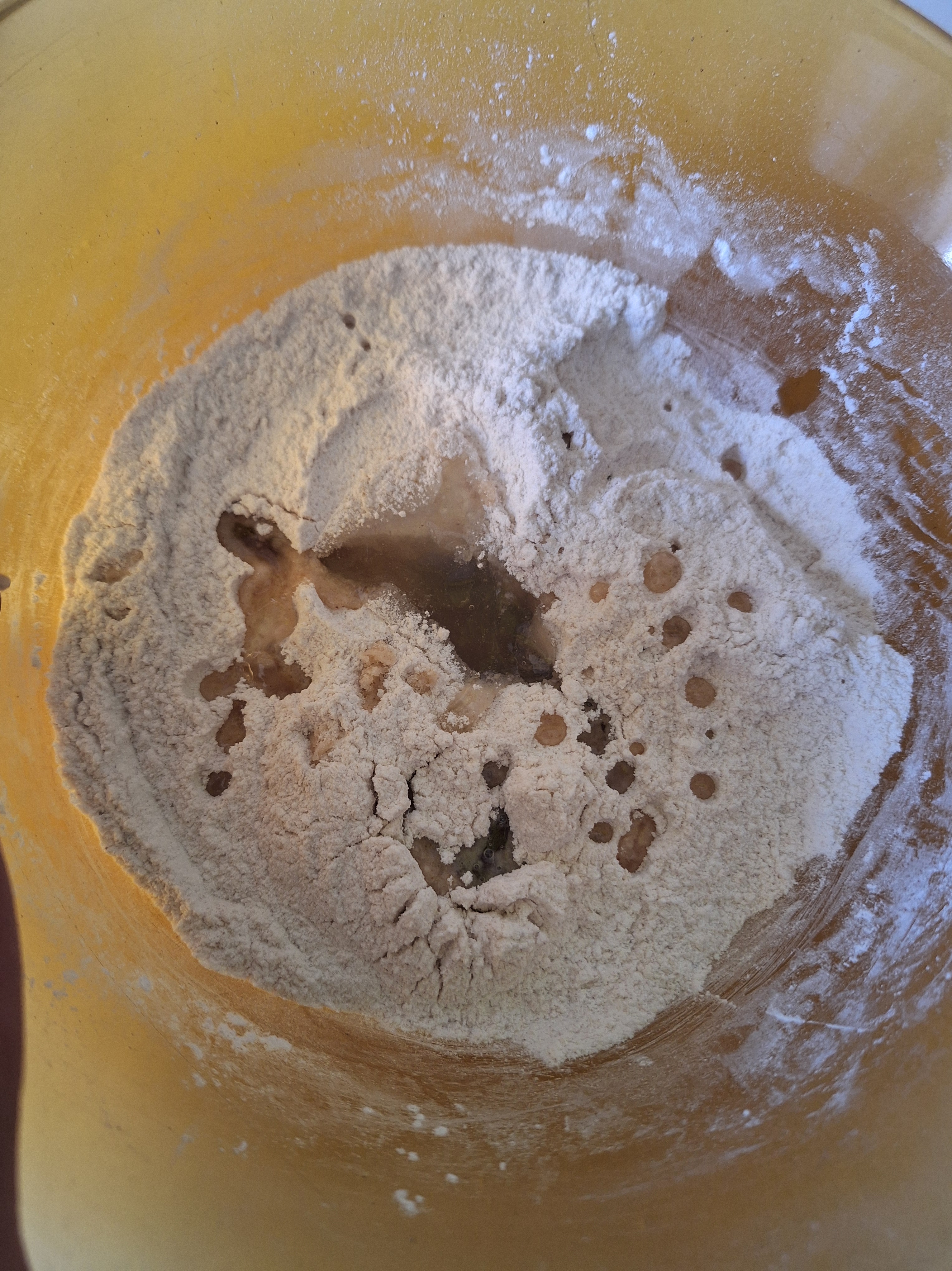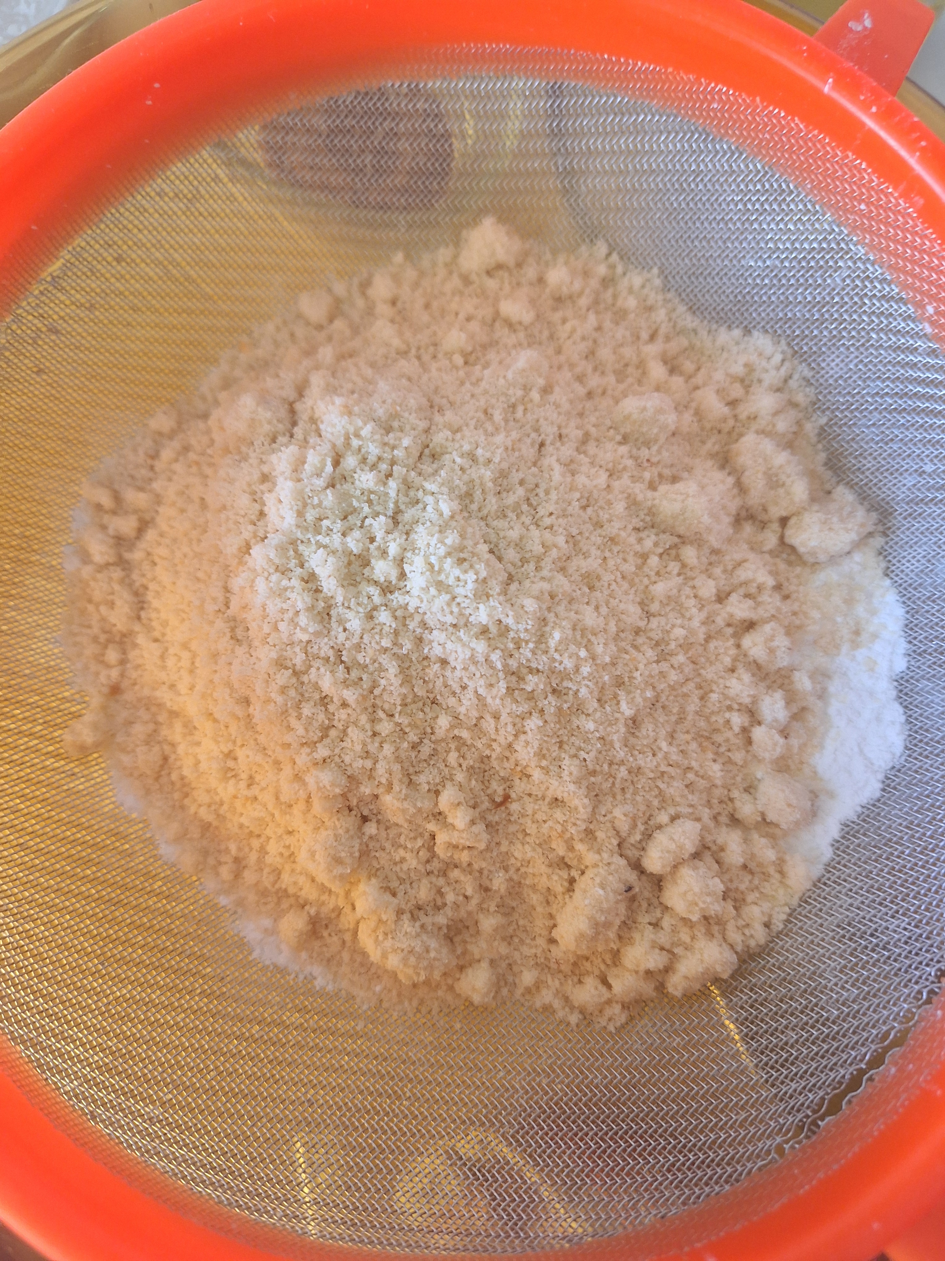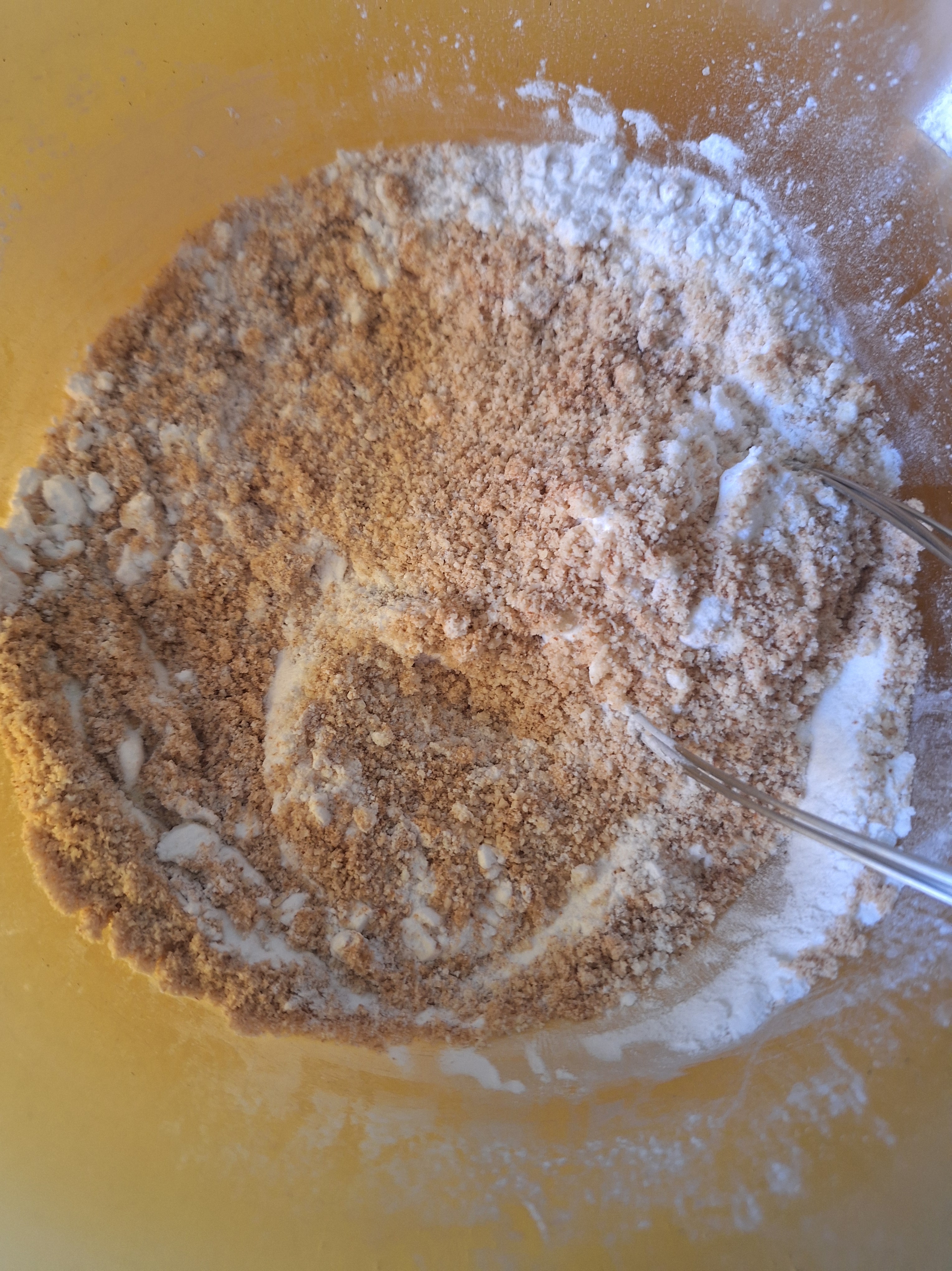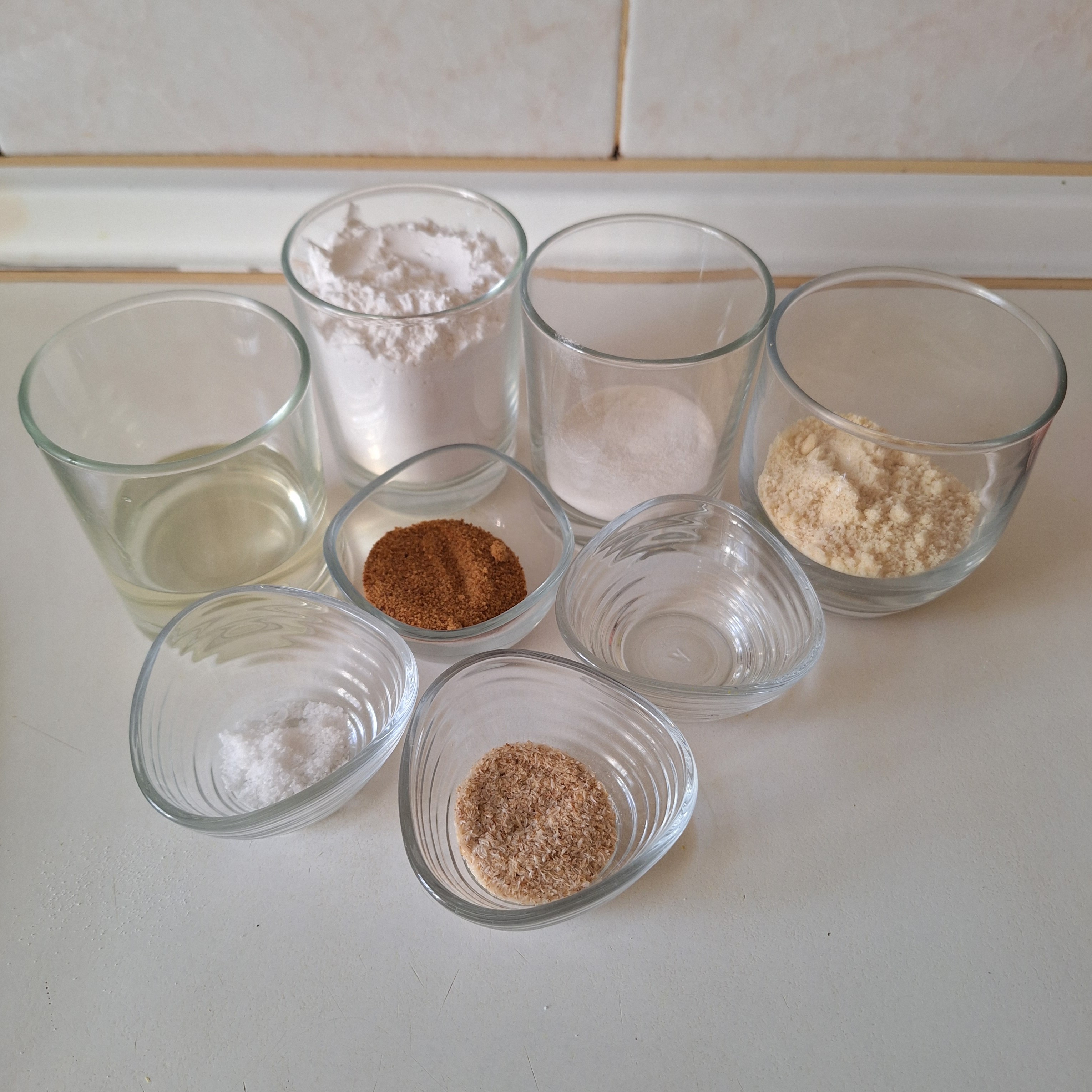 Guarda el aceite de coco y el agua en el congelador hasta el momento de uso. Prepara la base: tamiza el almidón y harinas y añade el azúcar de coco, el psyllium y la sal. Mezcla bien.