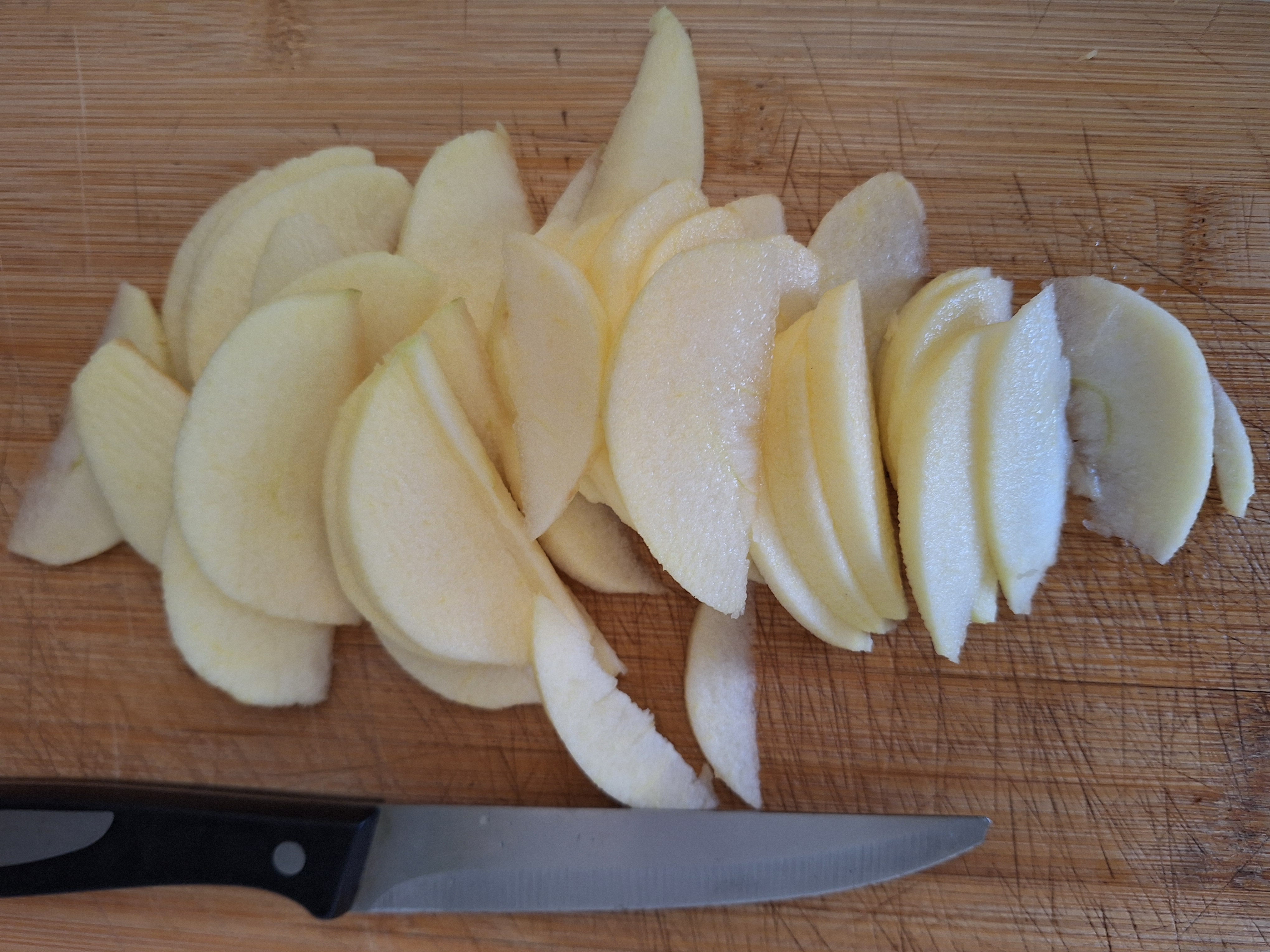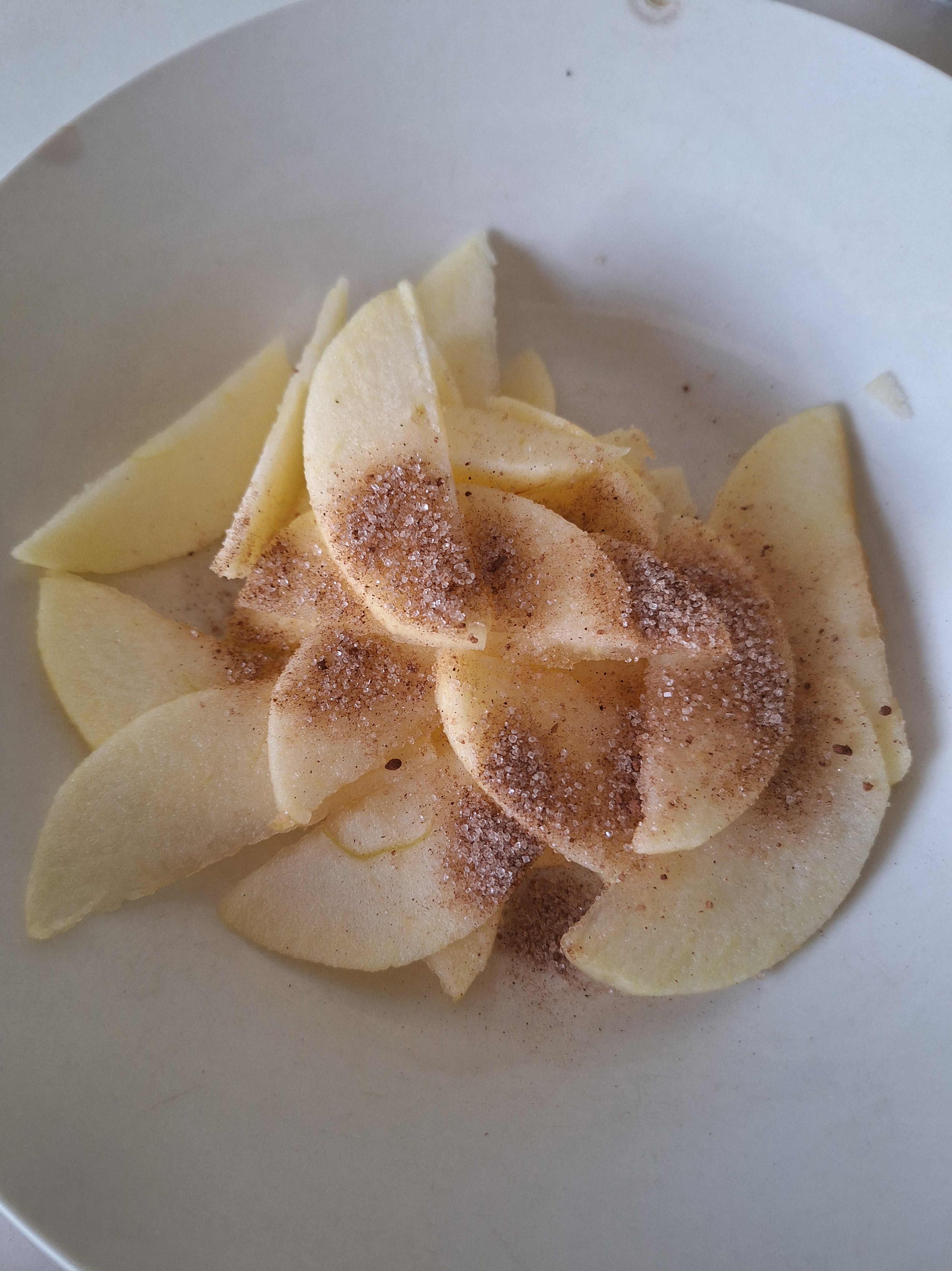 Saca el corazón de la manzana, pela y corta en láminas finas. Coloca en un recipiente con una mezcla de azúcar de coco y canela y mezcla bien.