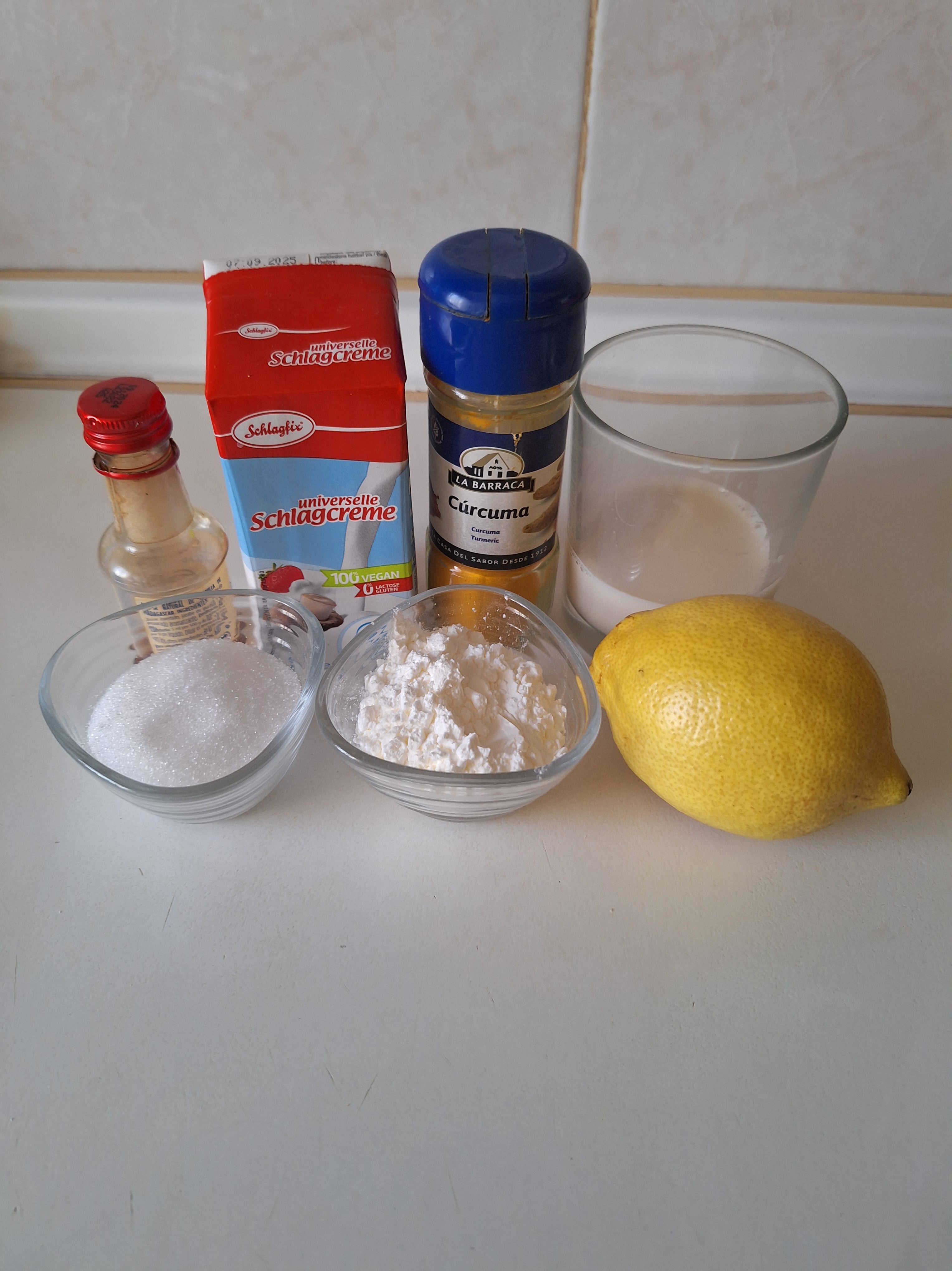 Para la crema, la leche de almendras que queda mejor que la de arroz porque es más densa. Podéis prescindir de la cúrcuma, ya que sólo da color. Pero si la utilizáis no os paséis, ya que quedará un resultado amarillo eléctrico.