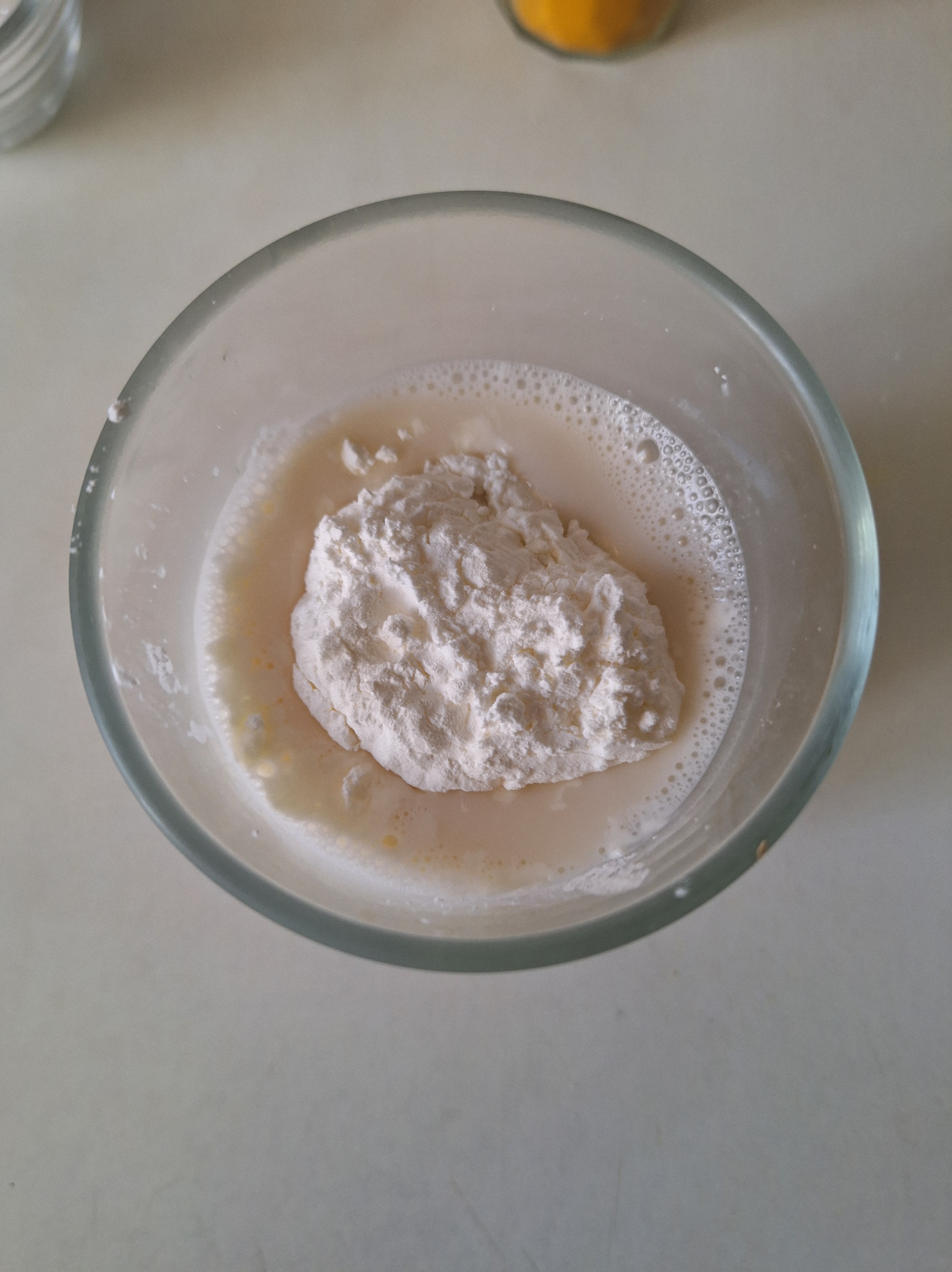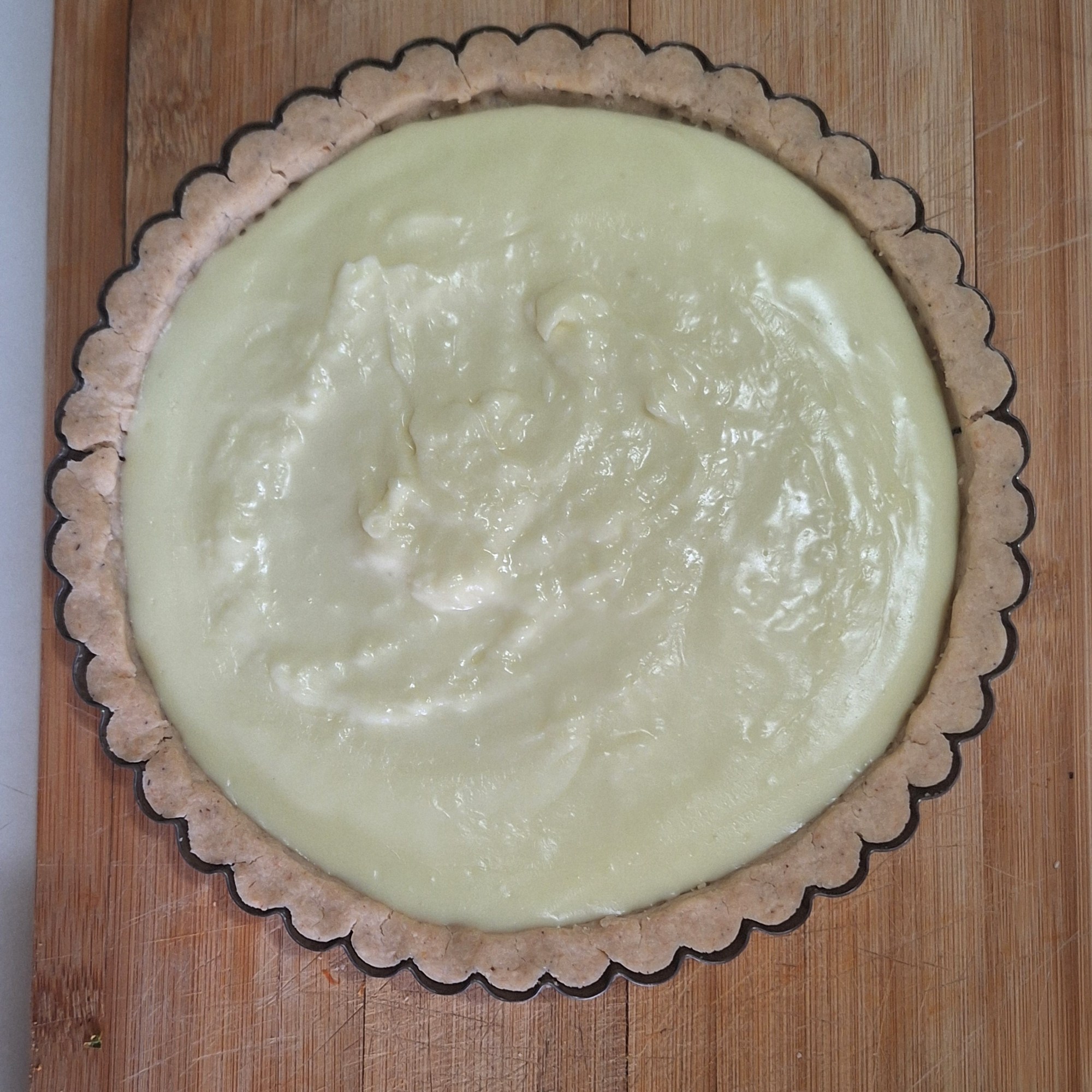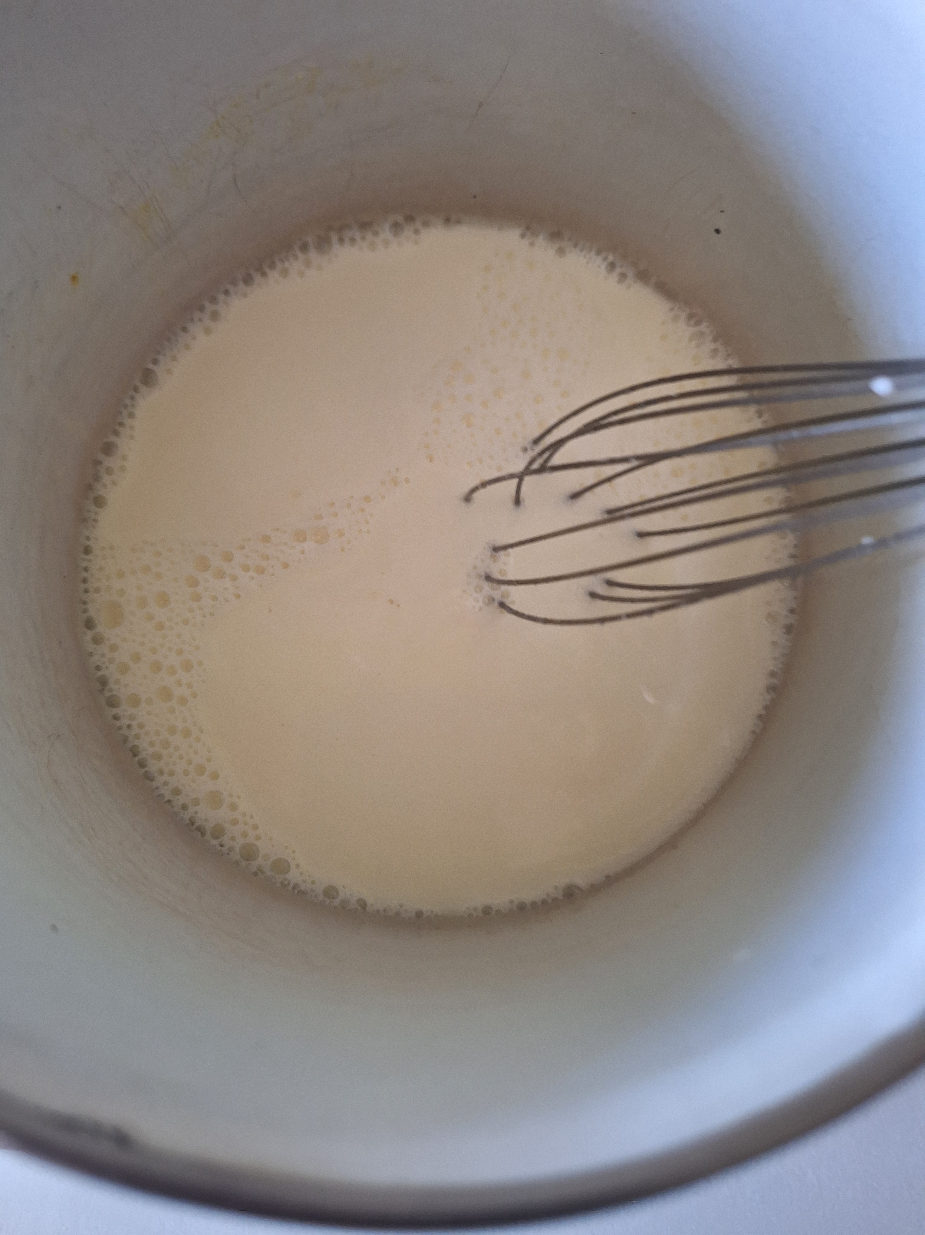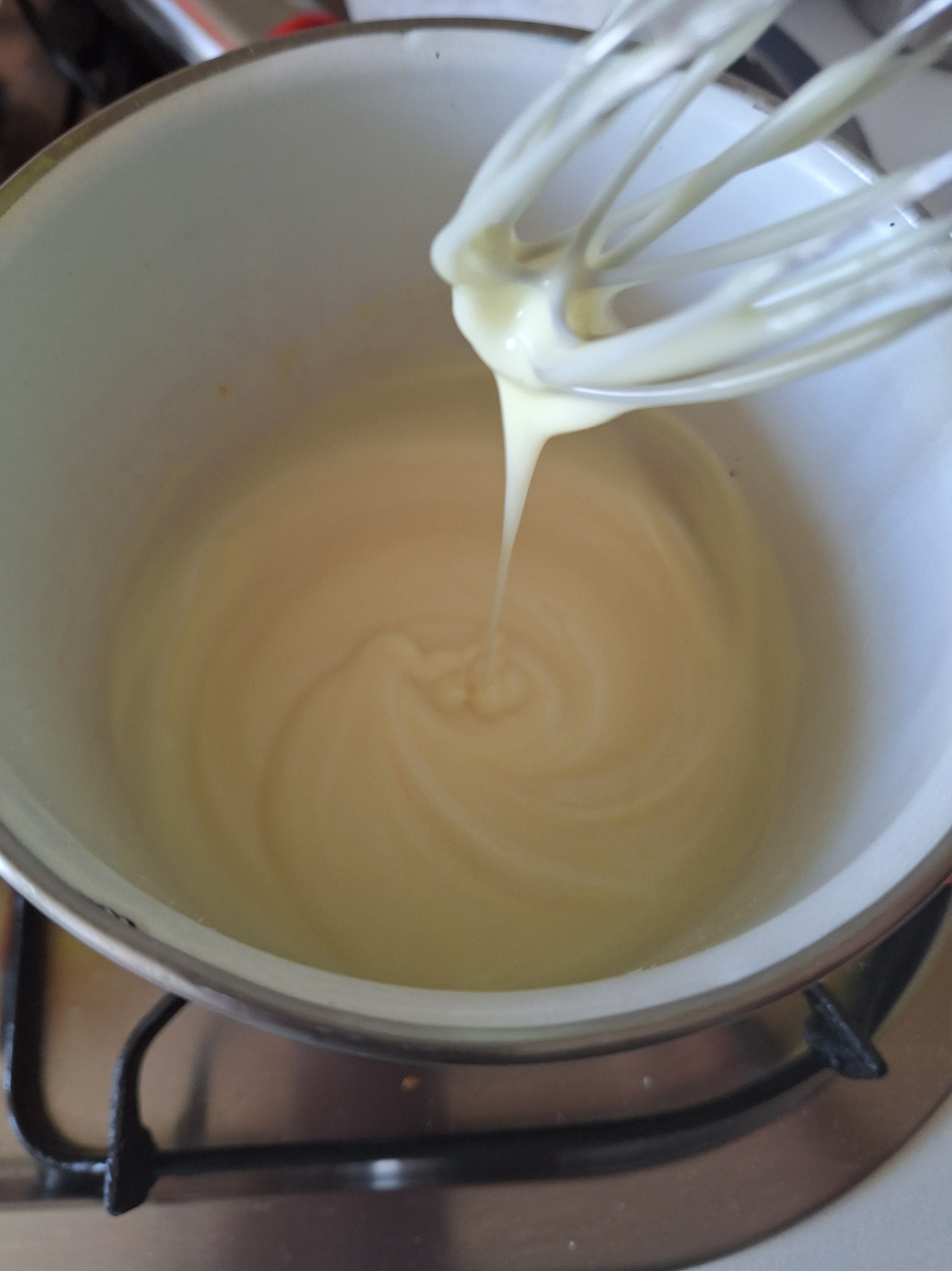 Prepara la crema: disuelve la maicena en la leche fría. Vierte la nata en un cazo junto con el eritritol, la esencia de vainilla, la cúrcuma (muy poquita) y las gotas de limón y calienta hasta que empiece a hervir. Añade la maicena y remueve hasta que adquiera textura de natillas.